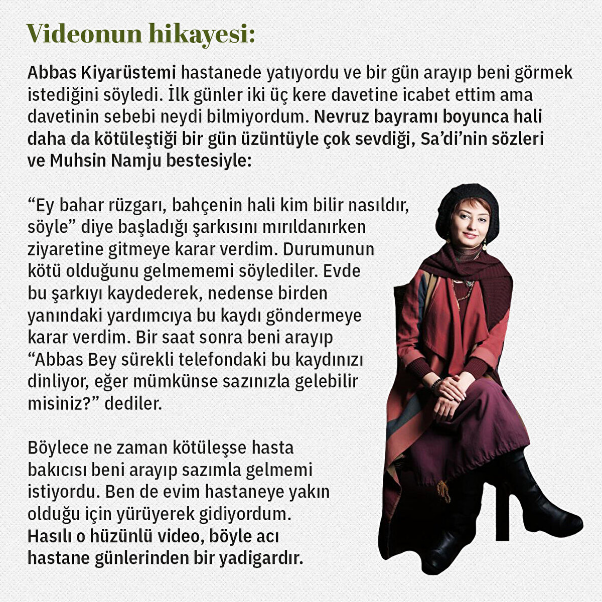 Çoğumuz onu bir hastane odasındaki Abbas Kiyarüstemi'nin başucunda, Namcu'nun bestelediği Sa'dî'nin sözlerini okuduğu videoyla tanıdık.