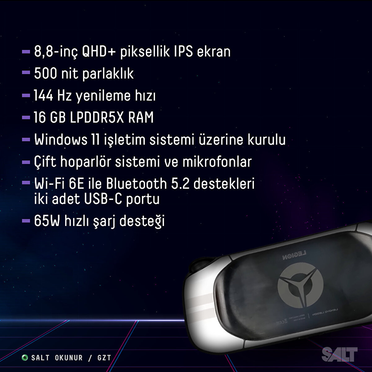 İşte tüm detaylar; 8,8-inç QHD+ piksellik IPS ekran500 nit parlaklık144 Hz yenileme hızı16 GB LPDDR5X RAMWindows 11 işletim sistemi üzerine kuruluÇift hoparlör sistemi ve mikrofonlarWi-Fi 6E ile Bluetooth 5.2 destekleriiki adet USB-C portu65W hızlı şarj desteği