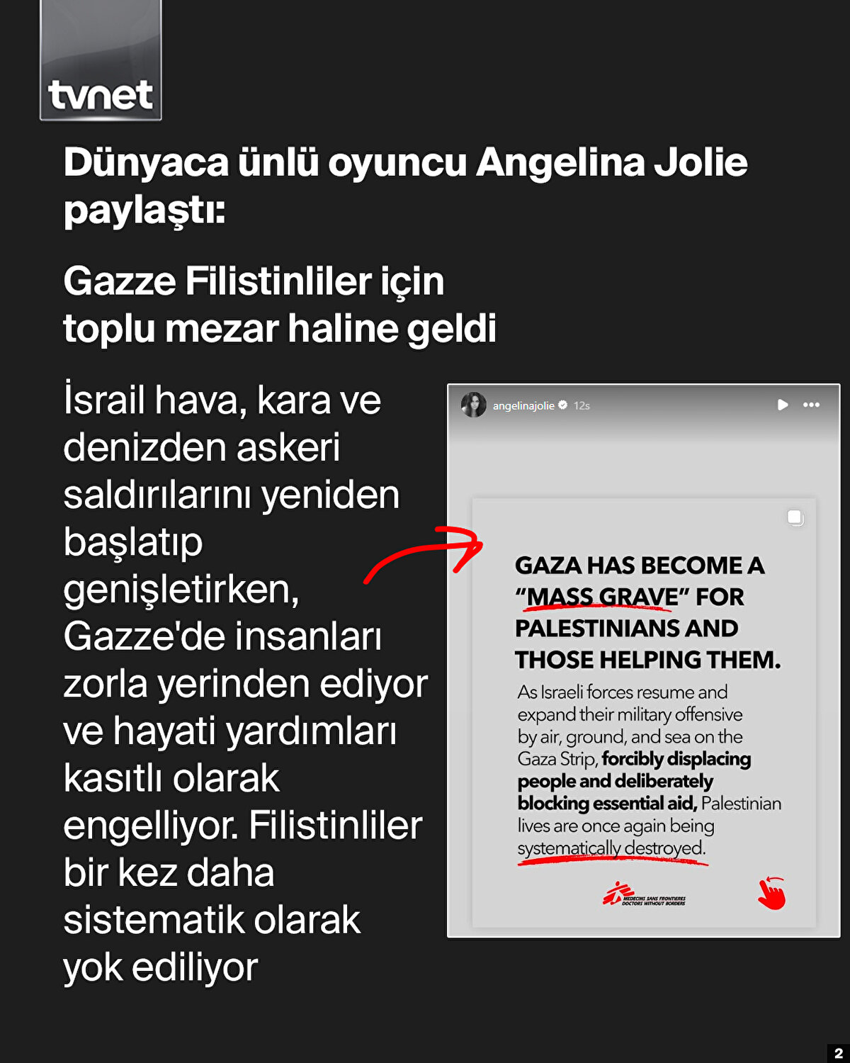 ABD'li ünlü oyuncu Angelina Jolie Instagram hesabından Sınır Tanımayan Doktorların “Gazze, Filistinliler ve onlara yardıma gelenler için toplu mezara dönüştü” içerikli gönderisini paylaştı. Raporda işgalci İsrail'in ölümcül saldırılarının Gazze'deki insani yardım ve sağlık çalışanlarının güvenliğine karşı açık tehdit oluşturduğu belirtildi.