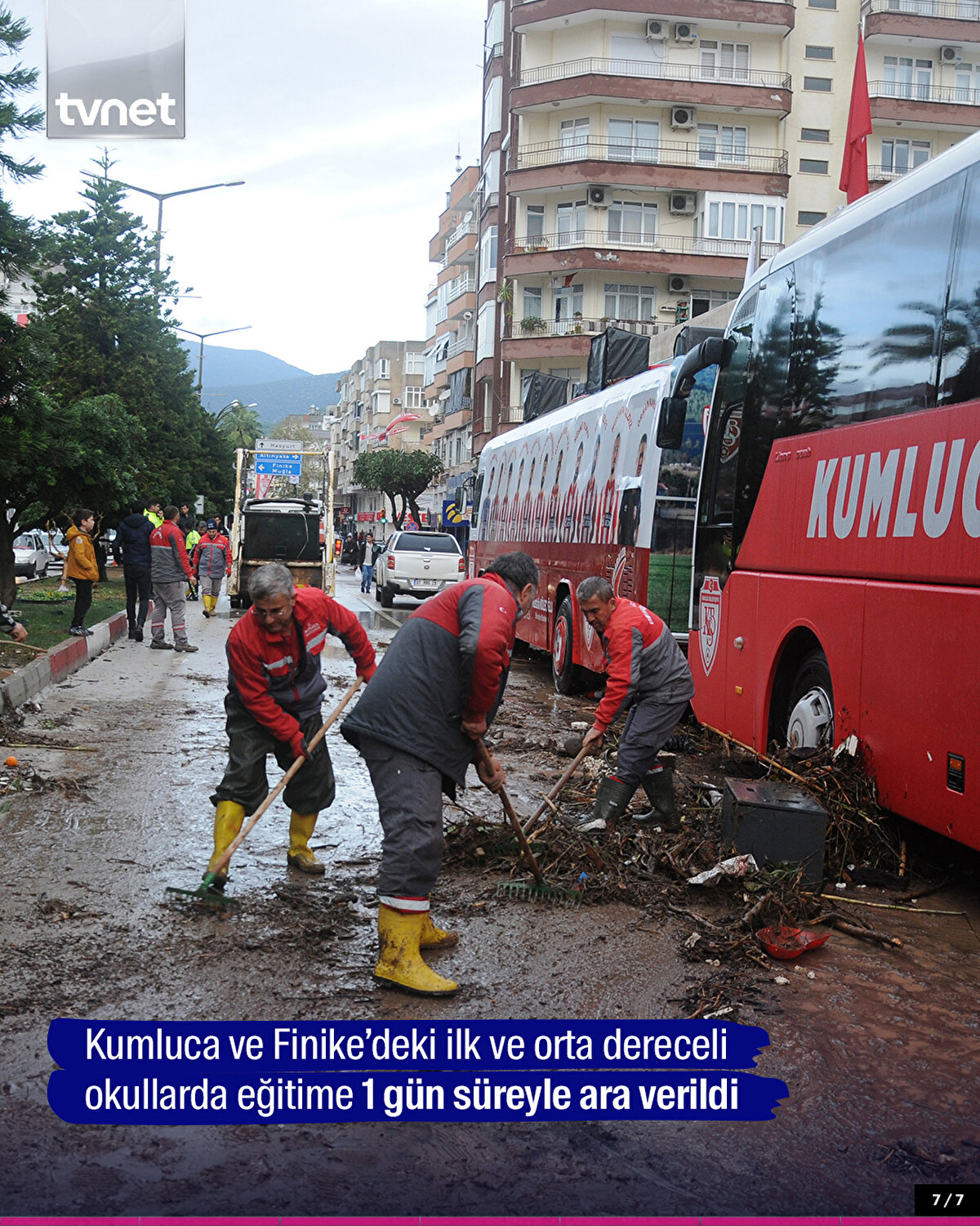 Antalya'nın Kumluca ve Finike ilçelerinde kuvvetli yağış sebebiyle dereler taştı. Çok sayıda ev ve iş yerini su bastı. İlçelerdeki ilk ve orta dereceli okullarda eğitime 1 gün süreyle ara verildi.