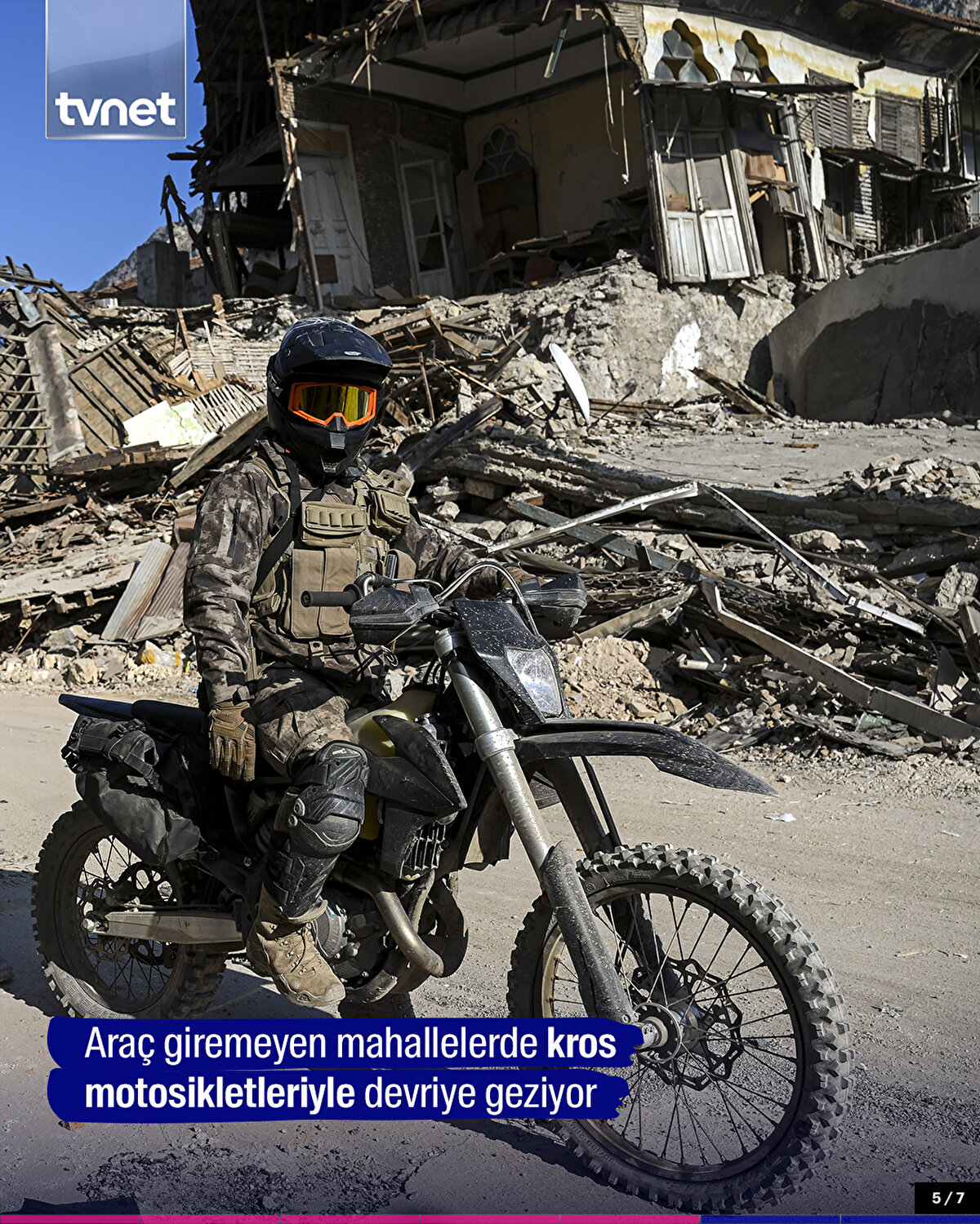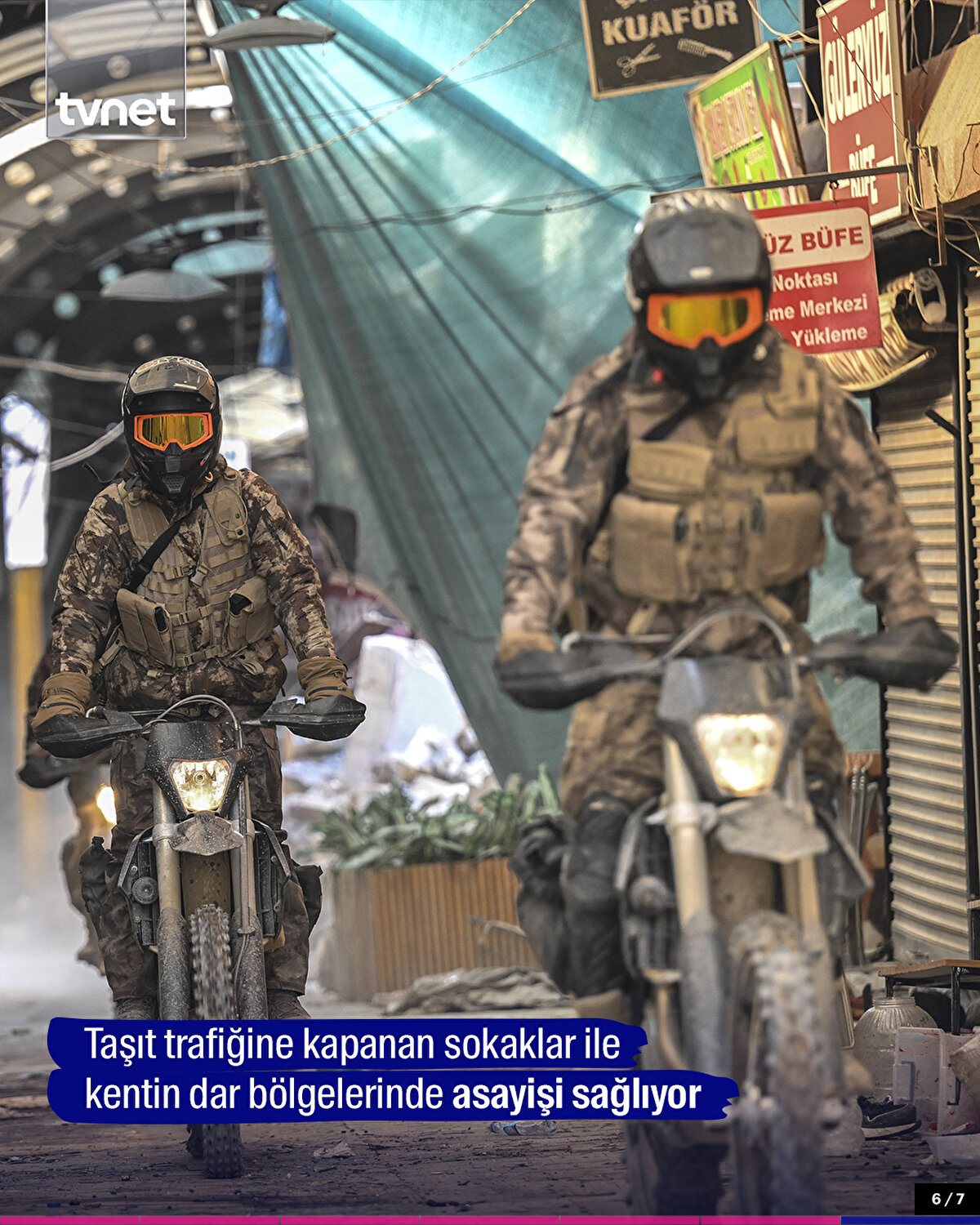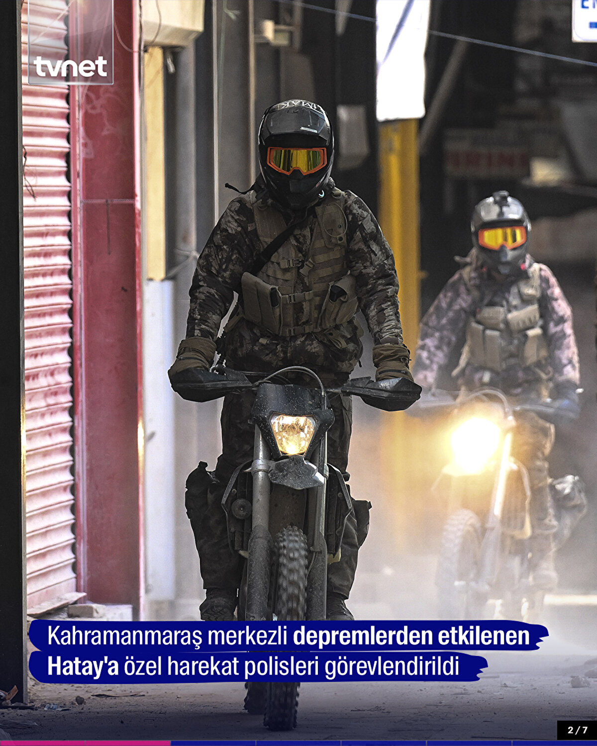 Hatay'da binaların yıkılması nedeniyle taşıt trafiğine kapanan sokakların asayişini kros motosikletli özel harekat polisleri sağlıyor.