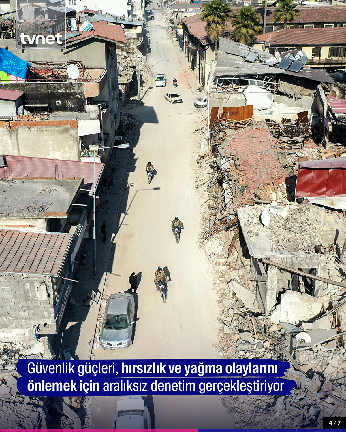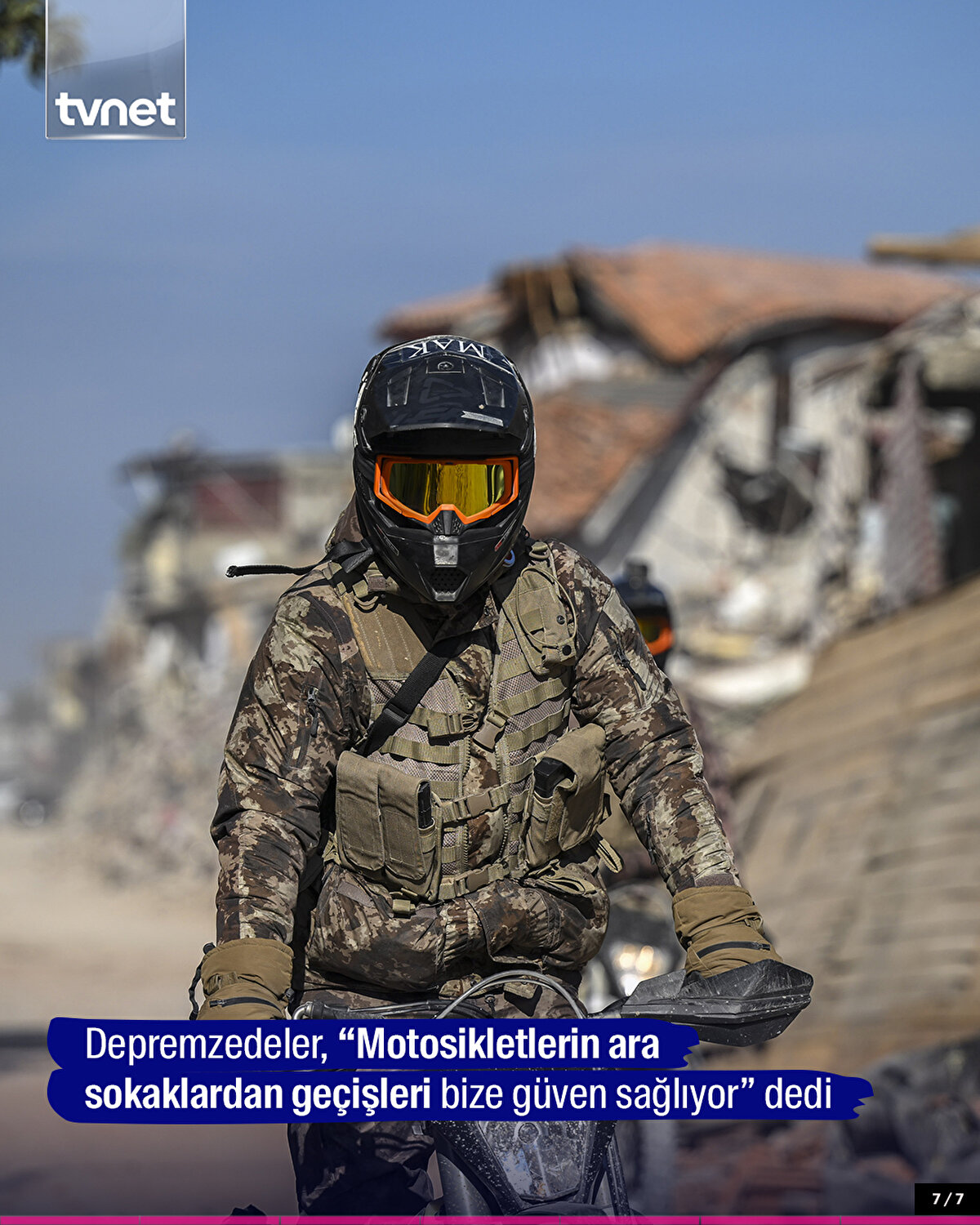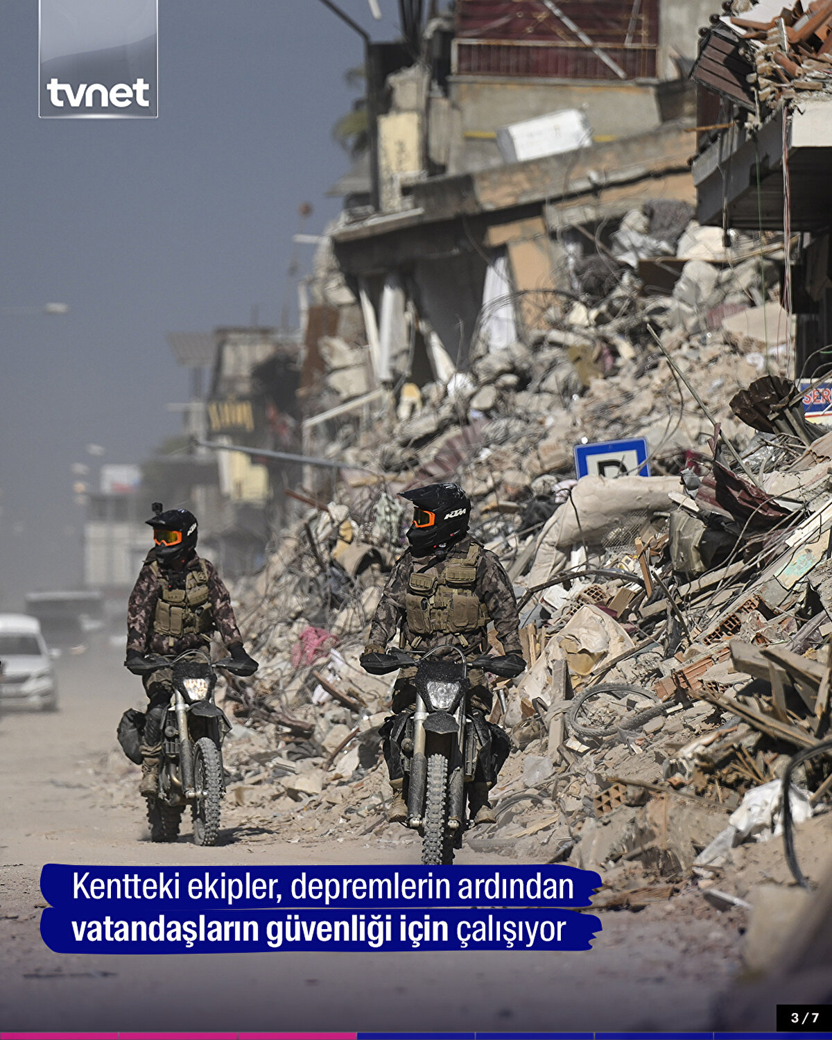 Hatay'da binaların yıkılması nedeniyle taşıt trafiğine kapanan sokakların asayişini kros motosikletli özel harekat polisleri sağlıyor.