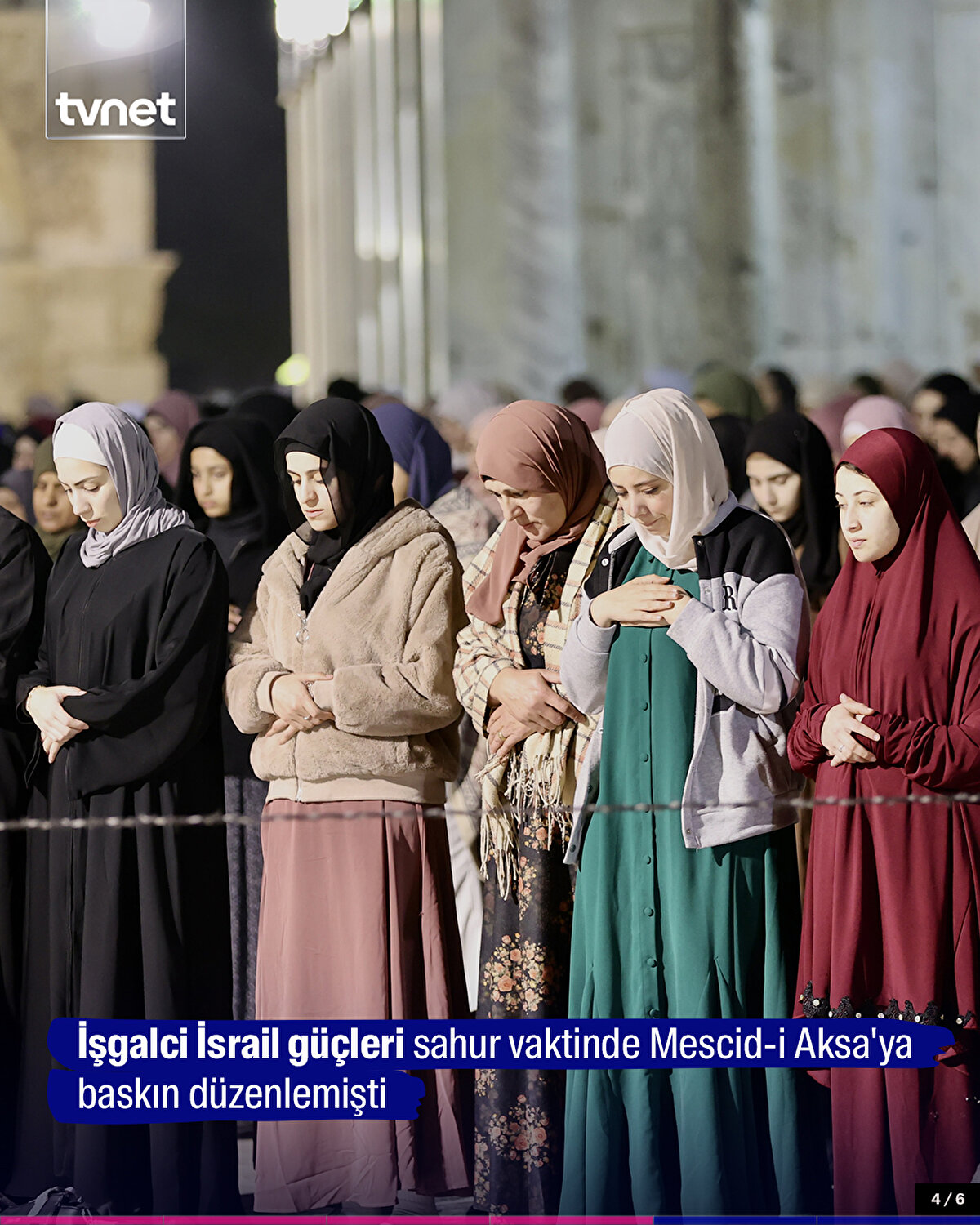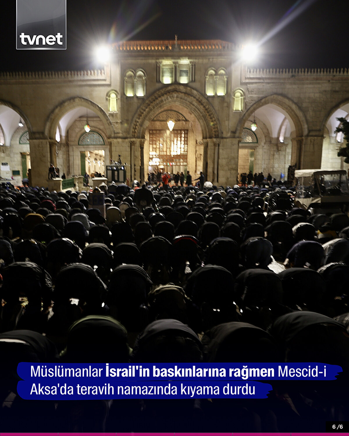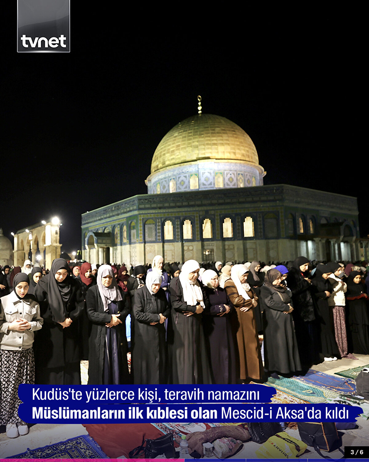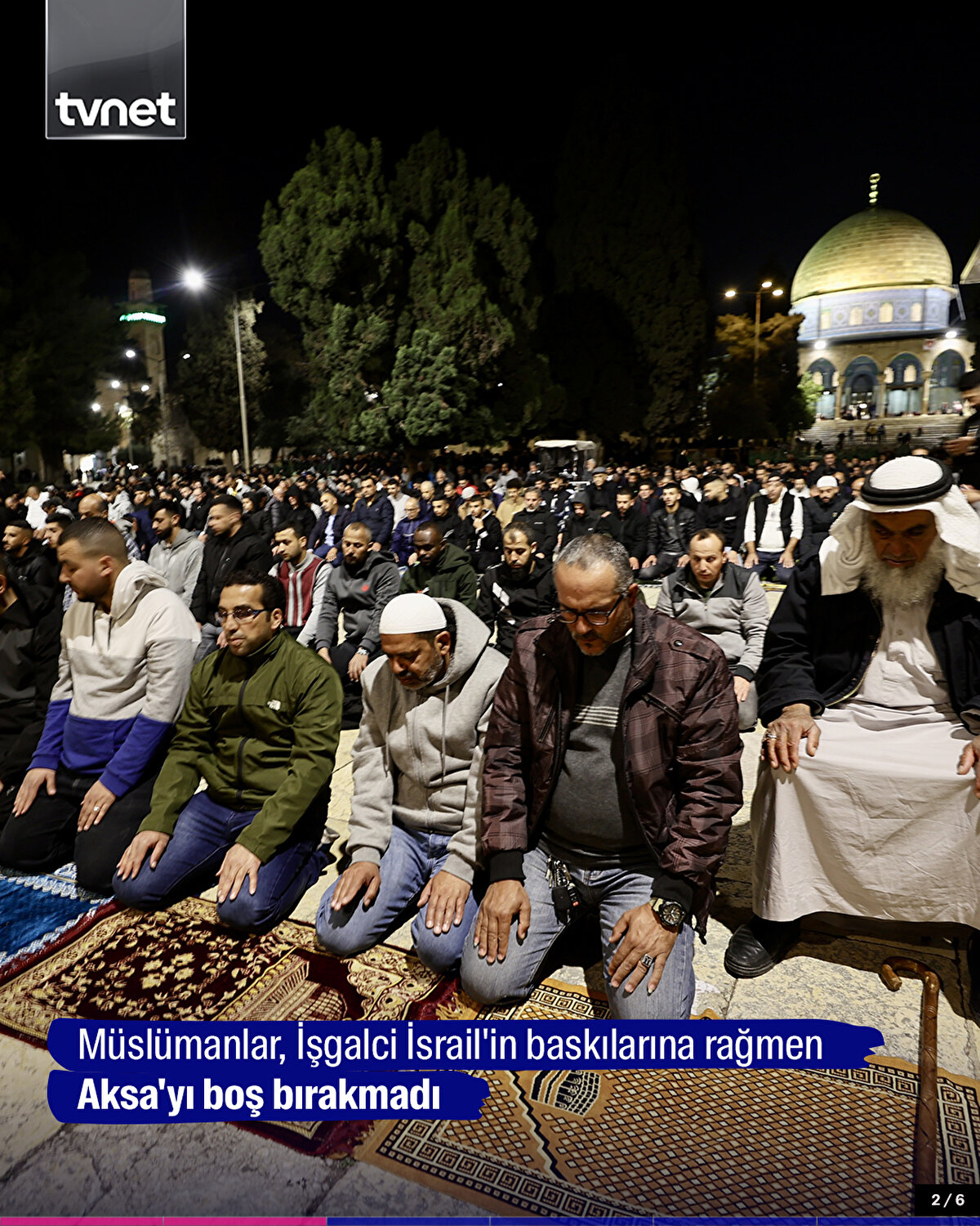 Müslümanlar, İşgalci İsrail'in baskılarına rağmen Mescid-i Aksa'yı boş bırakmadı. İsrail'in tehditleri teravih namazına gölge düşüremedi, Müslümanlar Aksa'da kıyama durdu. Yüzlerce kişi, teravih namazını Müslümanların ilk kıblesi olan Mescid-i Aksa'da kıldı.