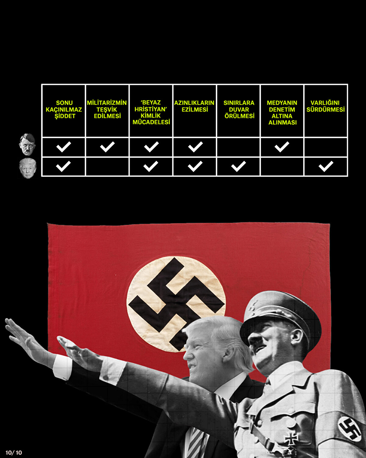 Seçildikten sonra 'beyazların üstünlüğüne’ inanan kişilerin desteklediği isimleri Beyaz Saray'da kritik konumlara atayan Trump ve Nazi lideri Hitler birçok açıdan benzerlik gösteriyor.