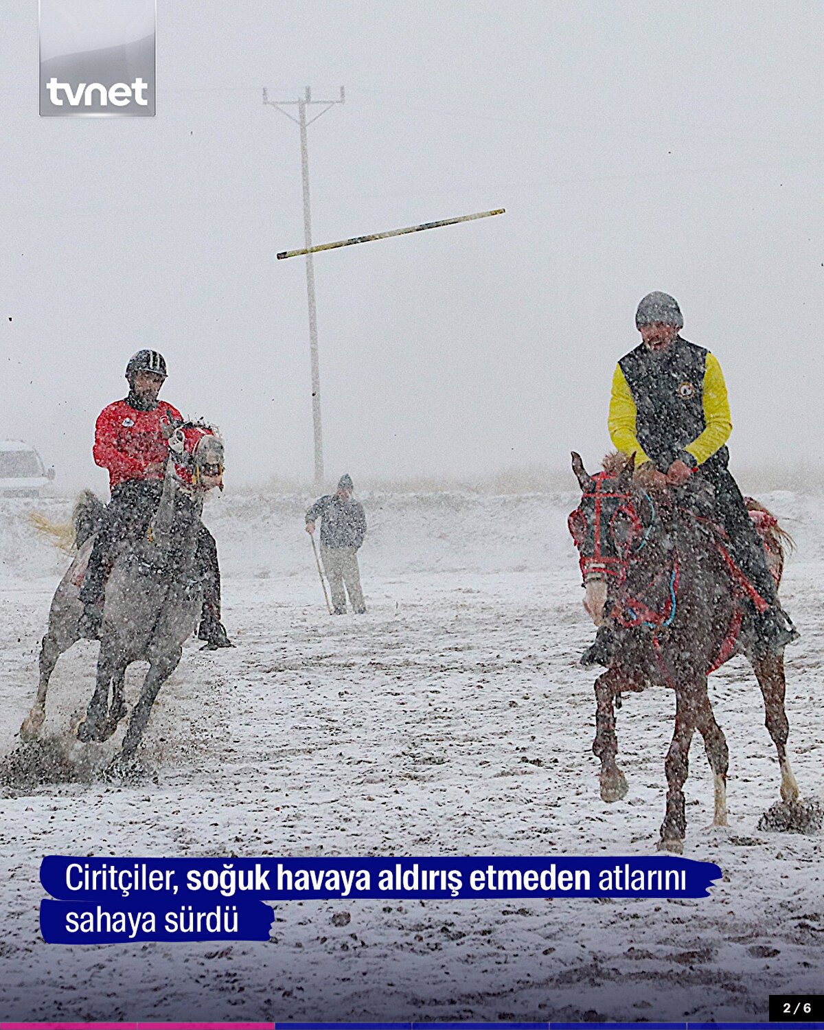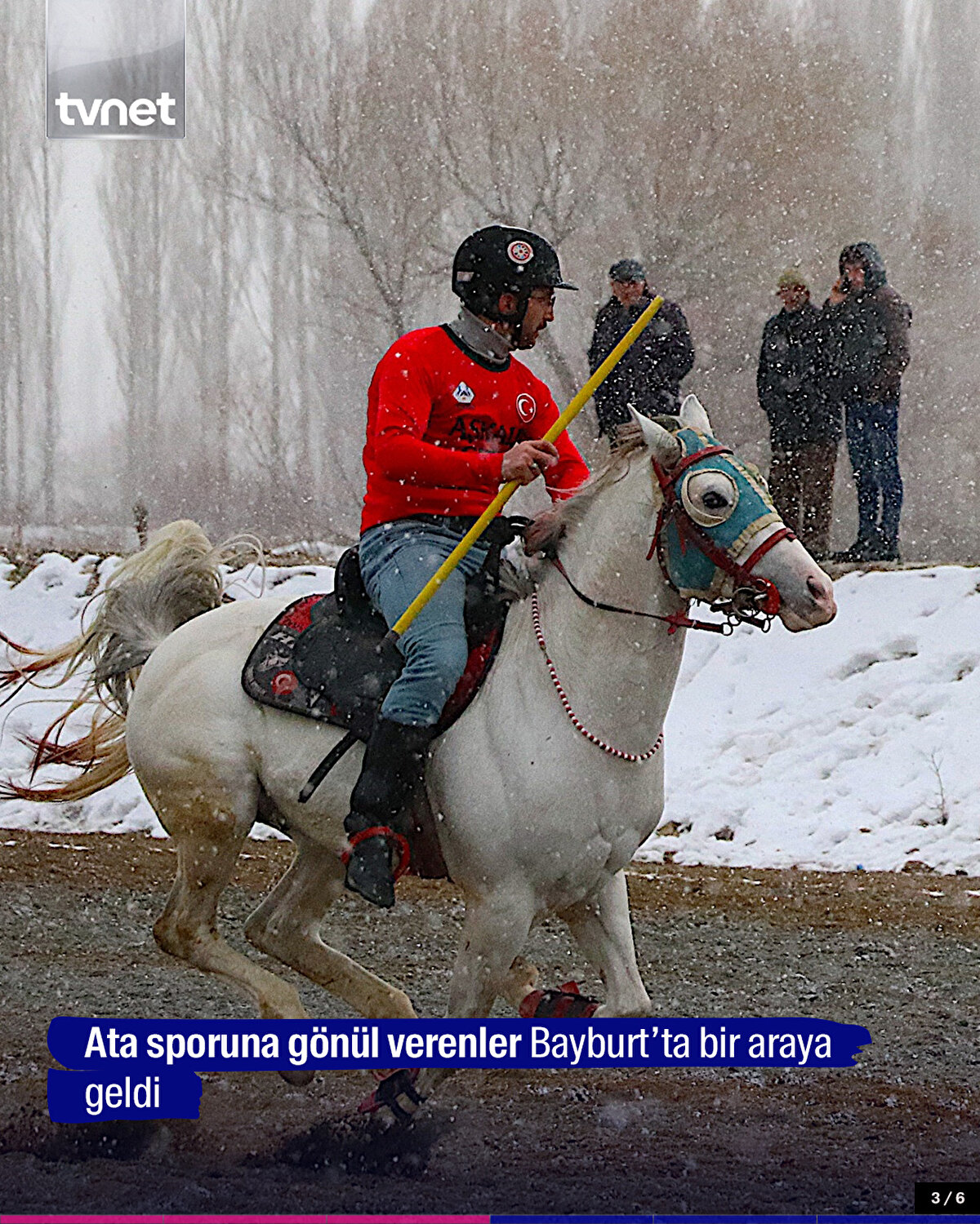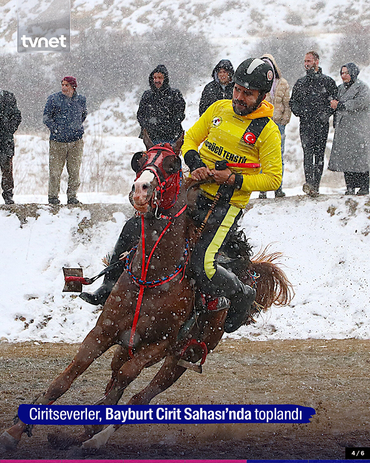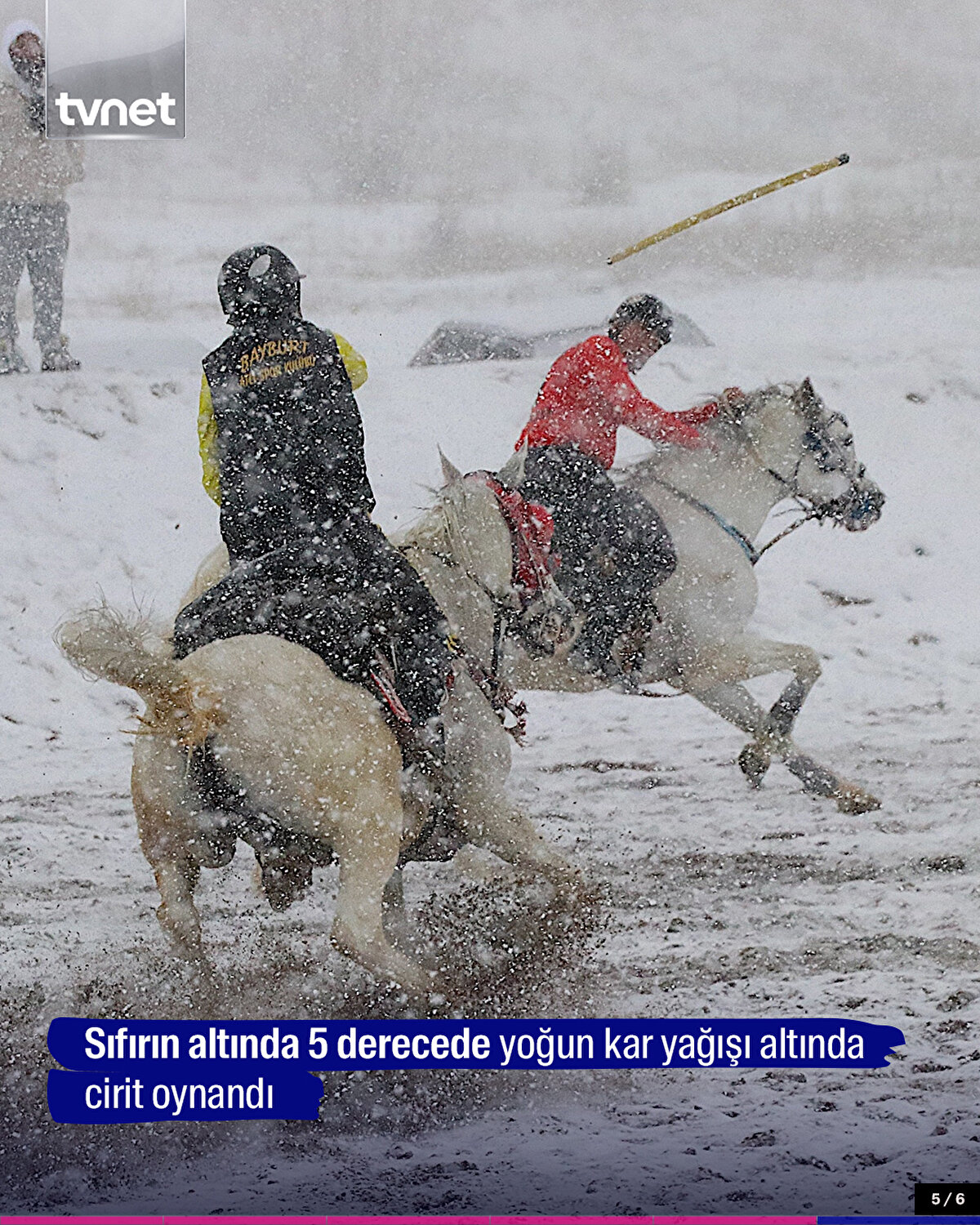 Bayburt'ta ciritçiler, ata sporunun yaşatılması için soğuk hava ve kar yağışına aldırış etmeden atlarını sahaya sürdü. Bayburt Cirit Sahası'nda sıfırın altında 5 derecede bir araya gelen ciritseverler, yoğun kar yağışı altında cirit oynadı.