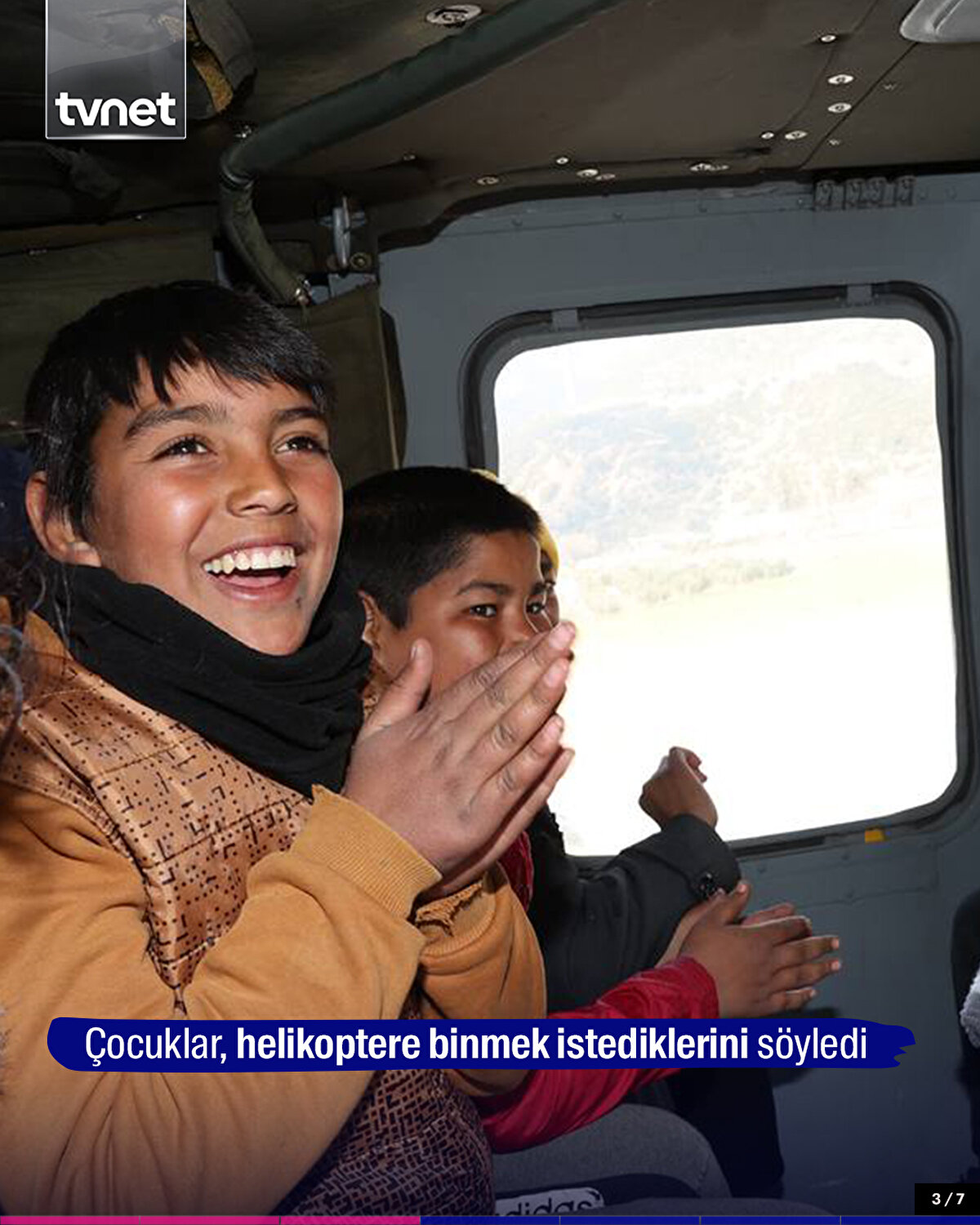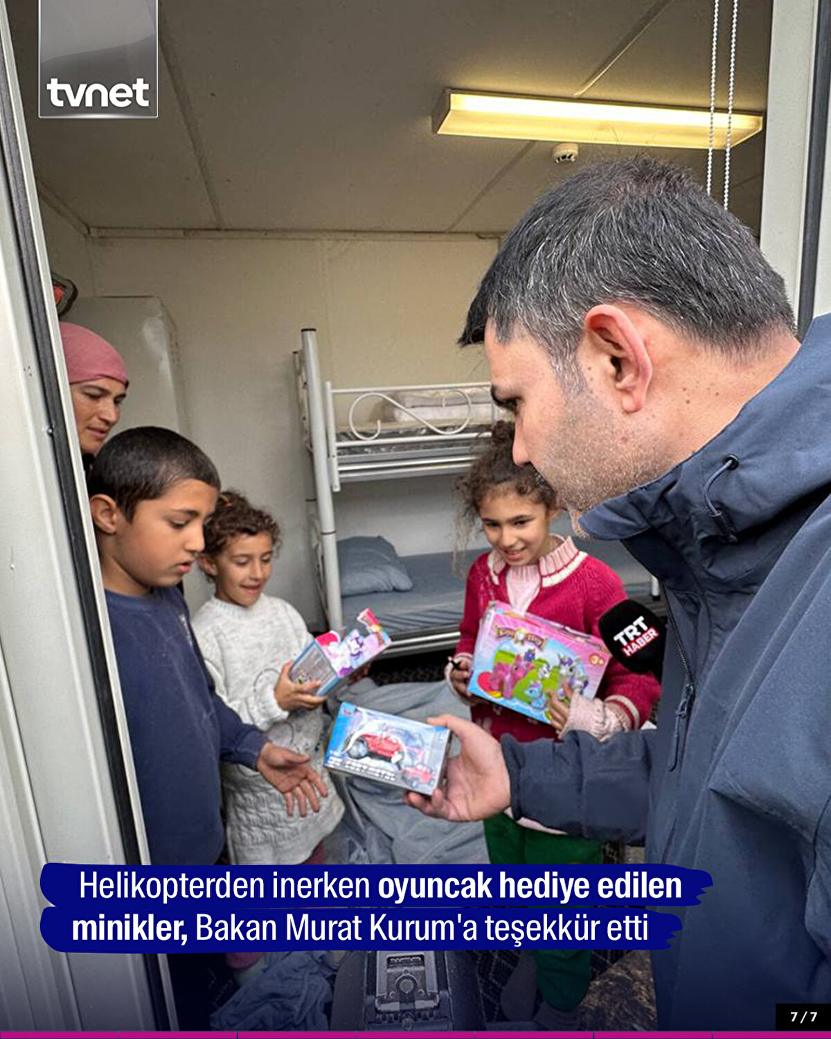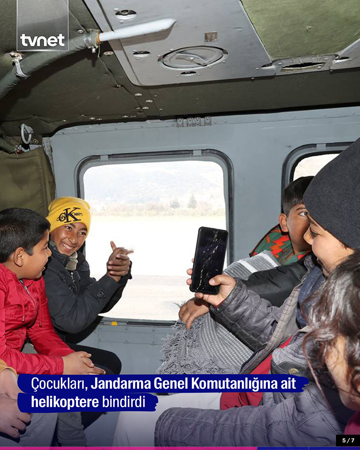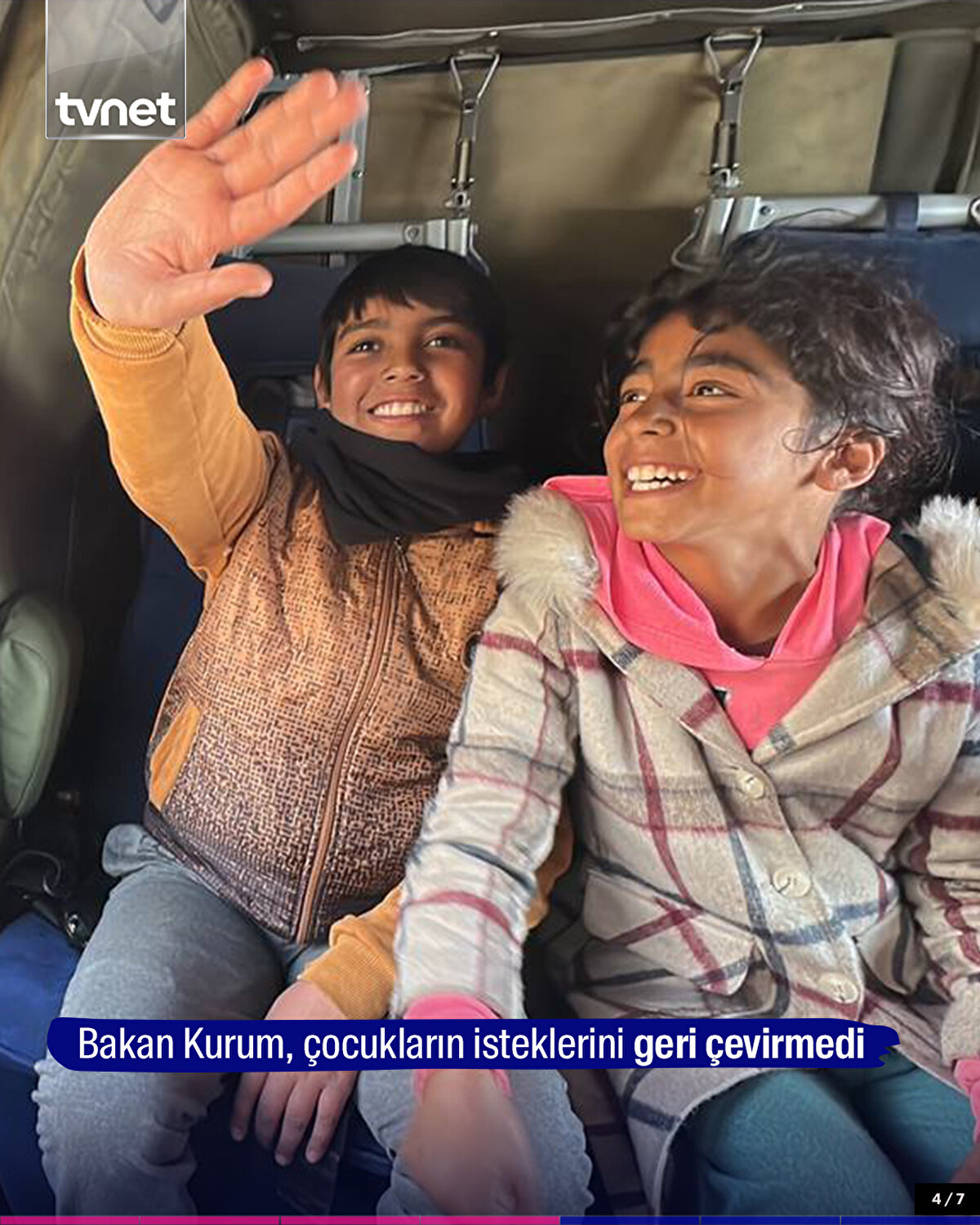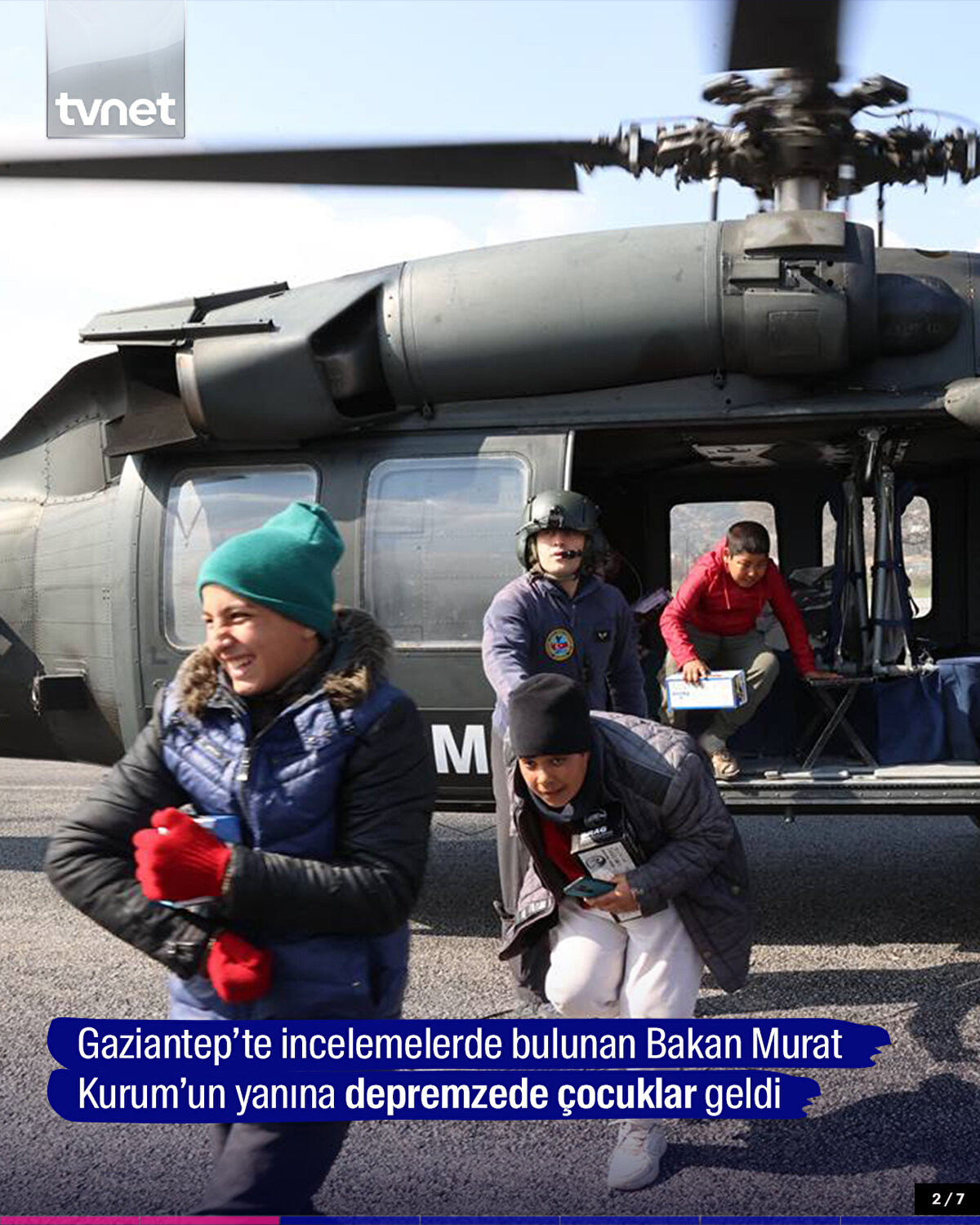 Çevre, Şehircilik ve İklim Değişikliği Bakanı Murat Kurum, Gaziantep'in Nurdağı ilçesinde incelemelerde bulunduğu sırada yanına gelen bir grup depremzede çocuğun helikoptere binme isteğini yerine getirdi. Çocukları, alan incelemeleri için kullandığı Jandarma Genel Komutanlığına ait helikoptere bindirdi.