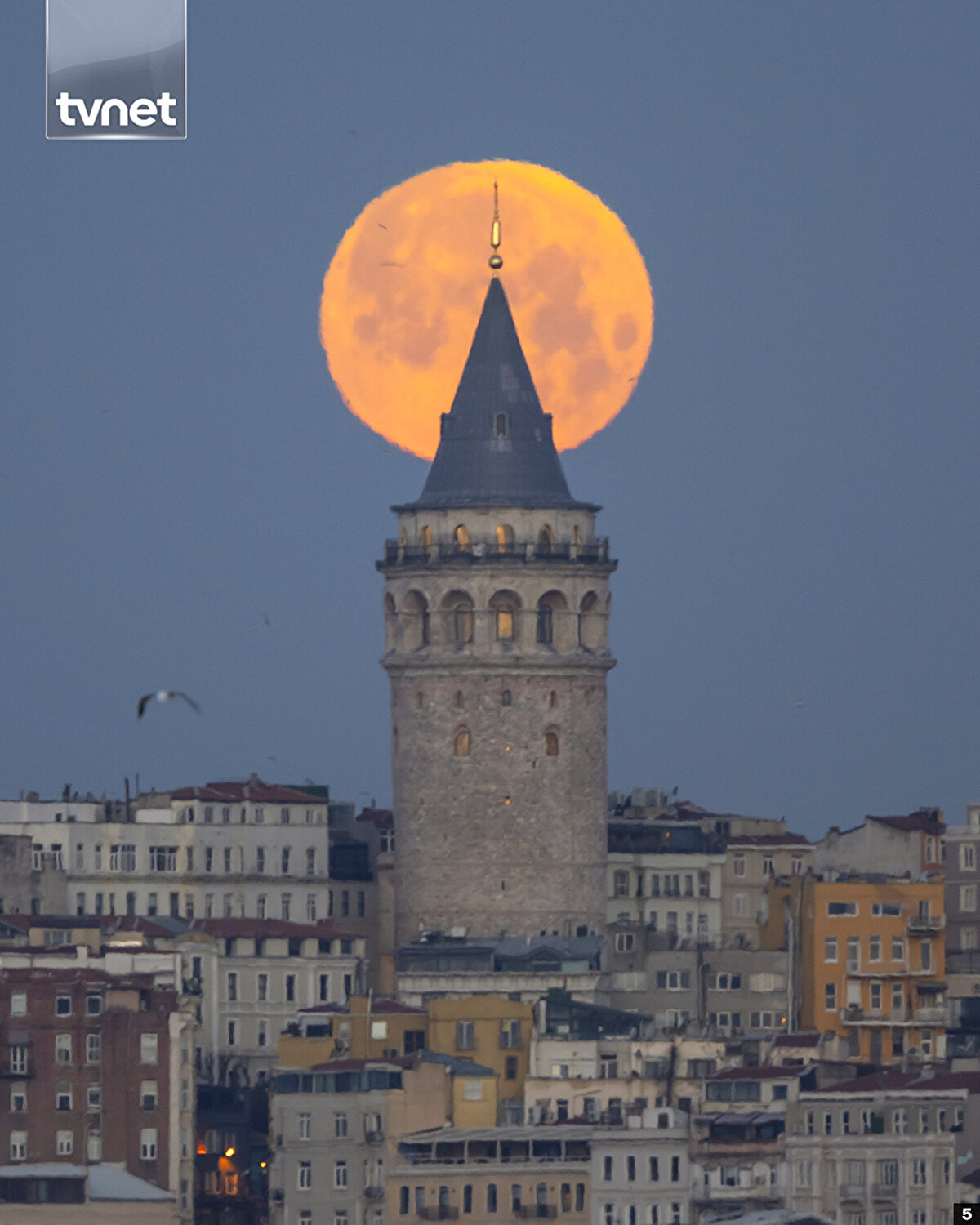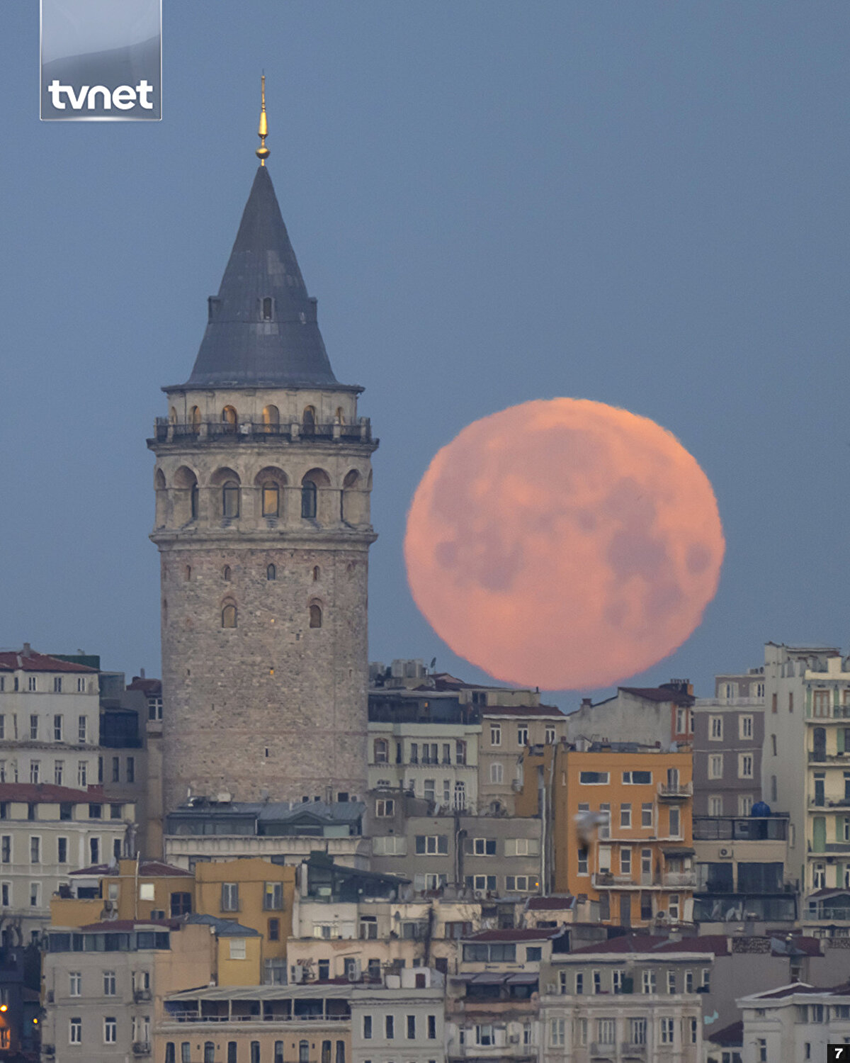 🌕İstanbul'da dolunay, Büyük Çamlıca Camisi ve Galata Kulesi ile birlikte görüntülendi.