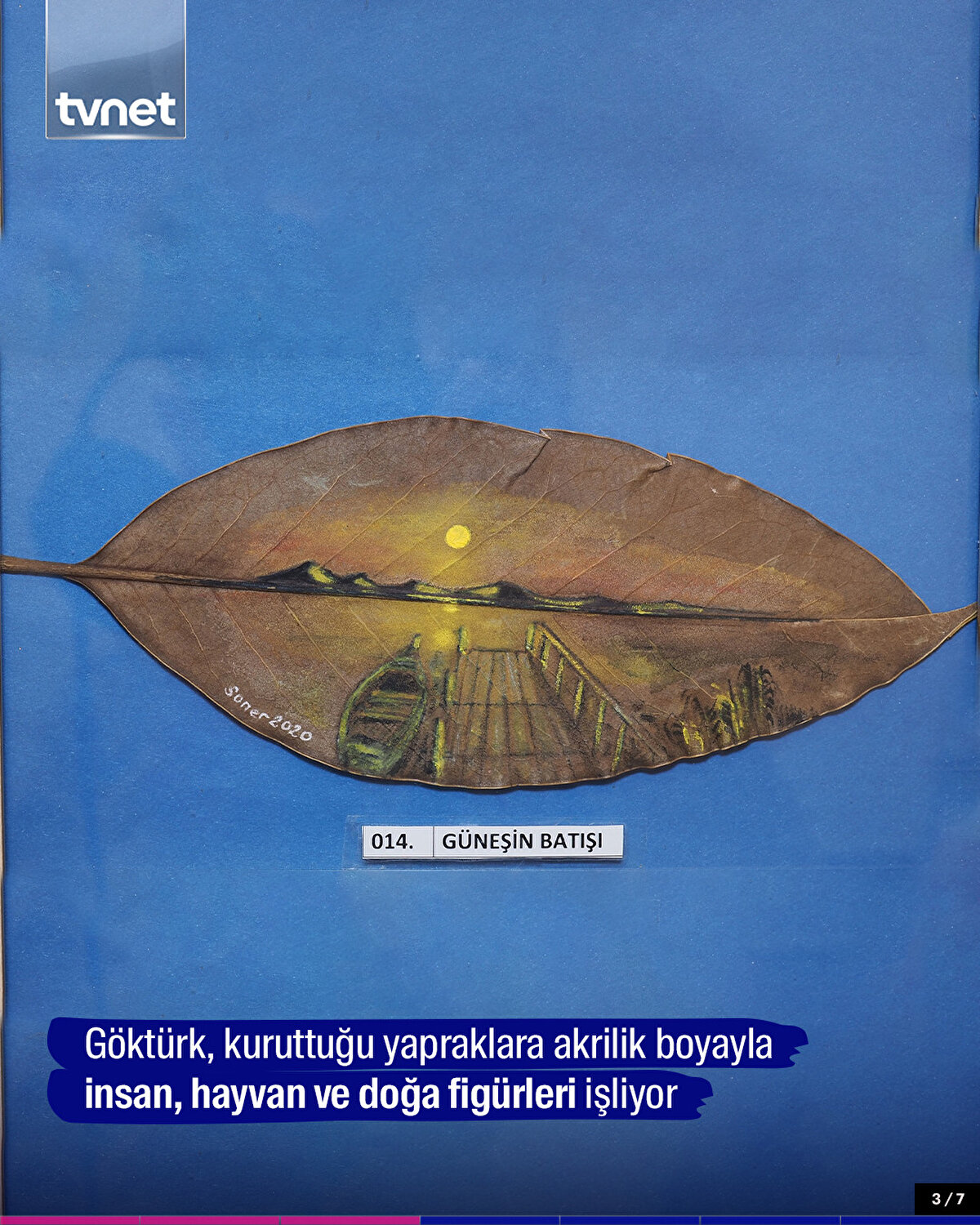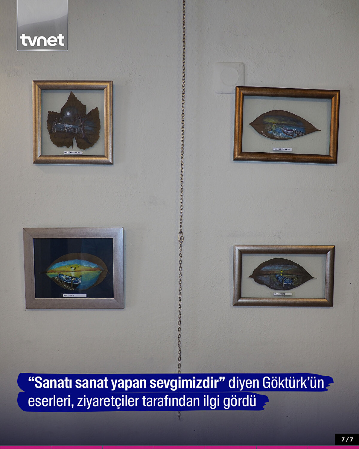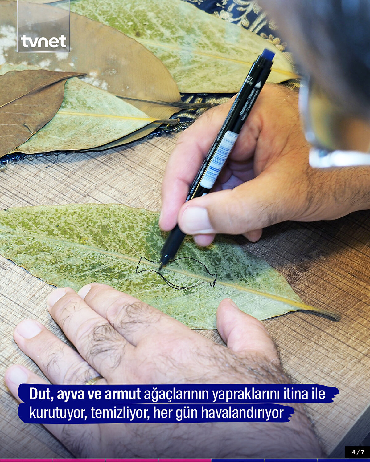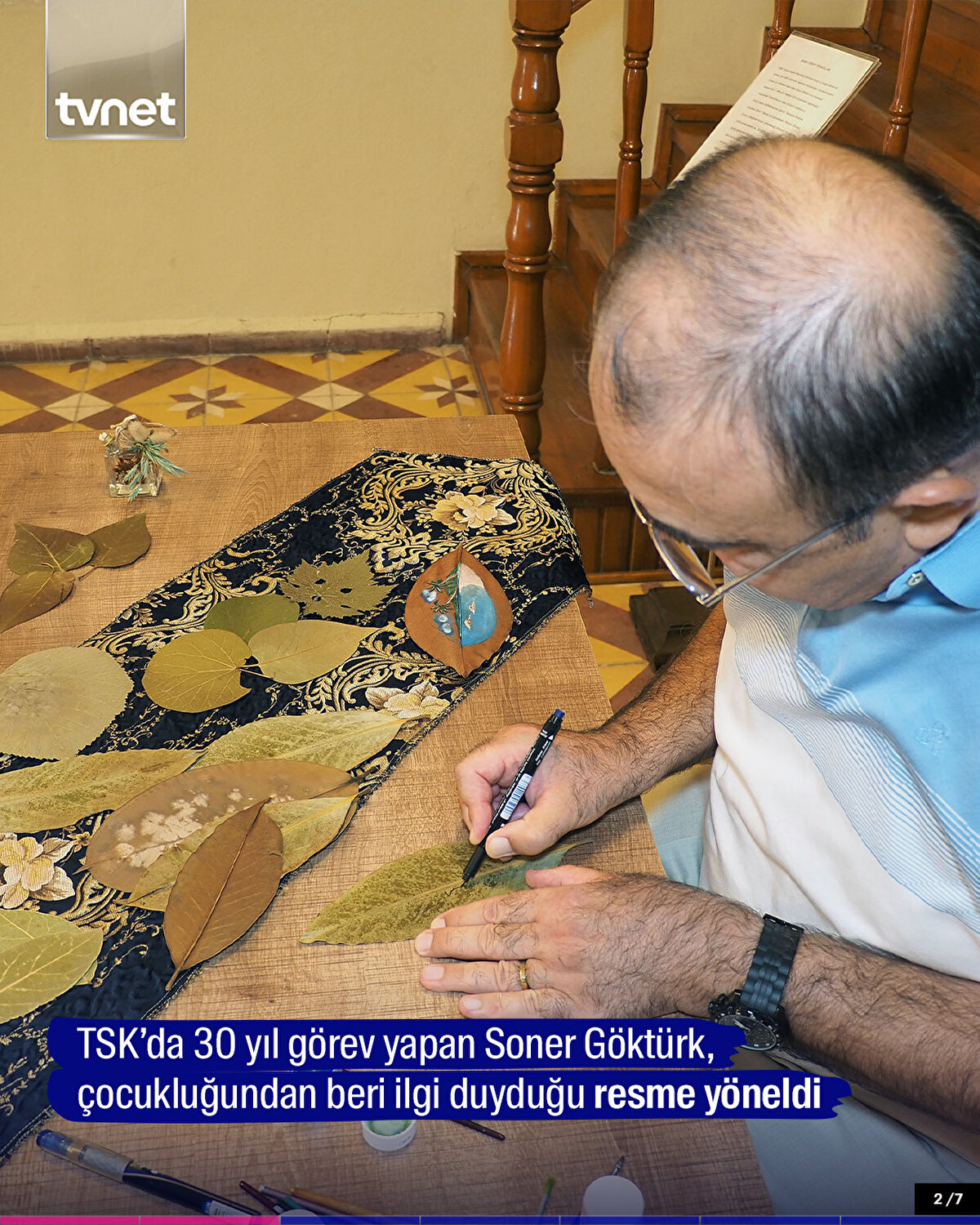 Balıkesir'in Edremit ilçesinde yaşayan emekli albay Soner Göktürk, kuruttuğu ağaç yapraklarını resimle buluşturuyor.