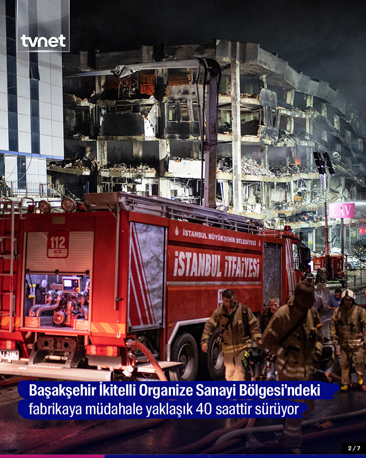Başakşehir İkitelli Organize Sanayi Bölgesi'ndeki bir fabrikada çıkan yangına müdahale eden itfaiyenin çalışmaları yaklaşık 40 saattir devam ediyor. Çalışmalar gece boyunca da devam etti. Binanın dördüncü, beşinci ve altıncı katlarındaki bazı bölümlerde devam eden küçük çaplı yangınlara müdahale ediliyor.