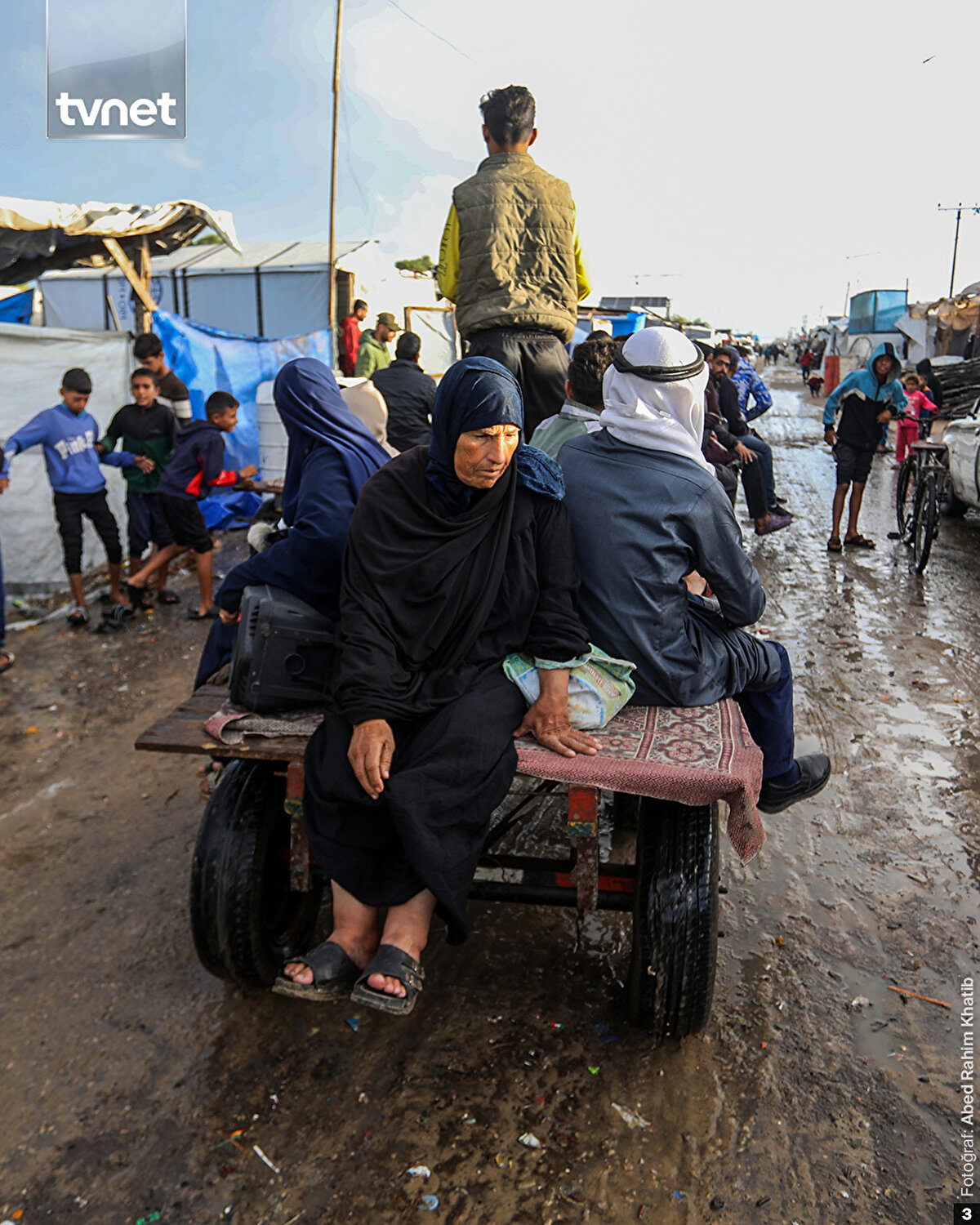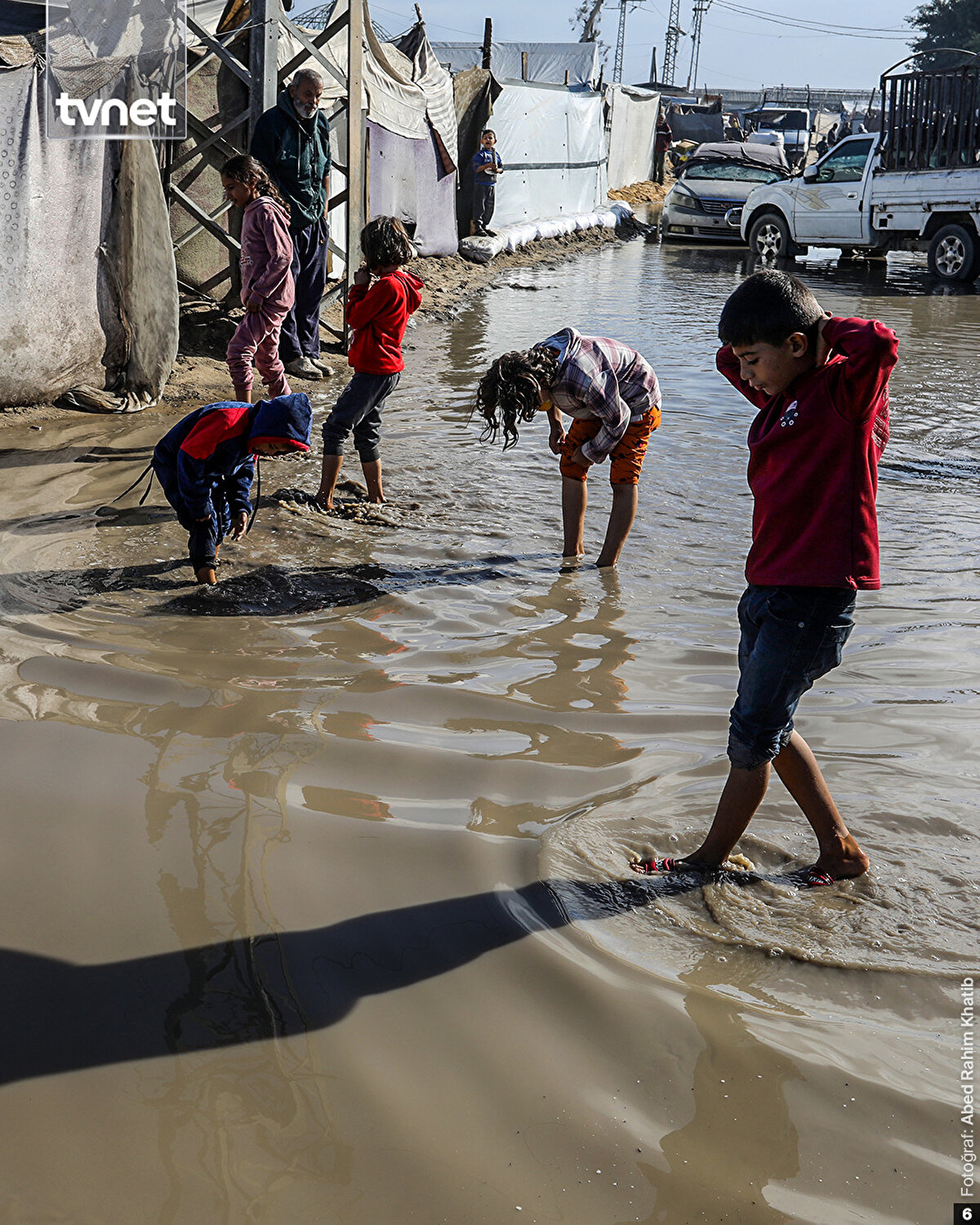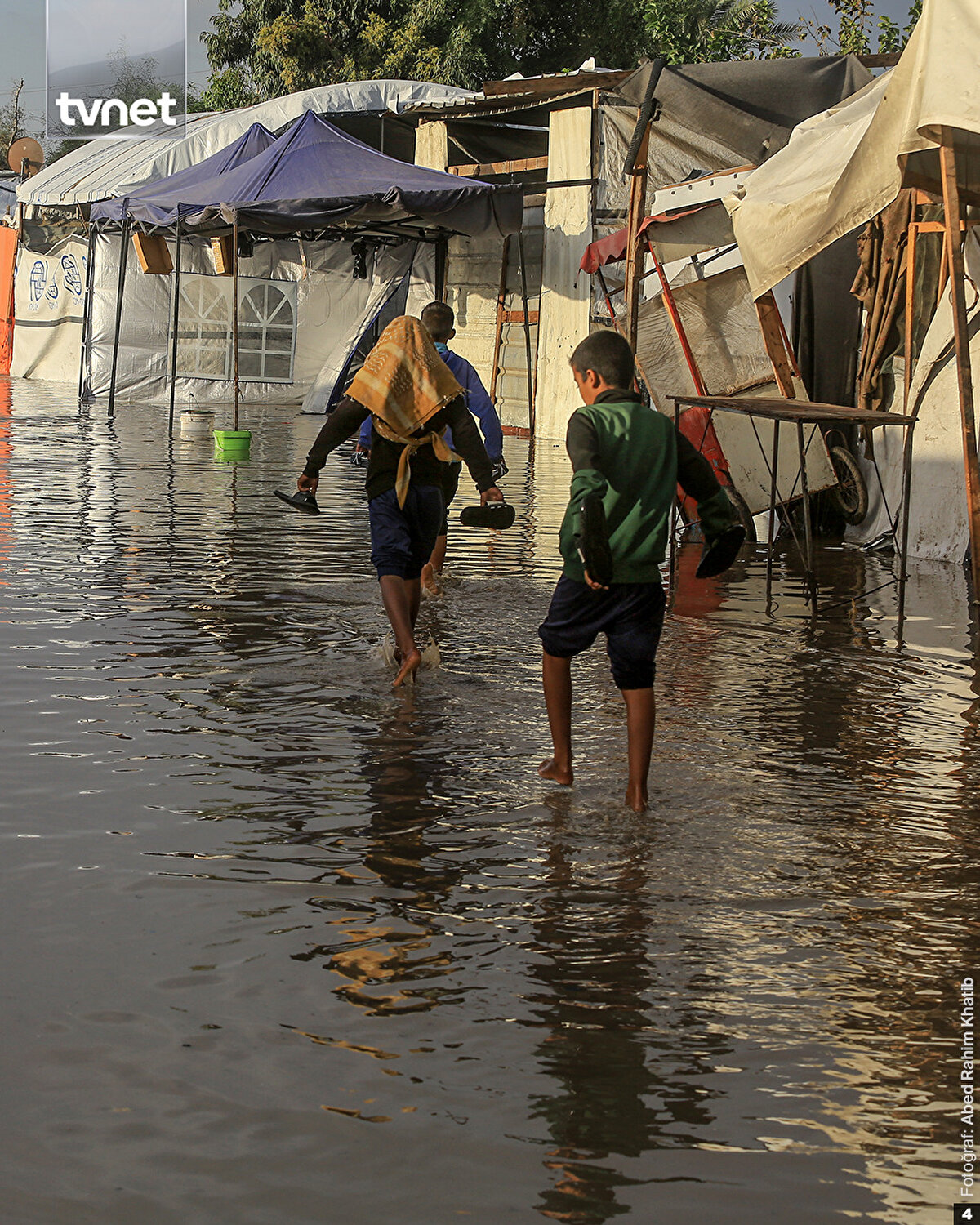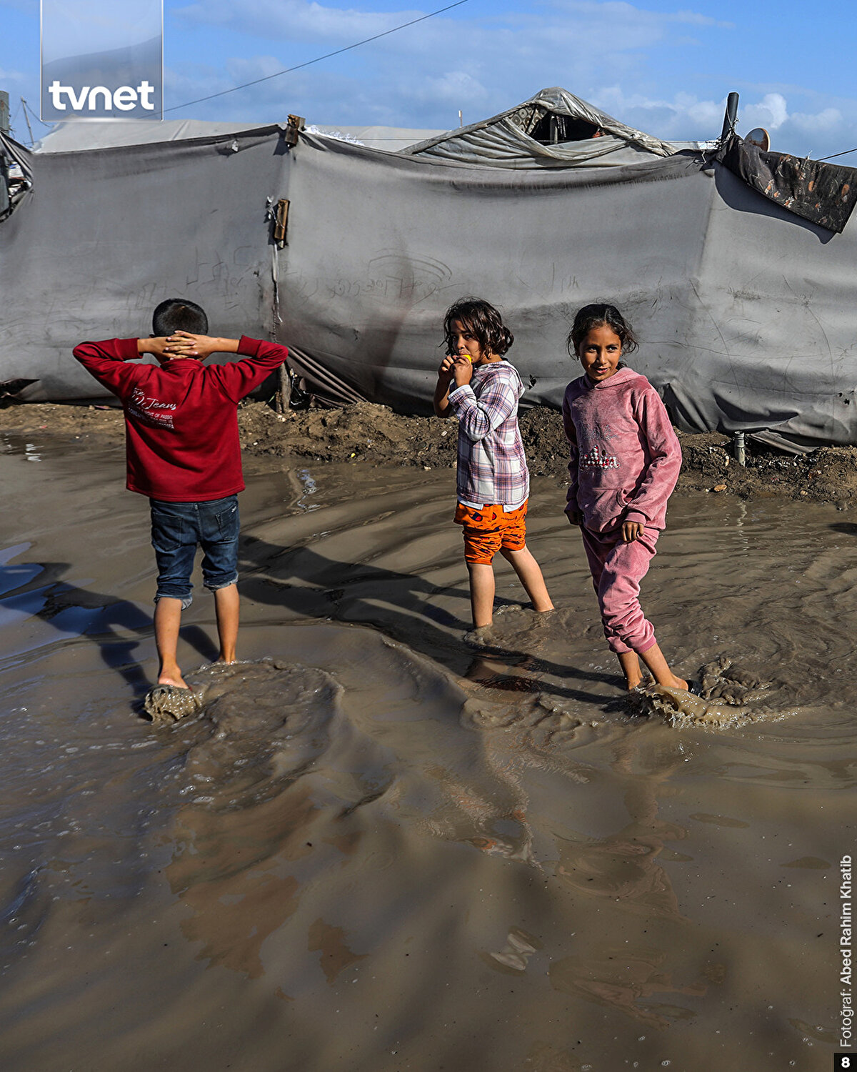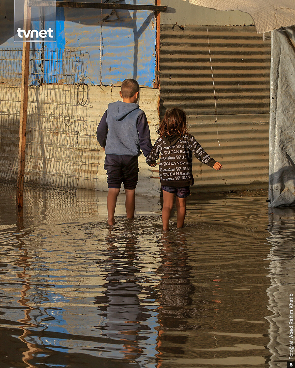 Bazı Filistinliler, tamamen suyla kaplanan sokaklarda ulaşımı sağlayabilmek için eşek arabalarını kullanırken, çocuklar ise çadırlar arasındaki yağmur sularıyla dolu alanlarda yürümek zorunda kalıyor.