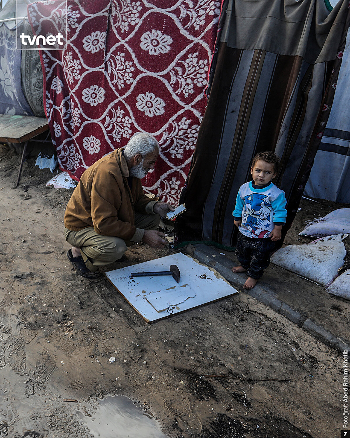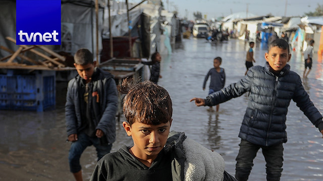 İşgalci İsrail'in Gazze Şeridi'ne yönelik saldırıları nedeniyle evleri yıkılan ve Han Yunus kentine bağlı Mavasi bölgesinde yaşayan yerinden edilmiş Filistinliler, etkili olan sağanak yağış ve soğuk hava nedeniyle zor günler geçiriyor.