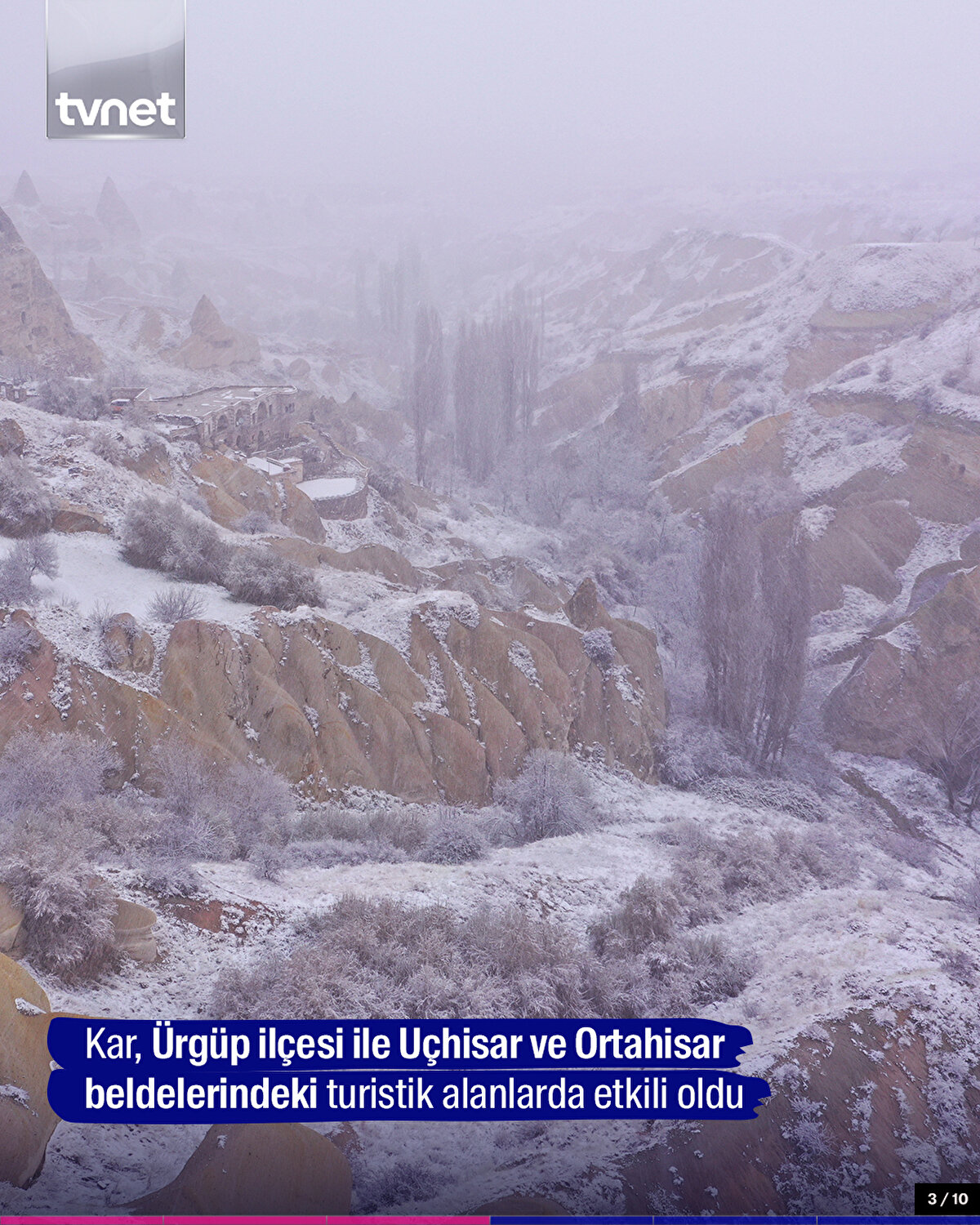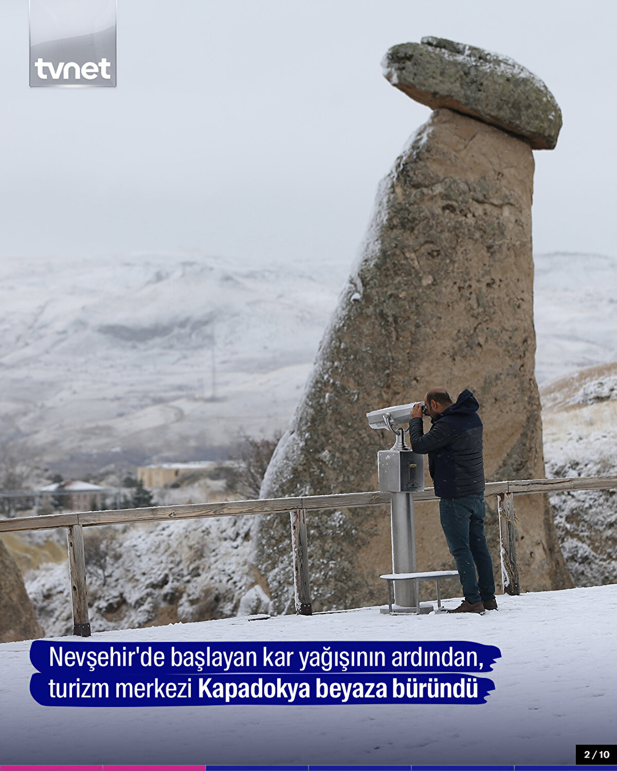 Nevşehir'de başlayan kar yağışının ardından, turizm merkezi Kapadokya beyaza büründü.
