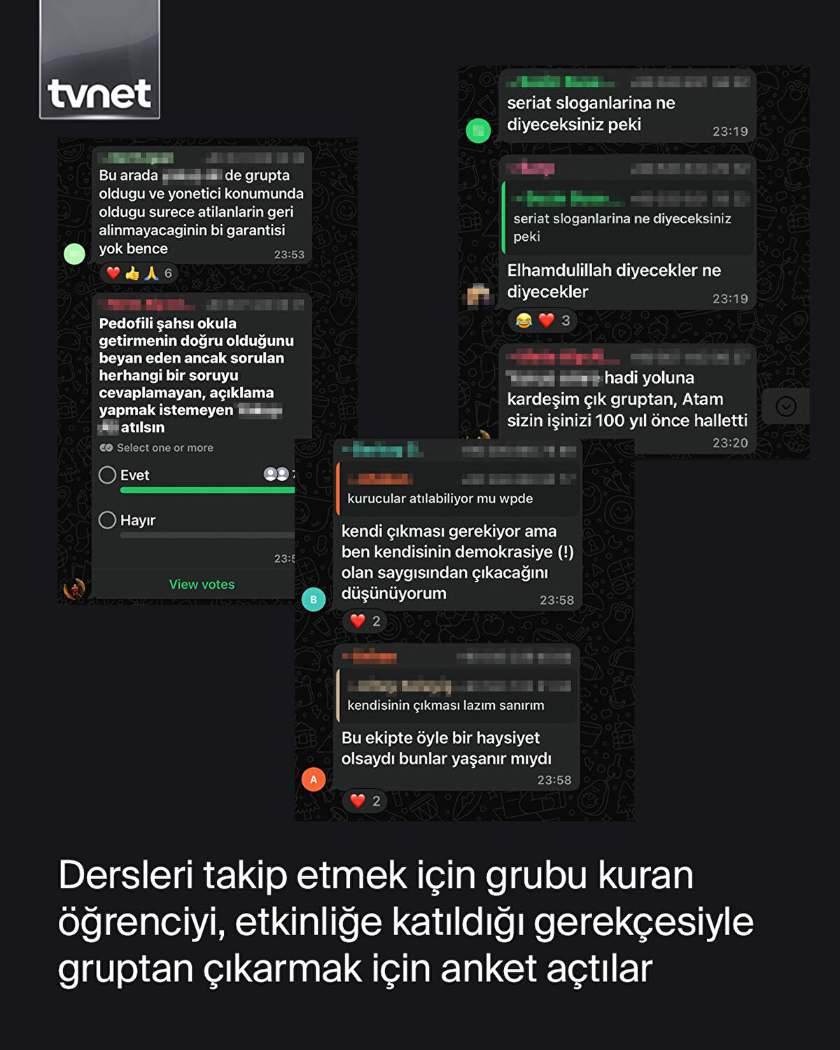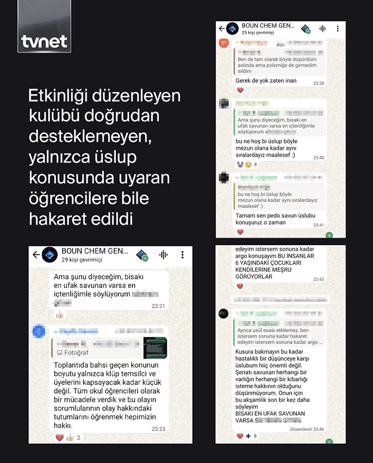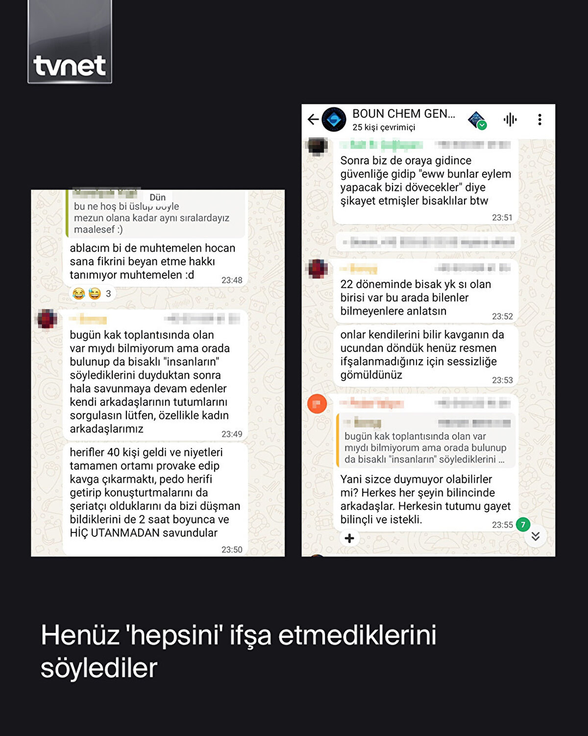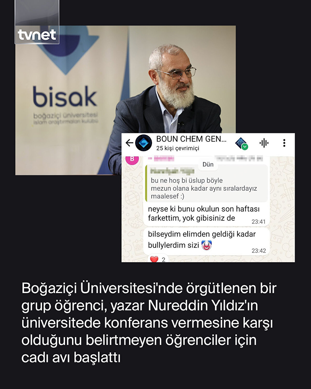 Boğaziçi Üniversitesi'nde Nureddin Yıldız'a yumurta atılmasının ardından Whatsapp gruplarında farklı görüşte olan insanlara hakaret edilerek zorbalık yapıldı.