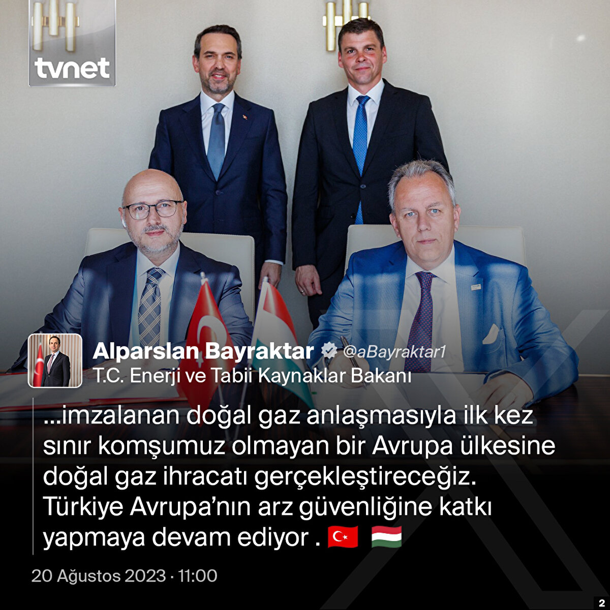 Türkiye'den tarihi anlaşma: İlk kez sınır komşusu olmayan Avrupa ülkesine doğal gaz ihraç edilecek. Enerji ve Tabii Kaynaklar Bakanı Alparslan Bayraktar, Türkiye'nin sınır komşusu olmayan bir Avrupa ülkesine ilk kez doğal gaz ihracatı gerçekleştirdiğini duyurdu. BOTAŞ ve Macaristan MVM şirketi arasında imzalanan anlaşmaya dair fotoğrafları paylaşan Bakan Bayraktar, "Türkiye, Avrupa'nın arz güvenliğine katkı yapmaya devam ediyor" dedi. Türkiye, Bulgaristan ile de ocak ayında doğal gaz ihracatı anlaşması yapmıştı.