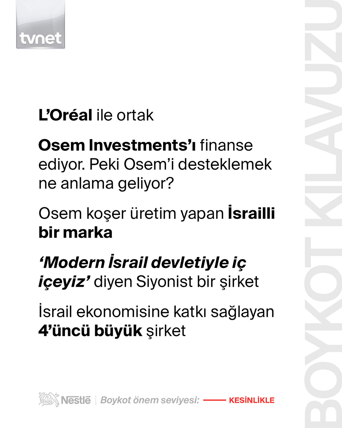 📌Öncelikli olarak boykot etmen gereken markaları 'kesinlikle' vurgusuyla ve nedenleriyle listeledik. Bu markaları 'kırmızı' işaretli göreceksin. Bu markaların direkt İsrail ekonomisini ve ordusunu beslediğini unutma!