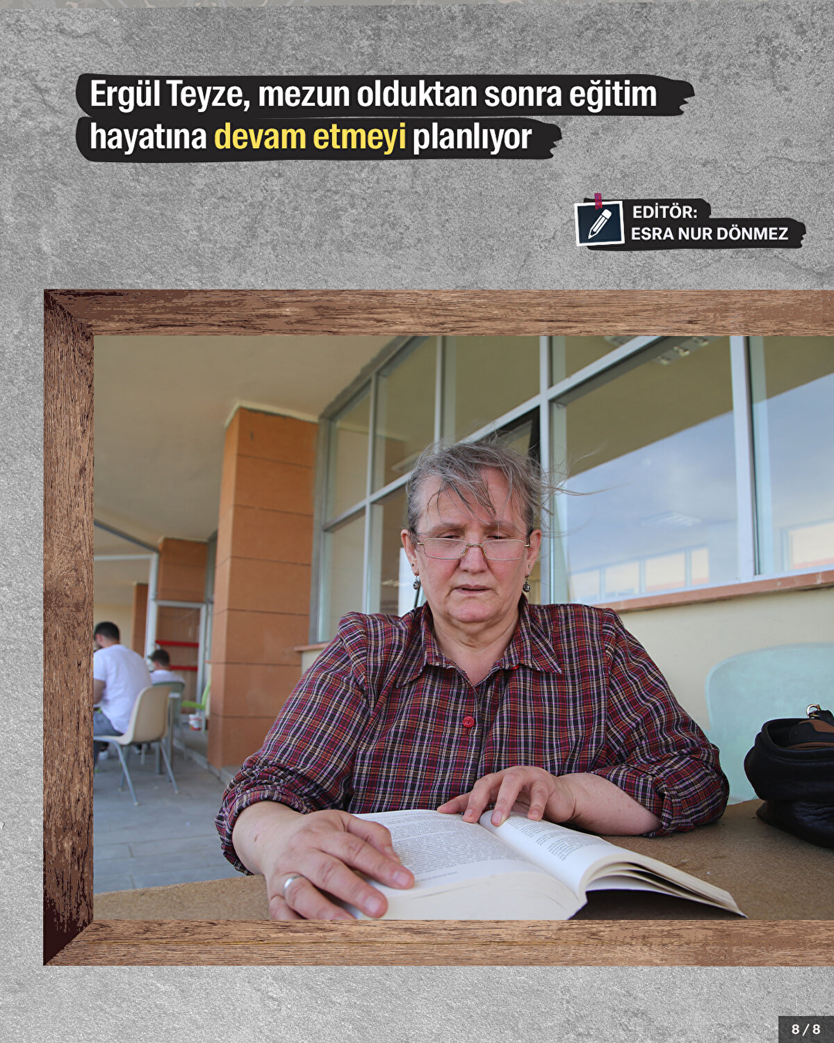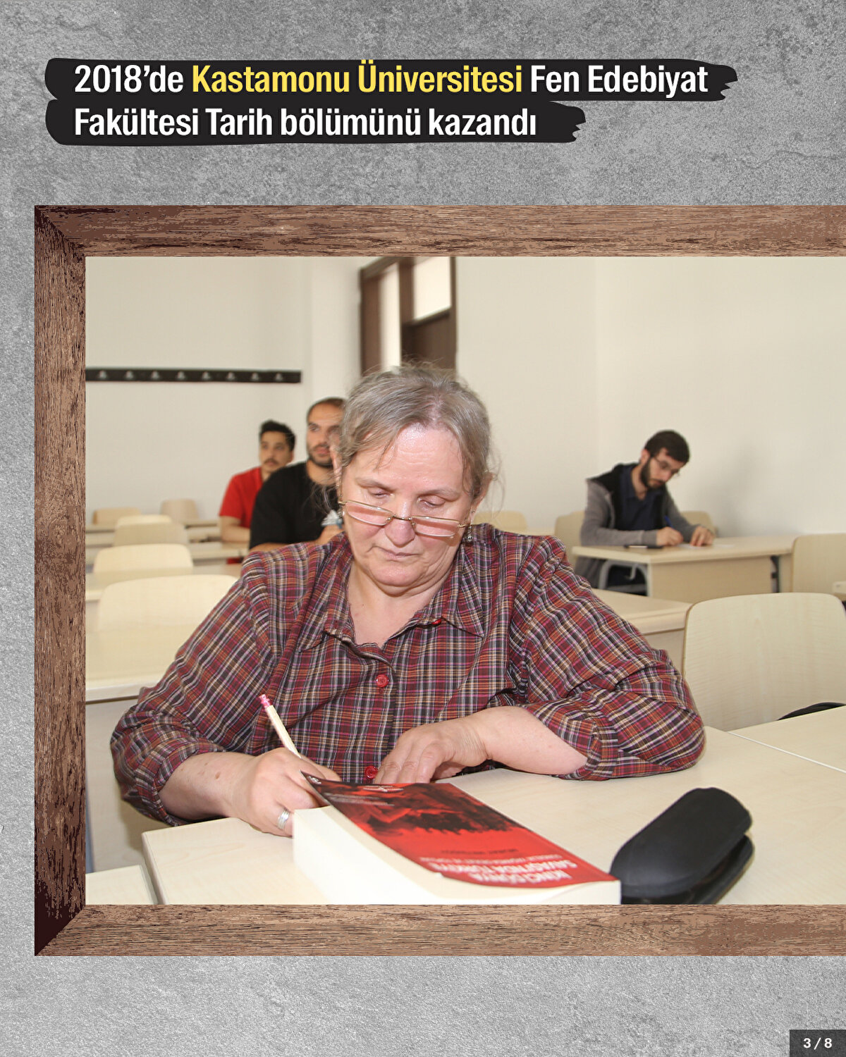 astamonu Üniversitesi Fen Edebiyat Fakültesi Tarih Bölümü son sınıf öğrencisi 66 yaşındaki 4 çocuk annesi Ergül Kebeli ile tanışın Ergül Teyze, mezun olduktan sonra da eğitimine devam etmek istiyor.