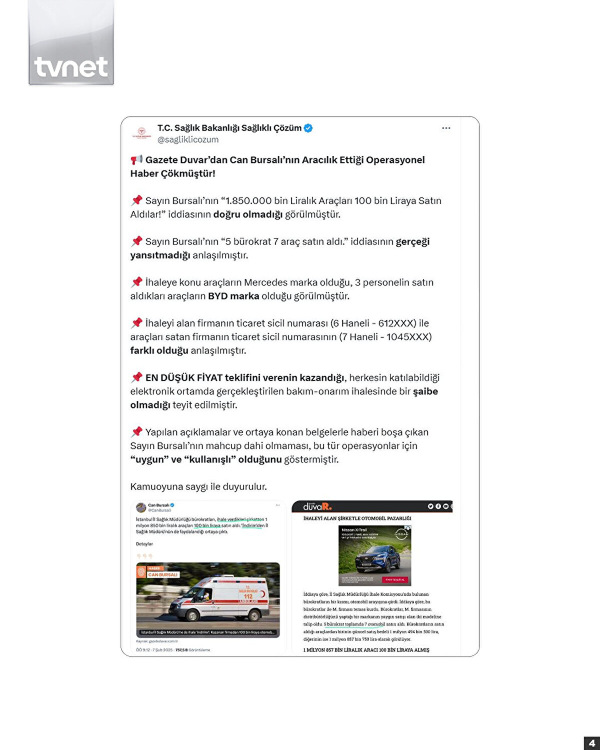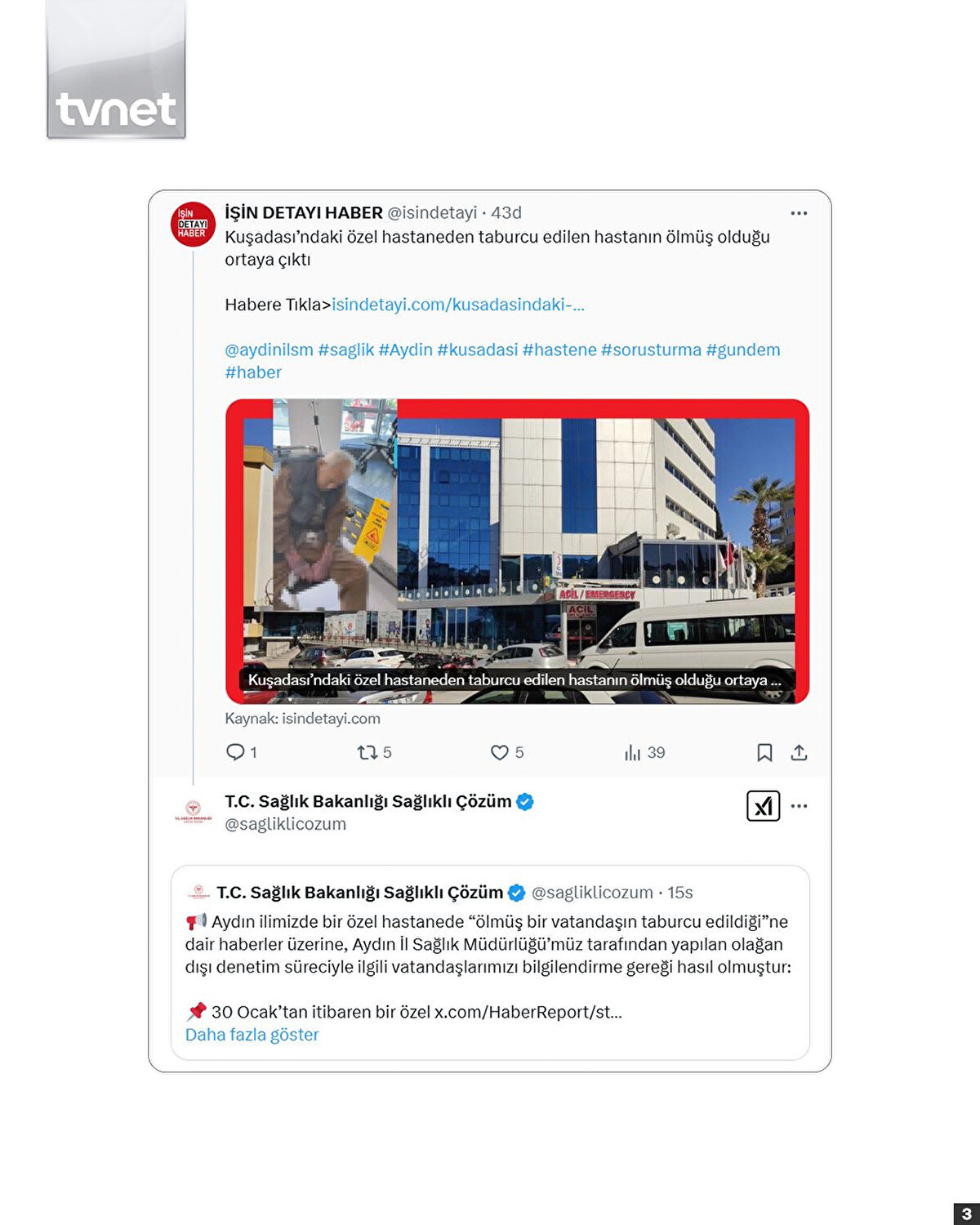 Sağlık Bakanlığı, “hastanelere sahipsiz hayvan sokulmayacağı”, “ölmüş bir vatandaşın taburcu edildiği", “İstanbul İl Sağlık Müdürlüğü'nde görevli bürokratların 1 milyon 850 bin liralık araçları 100 bin liraya satın aldığı” iddialarını içeren manipülatif haberleri çürüttü.