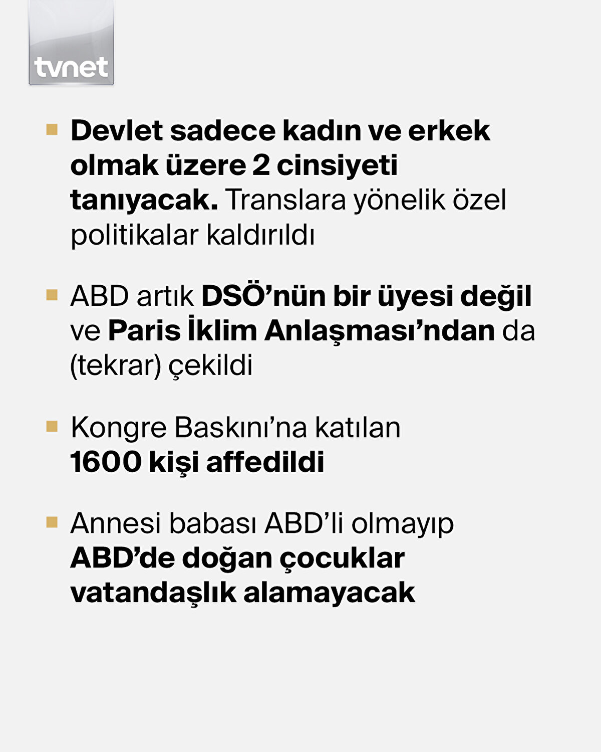 2. kez başkanlık koltuğuna oturan Trump dış politikadan federal değişikliklere bir çok yeni karara imza attı.