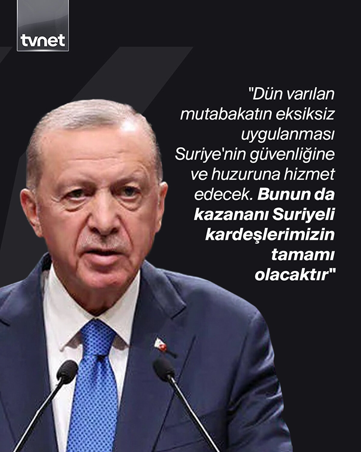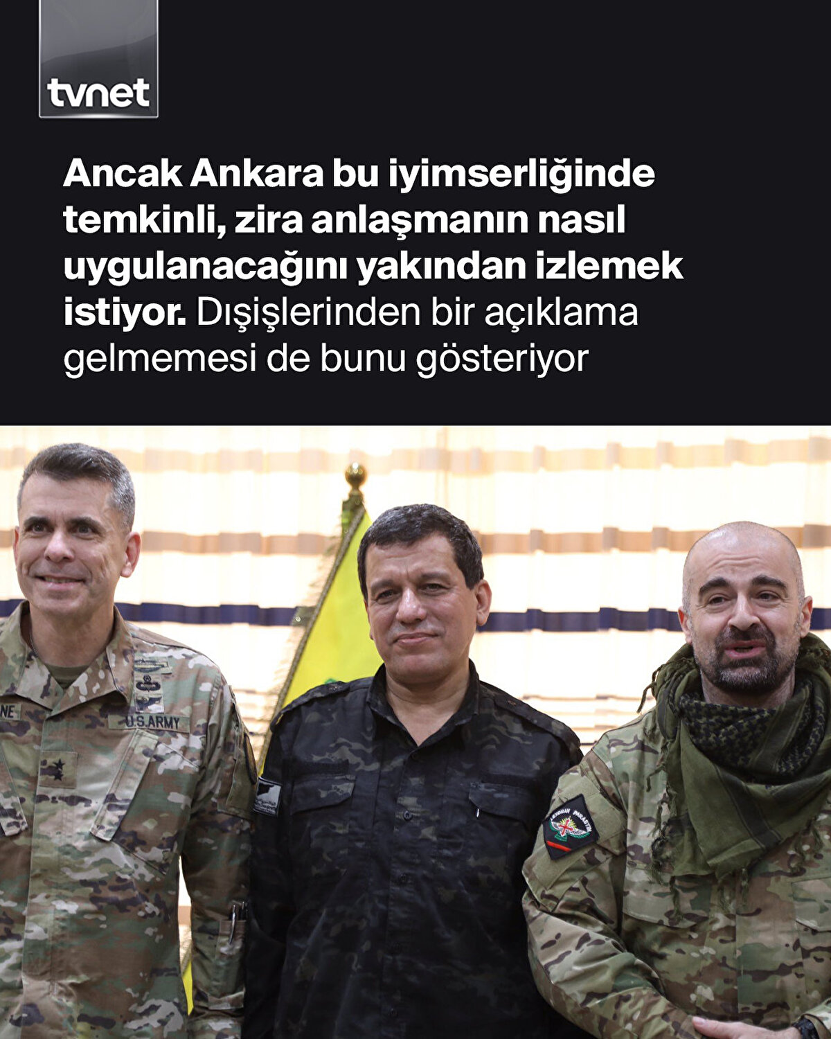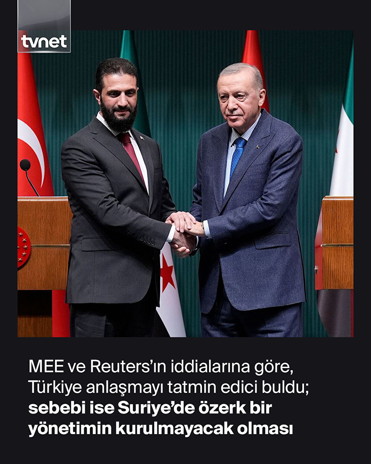 MEE ve Reuters'ın iddialarına göre, Türkiye anlaşmayı tatmin edici buldu; sebebi ise Suriye'de özerk bir yönetimin kurulmayacak olması. Ancak Ankara bu iyimserliğinde temkinli, zira anlaşmanın nasıl uygulanacağını yakından izlemek istiyor . Dışişlerinden bir açıklama gelmemesi de bunu gösteriyor. Türkiye'nin beklentileri arasında PKK'nın Suriye kolu YPG'nin de silah bırakması var. Terör örgütü SDG'nin Suriye devletine 'entegre' olması, Türkiye'nin terör konusundaki önceliklerini etkilemeyecek. MHP Genel Başkanı Devlet Bahçeli, Öcalan'ın çağrısı doğrultusunda terör örgütü SDG'nin de kendini feshetmesi gerektiğini söylemişti. Katar ve Suudi Arabistan gibi bölge ülkeleri anlaşmayı olumlu karşıladı. Trump'ın Orta Doğu defterini kapattığı ve Çin'e yöneleceği ifade ediliyor. Cumhurbaşkanı Erdoğan: Dün varılan mutabakatın eksiksiz uygulanması, Suriye'nin güvenliğine ve huzuruna hizmet edecek. Bunun da kazananı Suriyeli kardeşlerimizin tamamı olacaktır.