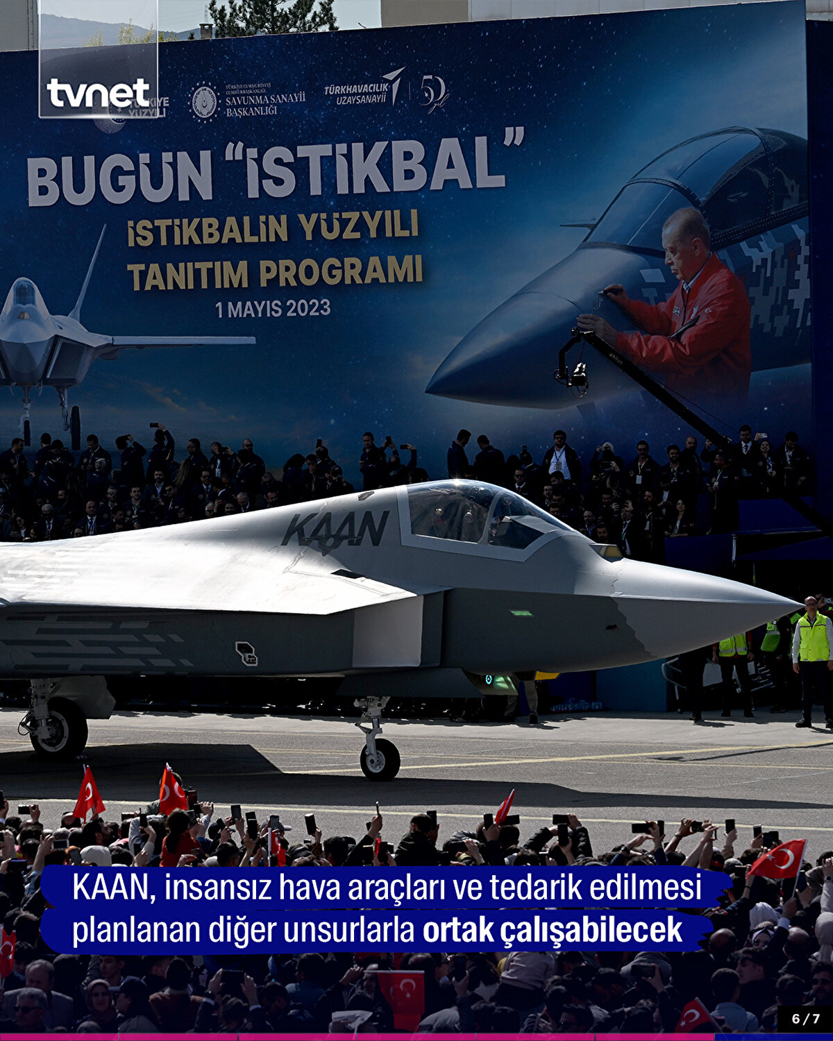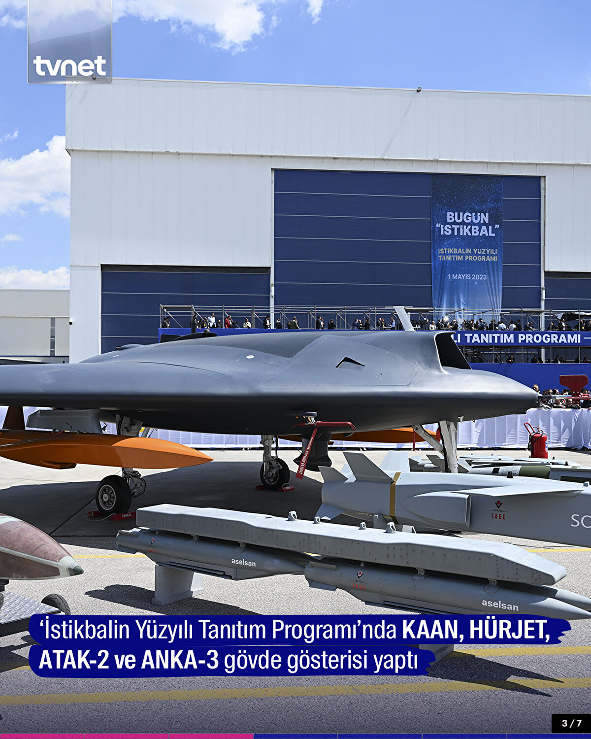 Türkiye'nin Milli Muharip Uçağı KAAN, TUSAŞ Kahramankazan merkez yerleşkesinde bir kez daha vitrine çıktı. Cumhurbaşkanı Erdoğan'ın katılımıyla düzenlenen 'İstikbalin Yüzyılı Tanıtım Programı'nda ismi açıklanan KAAN ile HÜRJET, ATAK-2 ve ANKA-3 gövde gösterisi gerçekleştirdi.