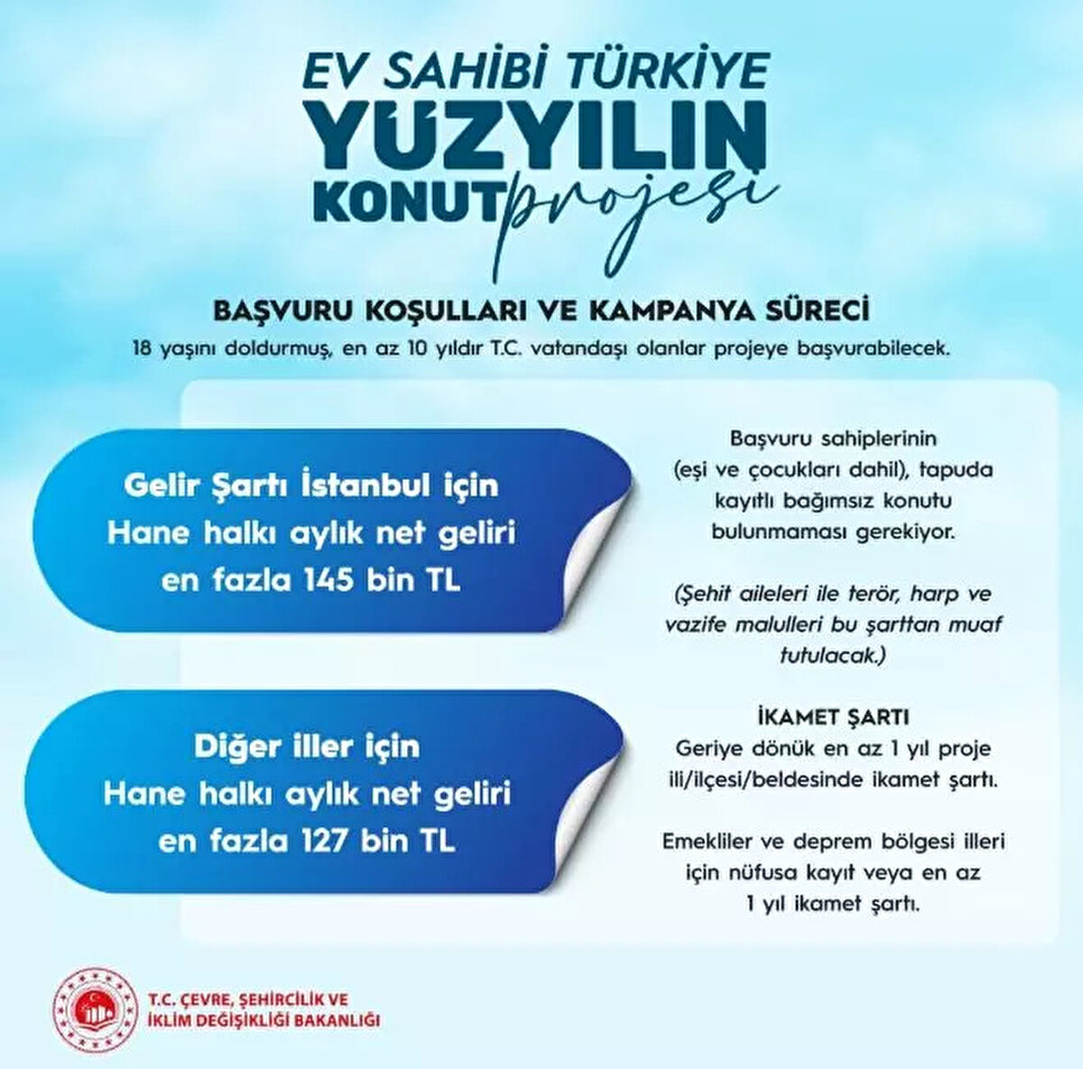 Cumhuriyet tarihinin en büyük konut projesi için geri sayım sona erdi. “Yüzyılın Konut Projesi” kapsamında yapılacak 500 bin sosyal konut için başvurular başladı. Vatandaşlar, başvurularını Ziraat Bankası, Halk Bankası, Emlak Katılım şubeleri veya e-Devlet üzerinden kolayca yapabiliyor.
