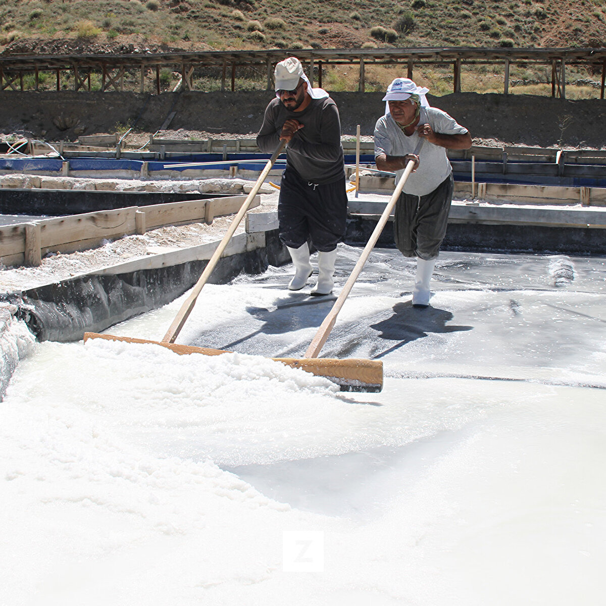 Erzincan'ın Kemah ilçesine bağlı Kömür köyündeki tesiste tescilli tuz üreten işçiler, kavurucu güneş altında saatlerce mesai yapıyor.