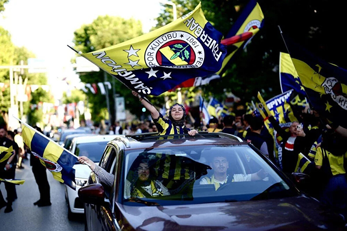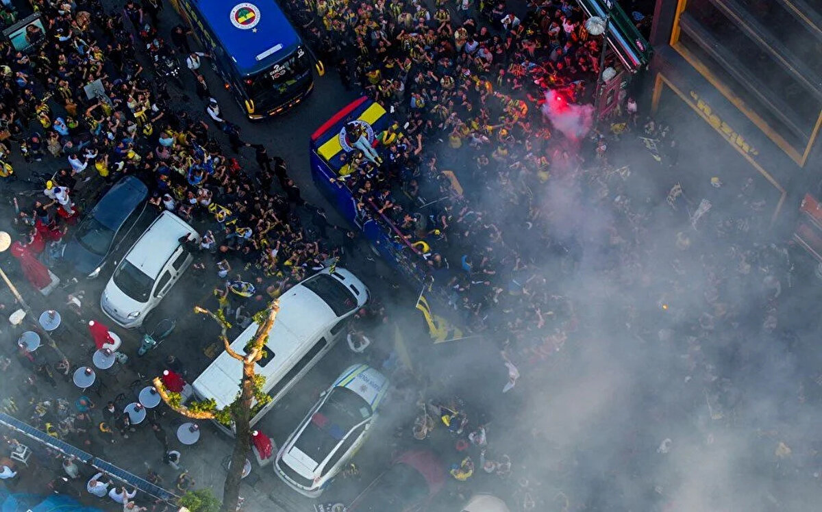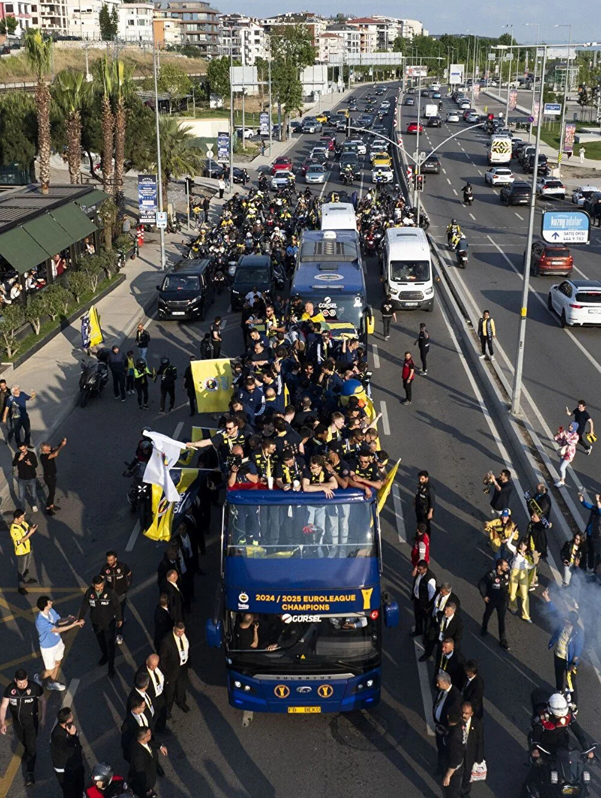 Ülker Spor ve Etkinlik Salonu'ndan üstü açık otobüsle zafer turuna başlayan sarı-lacivertliler, çifte Avrupa şampiyonluğunu simgeleyen iki yıldızlı logolarının bulunduğu bayraklarla binleri selamladı.