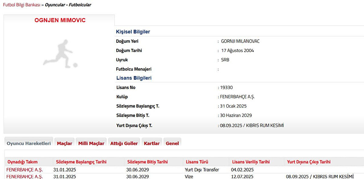 Sarı lacivertliler, genç sağ bek oyuncusu Ognjen Mimovic'in Pafos FC'ye transfer olduğunu Türkiye Futbol Federasyonu'na bildirdi.