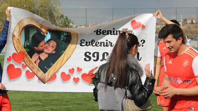 Kayseri'de oynanan İkinci Amatör Küme maçında Yavru Aslanspor takımından 29 yaşındaki Tarık Tiryaki , 26 yaşındaki sevgilisi Sıla Arıkan'a evlilik teklif etti