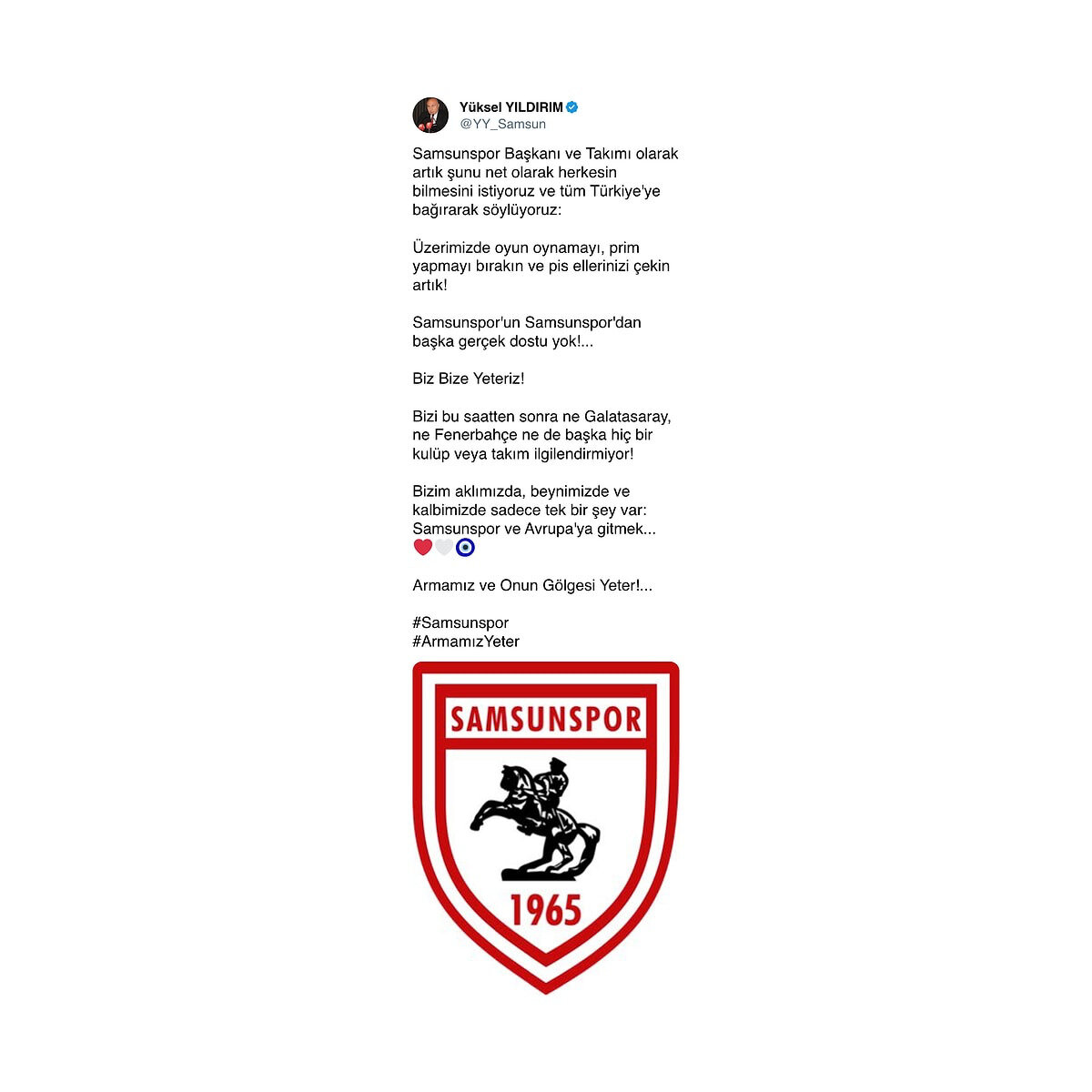 Samsunspor Başkanı Yüksel Yıldırım, Galatasaray maçı öncesinde sessizliğini bir kez daha bozdu. Yıldırım, sosyal medya hesabından yaptığı paylaşımla gündemdeki iddialara sitem etti.