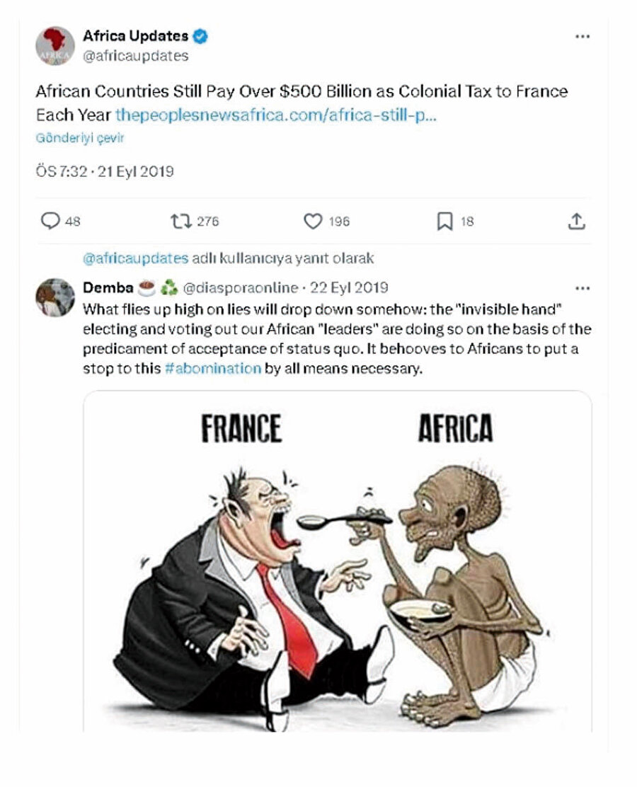 2019 yılında Afrika medyasında çıkan bir yazıya göre kıta ülkeleri “sömürge vergisi” olarak her yıl Fransa hazinesine 500 MİLYAR DOLAR para akıtıyordu. Fransa’nın Afrika’yı sömürmesi şüphesiz bir asırdan daha fazlaydı, Cezayir işgali iki asır önceydi mesela. Fakat biz bunu sadece bir asır olarak kabul etsek bile 500 MİLYAR x 100 = 50 TRİLYON DOLAR gibi dudak uçuklatan bir paradan bahsediyoruz. Fransa’nın şu anki gayrisafi milli hasılası 3 trilyon dolar civarında olduğuna göre sıfırdan 17 Fransa, 3 Çin, 2 buçuk ABD ve tam 40 Türkiye kuracak bir soygun bu.