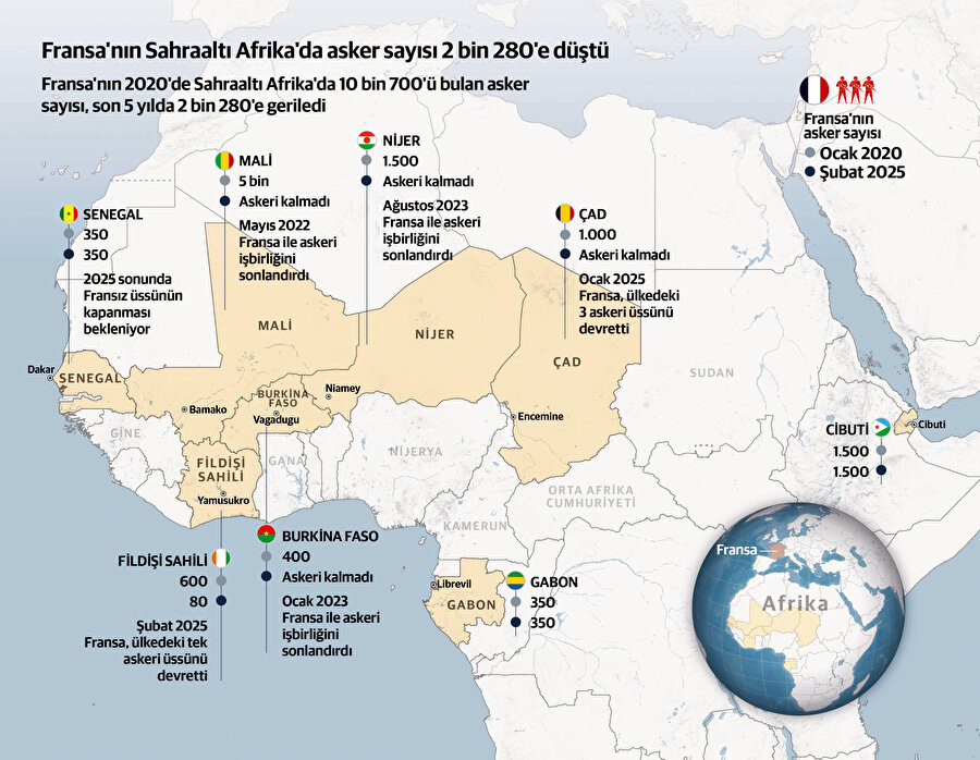 Afrika’nın Sahel kuşağındaki son ülke Senegal, 2025 Temmuz’unda 65 yıldır Fransa’ya hizmet eden Dakar'daki "Camp Geille" askeri üssü ile Uluslararası Blaise Diagne havalimanındaki hava üssünü teslim aldı. Ve böylece Sahel kuşağındaki Fransız askeri varlığı tamamen son bulmuş oldu.