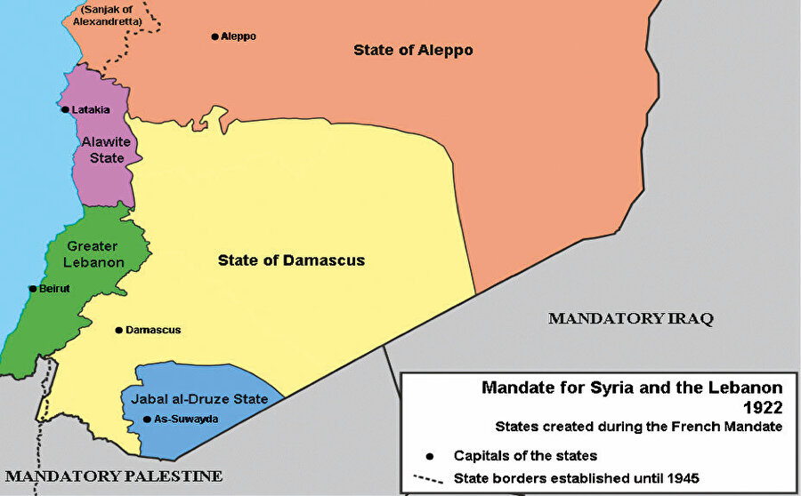 Osmanlı cihan harbinin sonlarına doğru Filistin cephesindeki hezimetle mukadder akıbetine doğru giderken Arap bölgeleri tamamen elden çıktı. İtilaf devletlerinin coğrafyamızı kendi aralarında paylaşma planı olan Sykes-Picot anlaşması, Suriye'yi Lübnan ile birlikte Fransızlara bıraktı. Peki, Fransızlar ne yaptı? 1922 yılında manda rejimi kuran Fransızlar ilk olarak bütünlüğü yok etmeyi hedefledi ve bunun için ülkeyi;