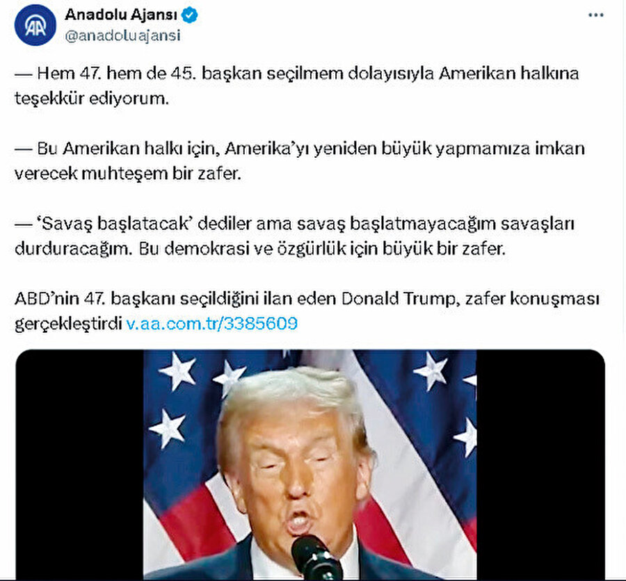 Geçen ay ABD başkanlık seçimini kazanarak 45. dönemden sonra 47. dönemde de Beyaz Ev'de (White House çünkü White Palace değil, artık şu aşağılık kompleksini bırakalım) ikamet edecek olan Donald Trump'ın Florida'da yaptığı zafer konuşmasında en dikkat çeken cümlesi neydi, hatırlayalım.