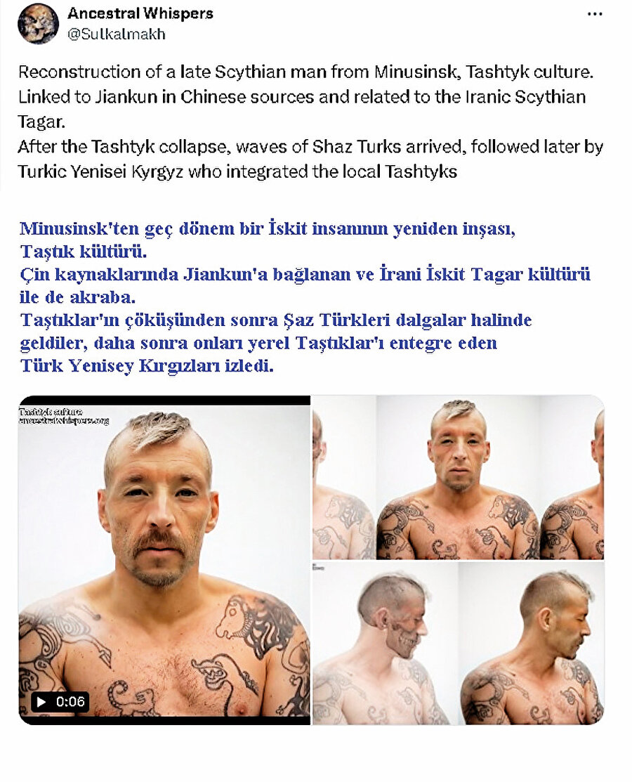 Bahsi geçen hesap, genetik çalışmalar üzerinden tarih yorumu yapmasıyla biliniyor ve 15 Ağustos günü bir paylaşım yaparak, eski Türklerin yaşadığı bölgede bulunan Taştık ve Tagar medeniyetlerinin Aryan / İrânî olduğunu duyurdu. O civardaki arkeolojik kazılarda bulunan bir adamın yüzü eldeki verilere göre yeniden modellenmiş ve buna göre bu adam Aryan / İrânî imiş. Oysa adamın yüzü bildiğimiz Türk yüzü, fakat mesele şurada ki adam açık tenli ve de renkli gözlü. Haçlı zihniyetine göre bütün sarışın ve renkli gözlüler elbette Avrupalı olacağı için daha en baştan adamın Türk olamayacağına karar verilmiş bile.