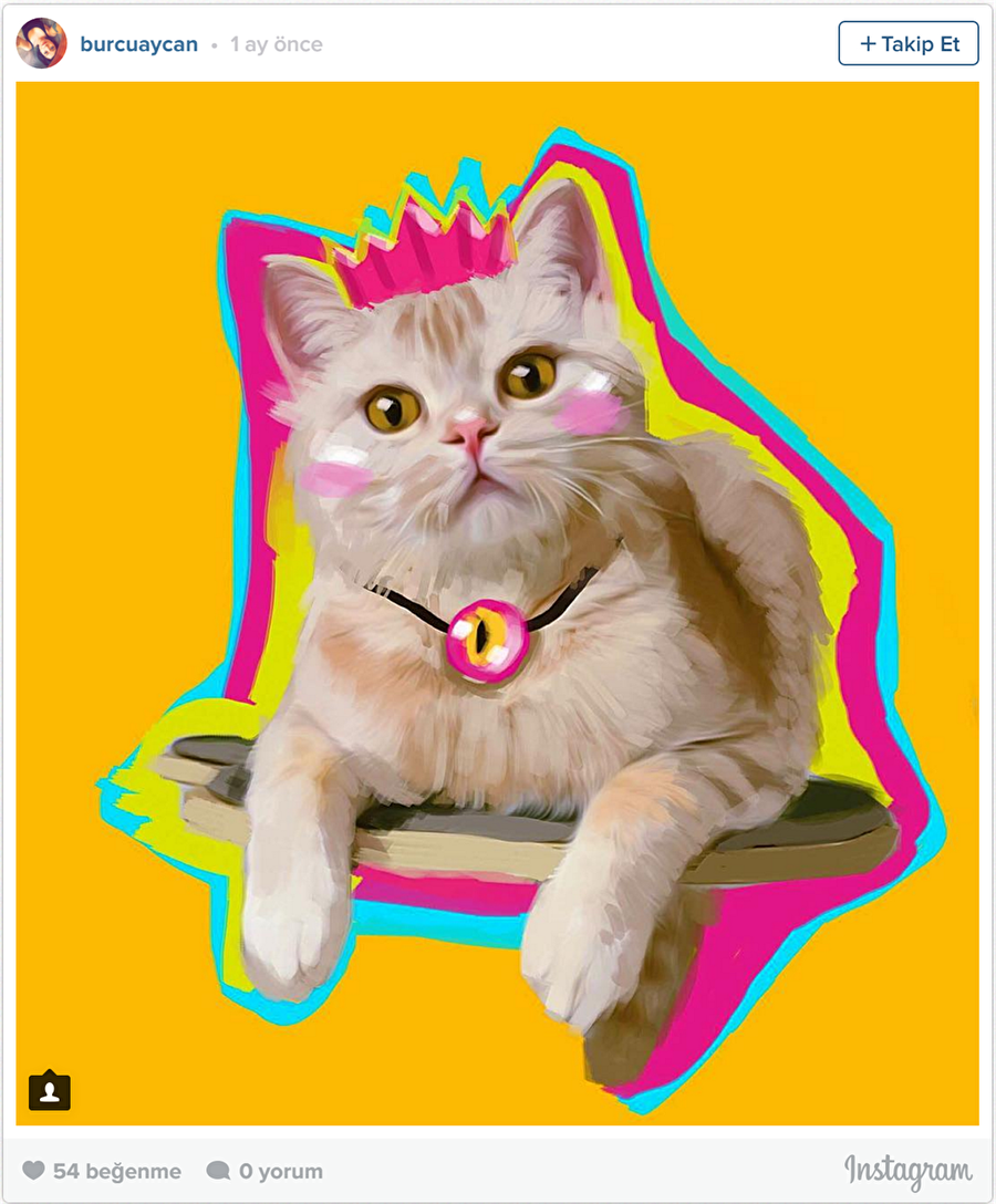Instagram' da ünlü olan kedilerin illüstrasyonlarını kendi tarzıyla ortaya koyan Instagram kullanıcısı Burcu Aycan, kediseverliğini resme dökmüş ve kedilerin illüstrasyonlarını kendi tarzıyla ortaya koymuş.