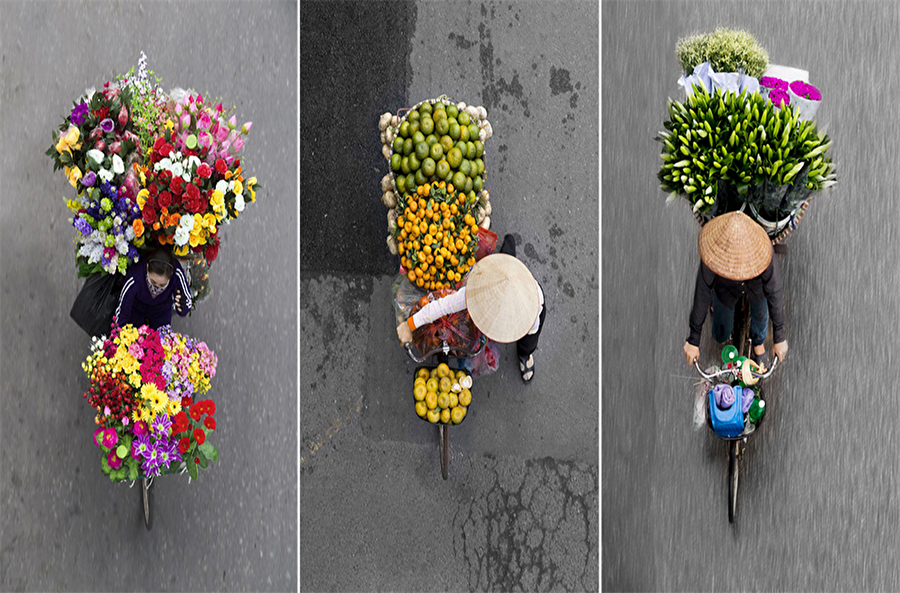 Fotoğrafçı Loes Heerink Vietnam'ın Hanoi şehrinde kalırken, her gün caddelerde dolaşan sokak satıcılarını ve onların bisikletlerine koyduğu ürünleri havadan fotoğraflayarak mükemmel görüntüler yakaladı. Sokak satıcılarının bisikletlerine muhteşem bir simetri ve güzellikle yerleştirdiği sebze-meyveler ya da çiçekler ilginç ve bir o kadar eşsiz görüntüler ortaya çıkarıyor.