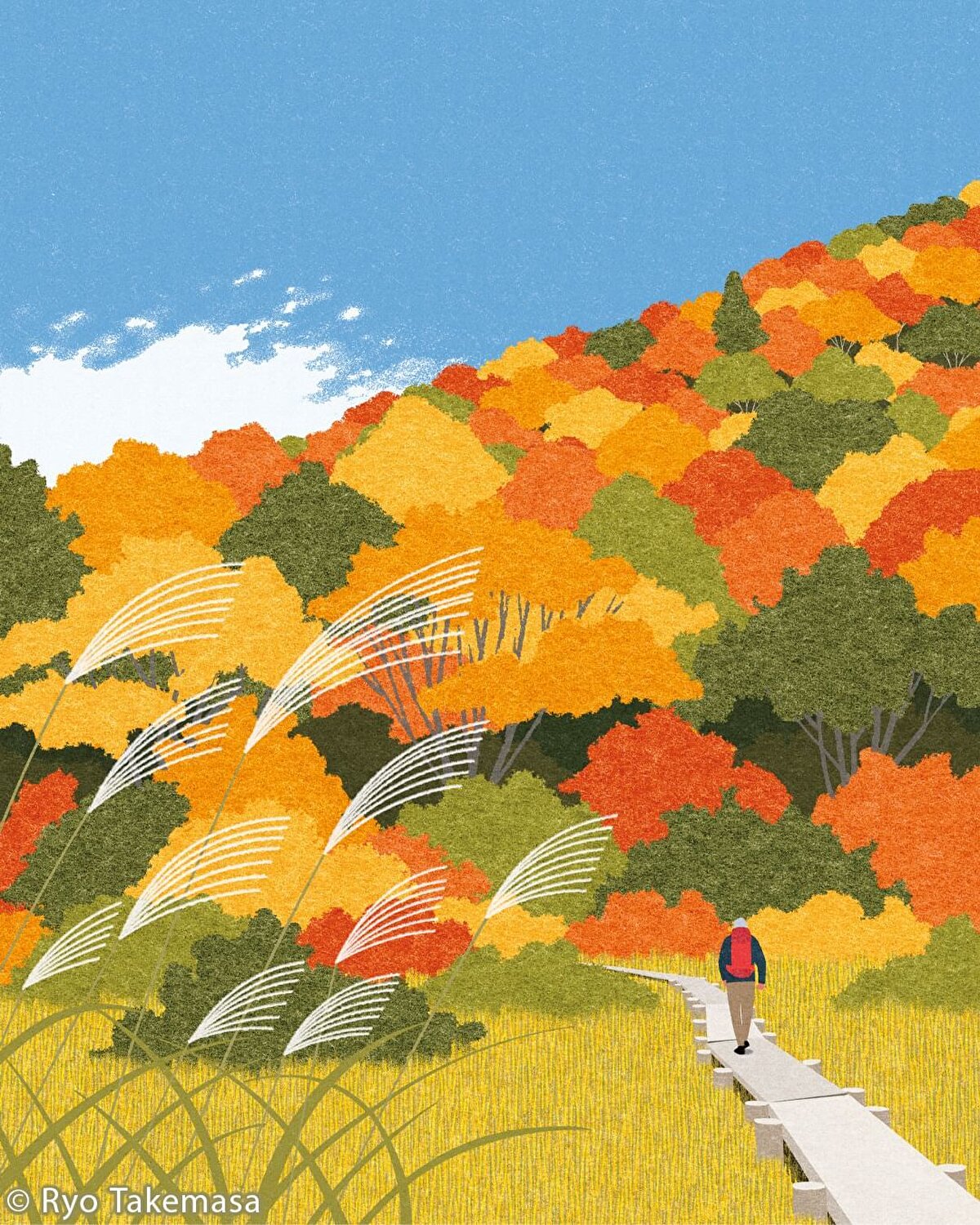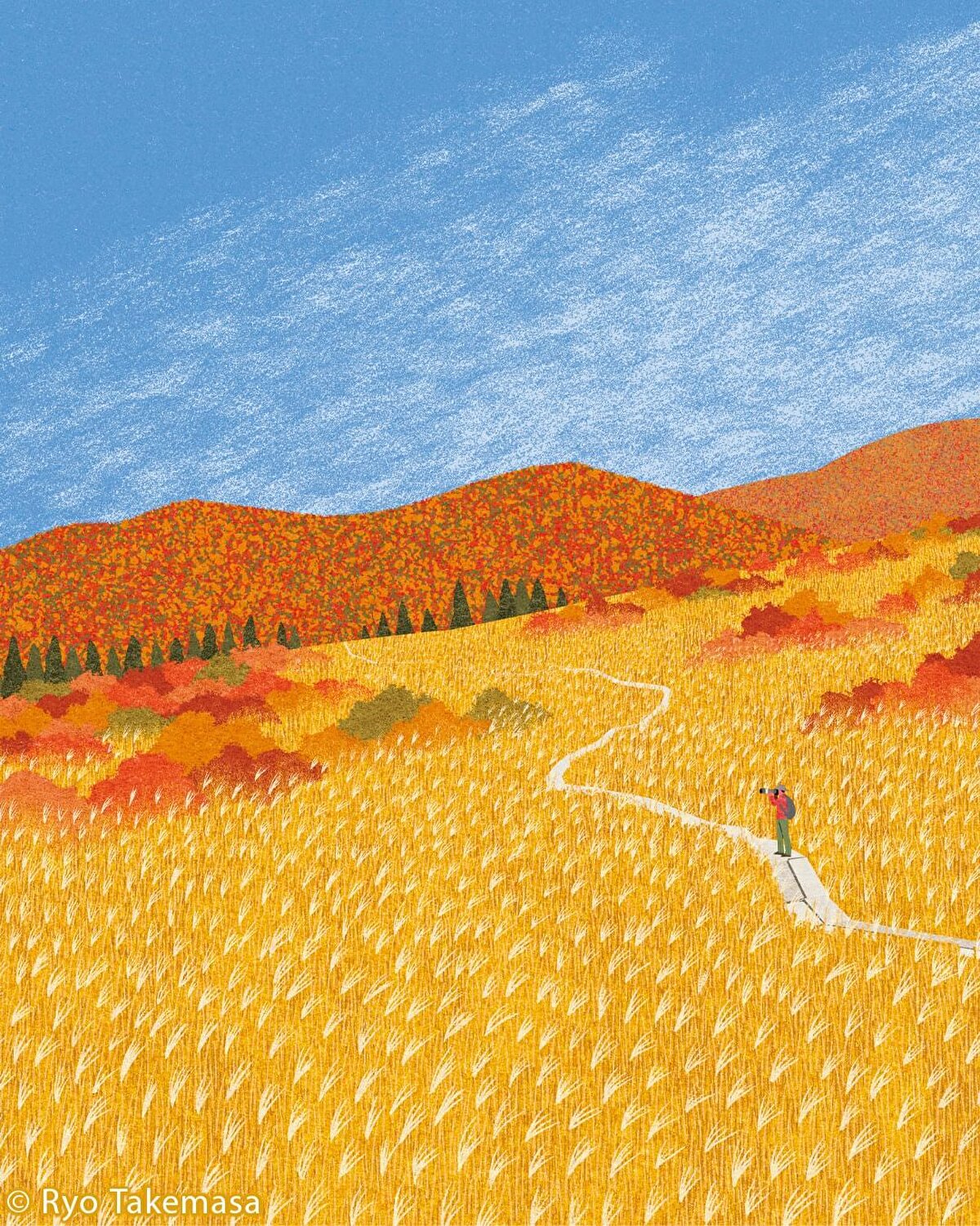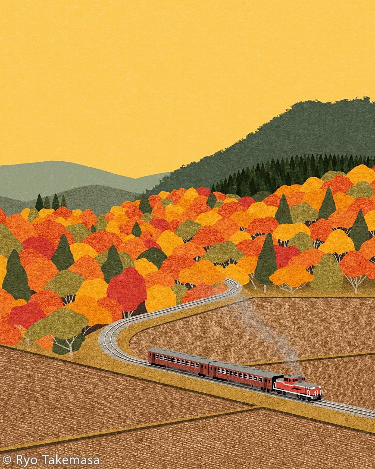 Japon illüstratör Ryo Takemasa, yol ve sonbahar temasını içeren etkileyici çalışmaları ile bizleri mevsim atmosferini keşfetmeye davet ediyor. Minimalist dokular ve doğanın ritmini hissettiren bu çalışmalar, hem doğanın güzelliklerine hem de huzurlu bir yolculuğa atıfta bulunuyor.
