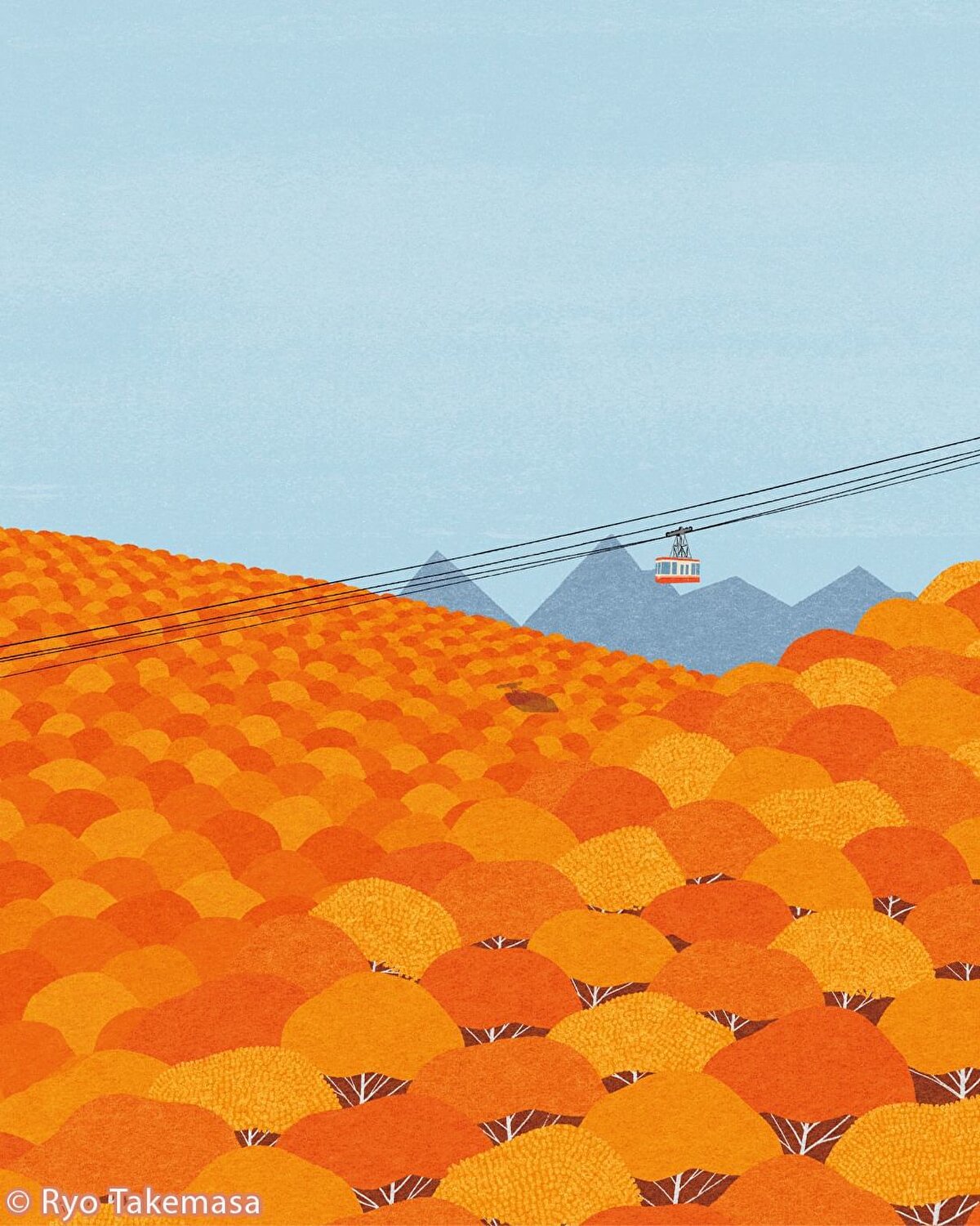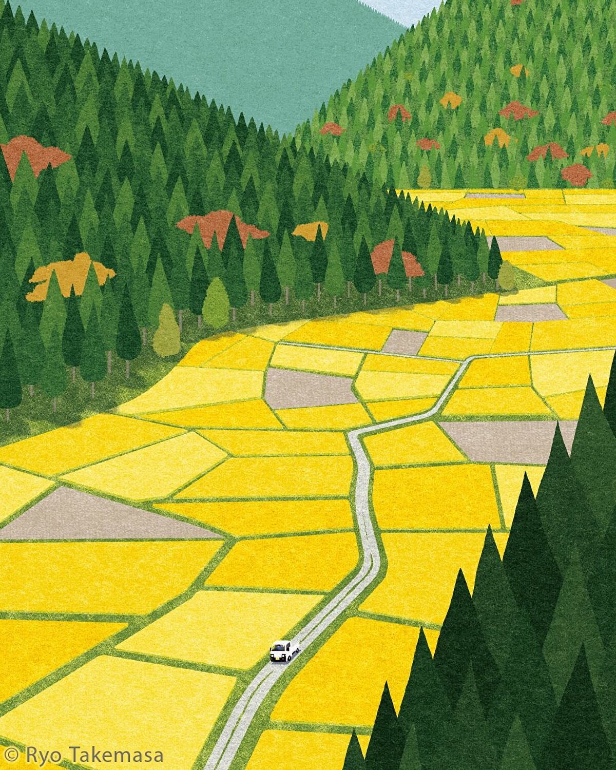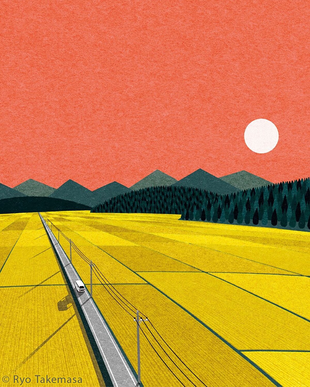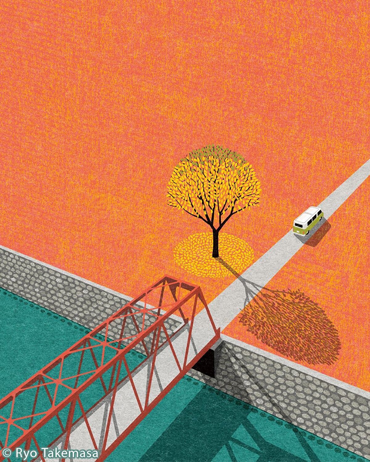 Japanese illustrator Ryo Takemasa invites you to discover the atmosphere of the season with his impressive works on the theme of road and autumn. Minimalist textures and the rhythm of nature, these works refer to both the beauties of nature and a peaceful journey.