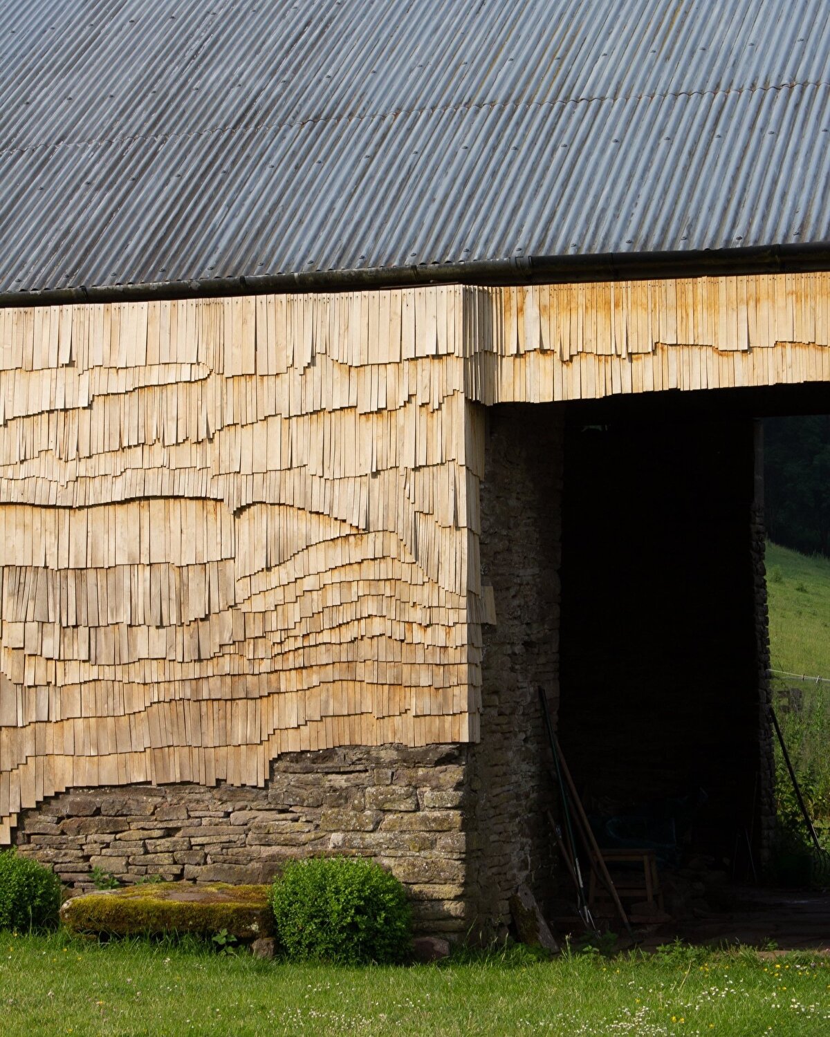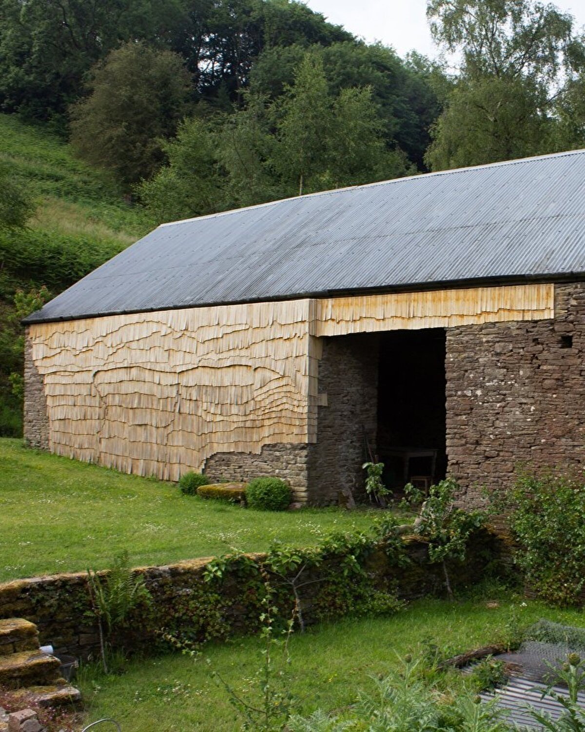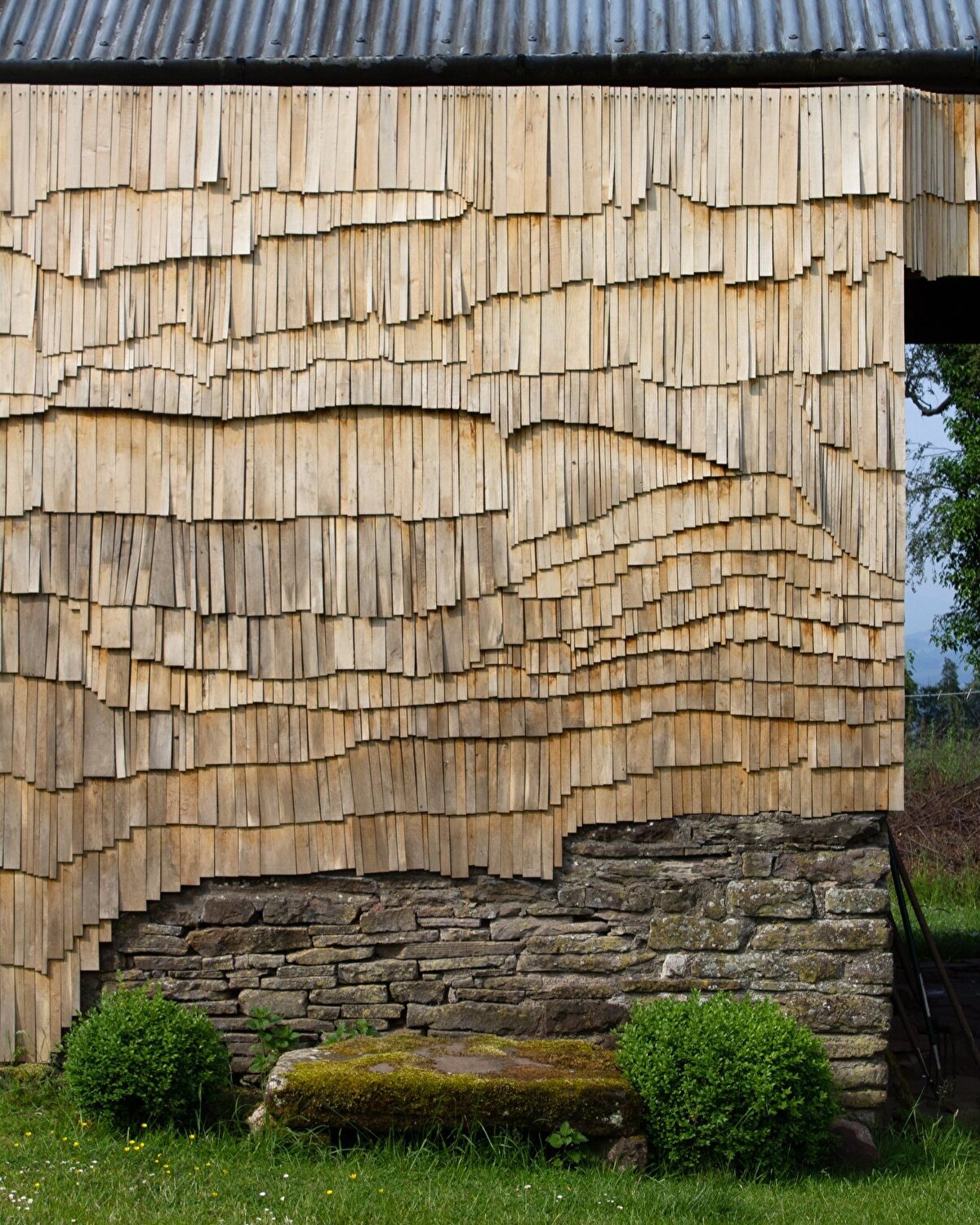 Abergavenny, Monmouthshire'de yer alan yapı, el değmemiş bir doğanın içerisinde konumlanıyor. Cephe, yapının bitişiğindeki ormanda yer alan İngiliz meşesi kullanılarak yenileniyor. Farklı bir teknikle ahşabı işleyen Stutchbury, sıra dışı bir yerleşim ve tasarım oluşturuyor.