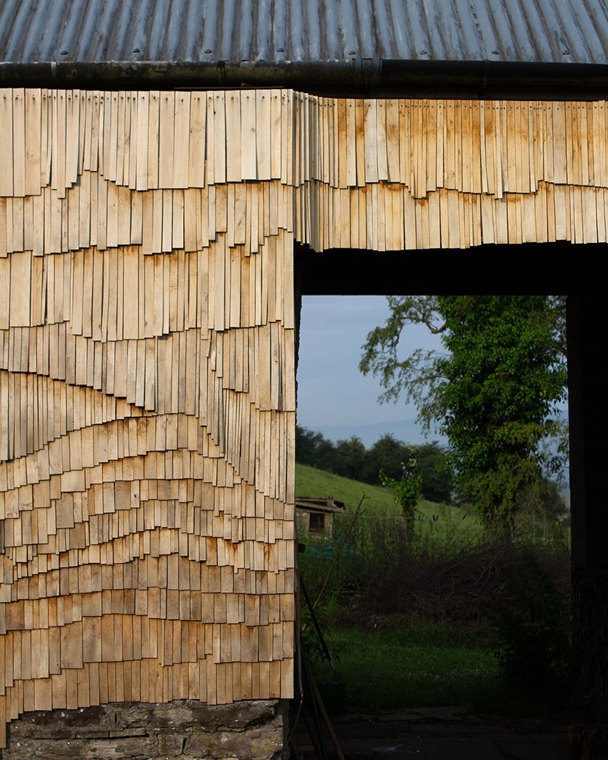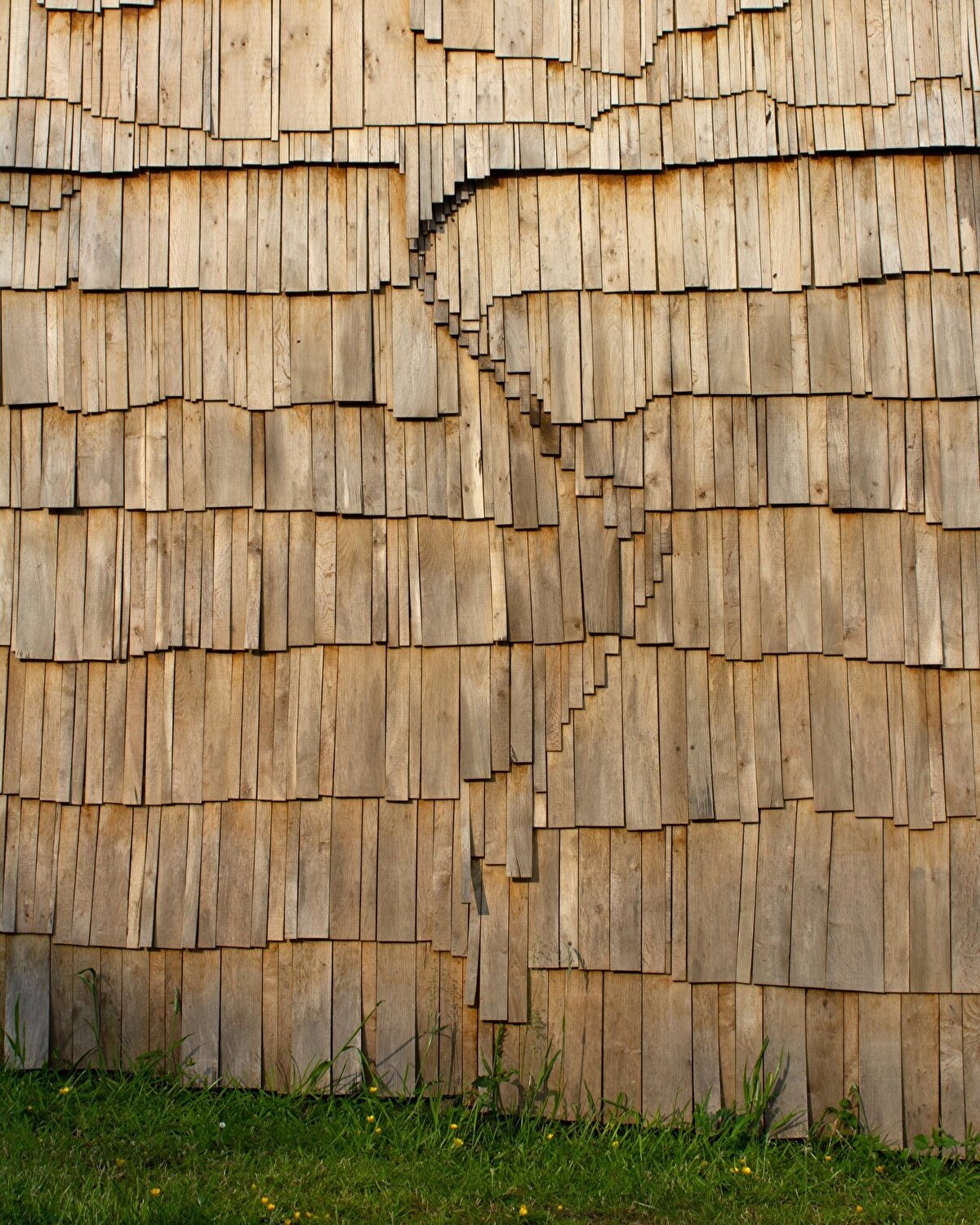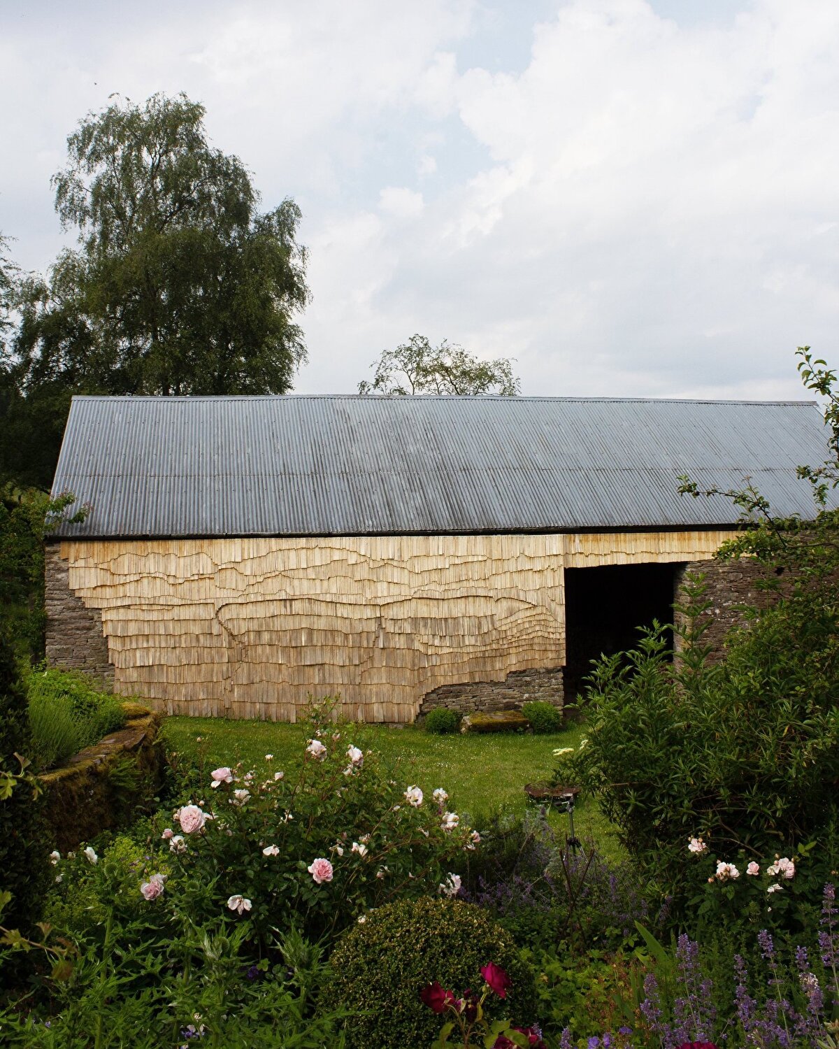 Abergavenny, Monmouthshire'de yer alan yapı, el değmemiş bir doğanın içerisinde konumlanıyor. Cephe, yapının bitişiğindeki ormanda yer alan İngiliz meşesi kullanılarak yenileniyor. Farklı bir teknikle ahşabı işleyen Stutchbury, sıra dışı bir yerleşim ve tasarım oluşturuyor.