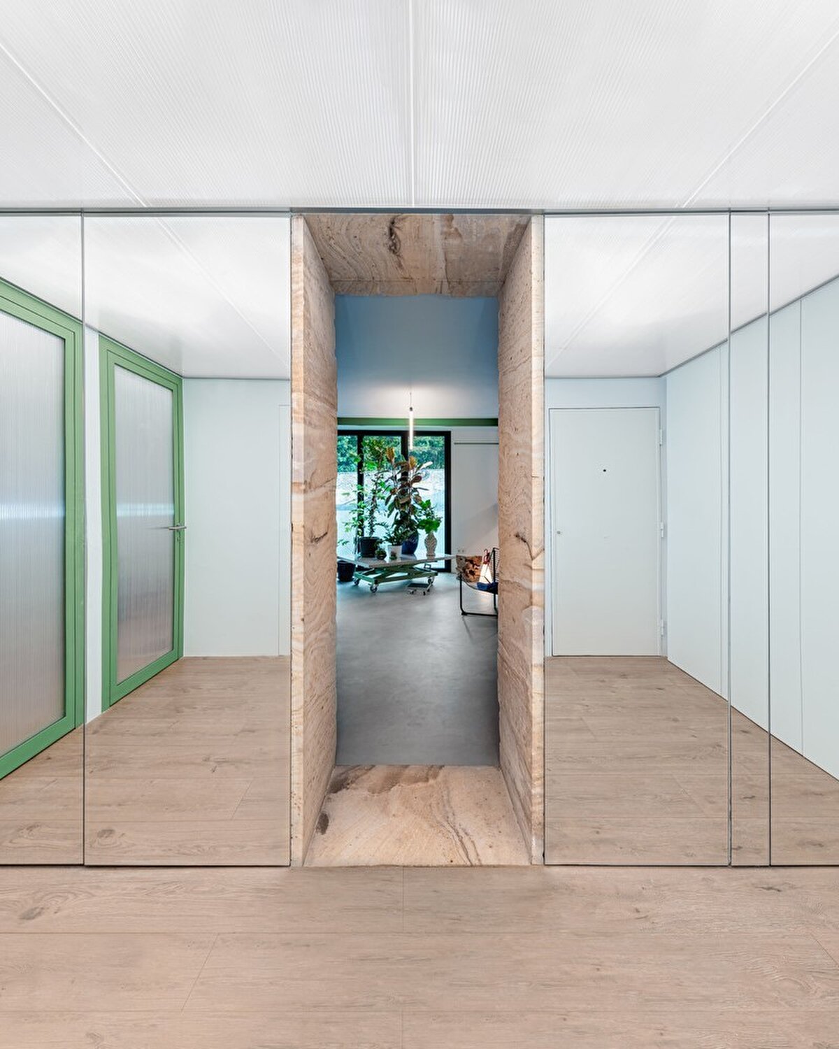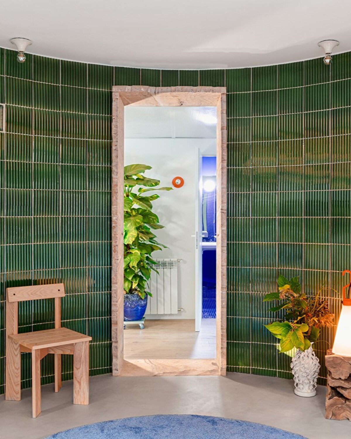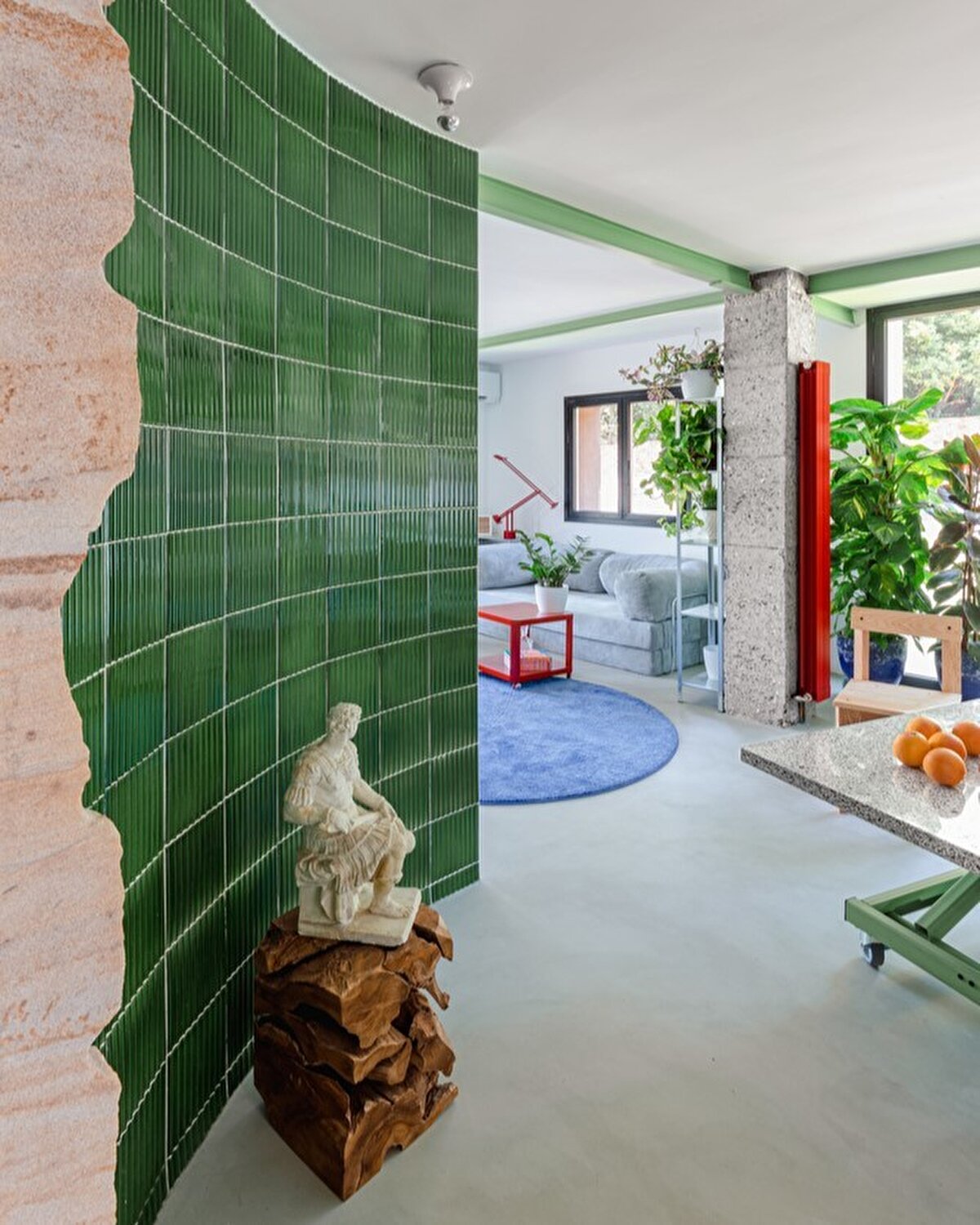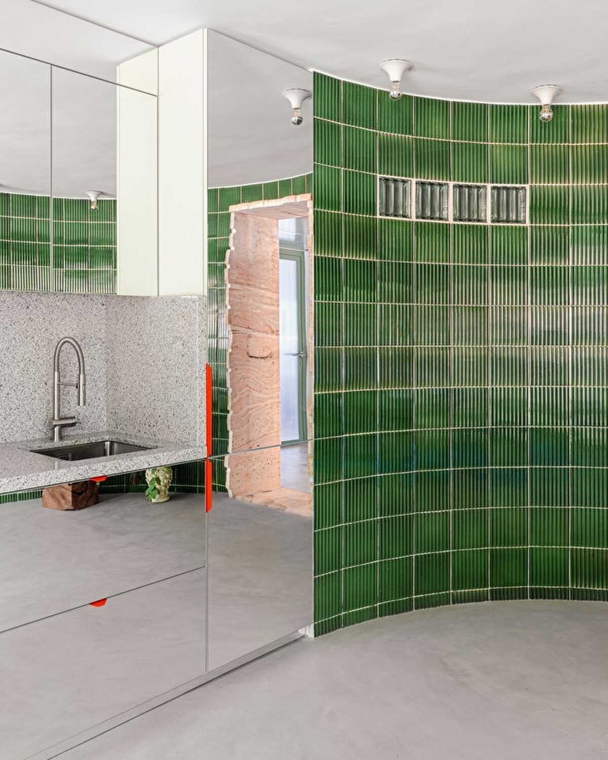 Projenin merkezinde, camlı seramikten yapılmış kavisli bir duvar yer alıyor. Bu duvar hem depolama alanlarını entegre ediyor hem de sosyal etkileşimleri teşvik eden bir odak noktası oluşturuyor. Duvarın bir köşesinde, aynalı bir vitrin ev aletlerini gizlerken, San Sebastián'dan gelen yerel kumtaşı manzaranın jeolojik katmanlarını yansıtıyor.