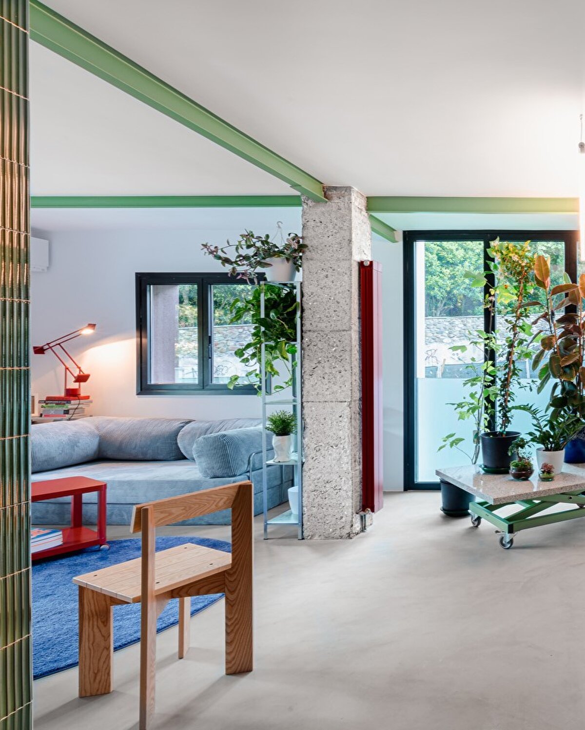 Mekân, yerel ve geri dönüştürülmüş malzemelerle yapılan hareketli mobilyalarla tamamlanıyor. Granitten yükseltilebilir bir ada, ağaç köklerinden yapılmış tabureler ve sulama sistemiyle desteklenen mobil bitki örtüsü hem işlevselliği artırıyor hem de çevreyle bağlantıyı güçlendiriyor.
