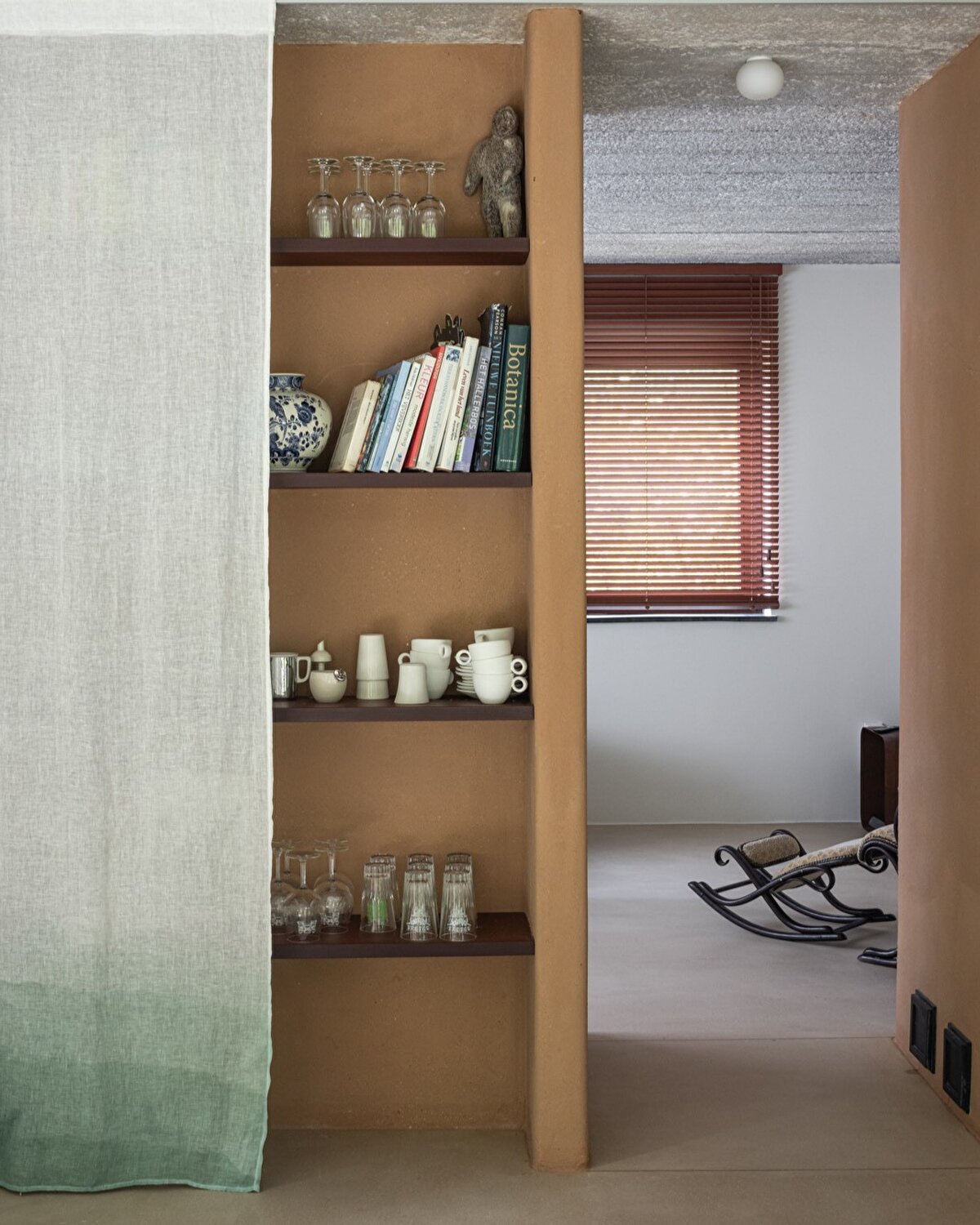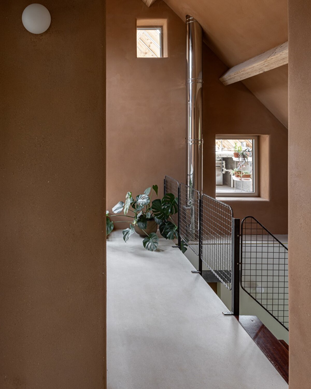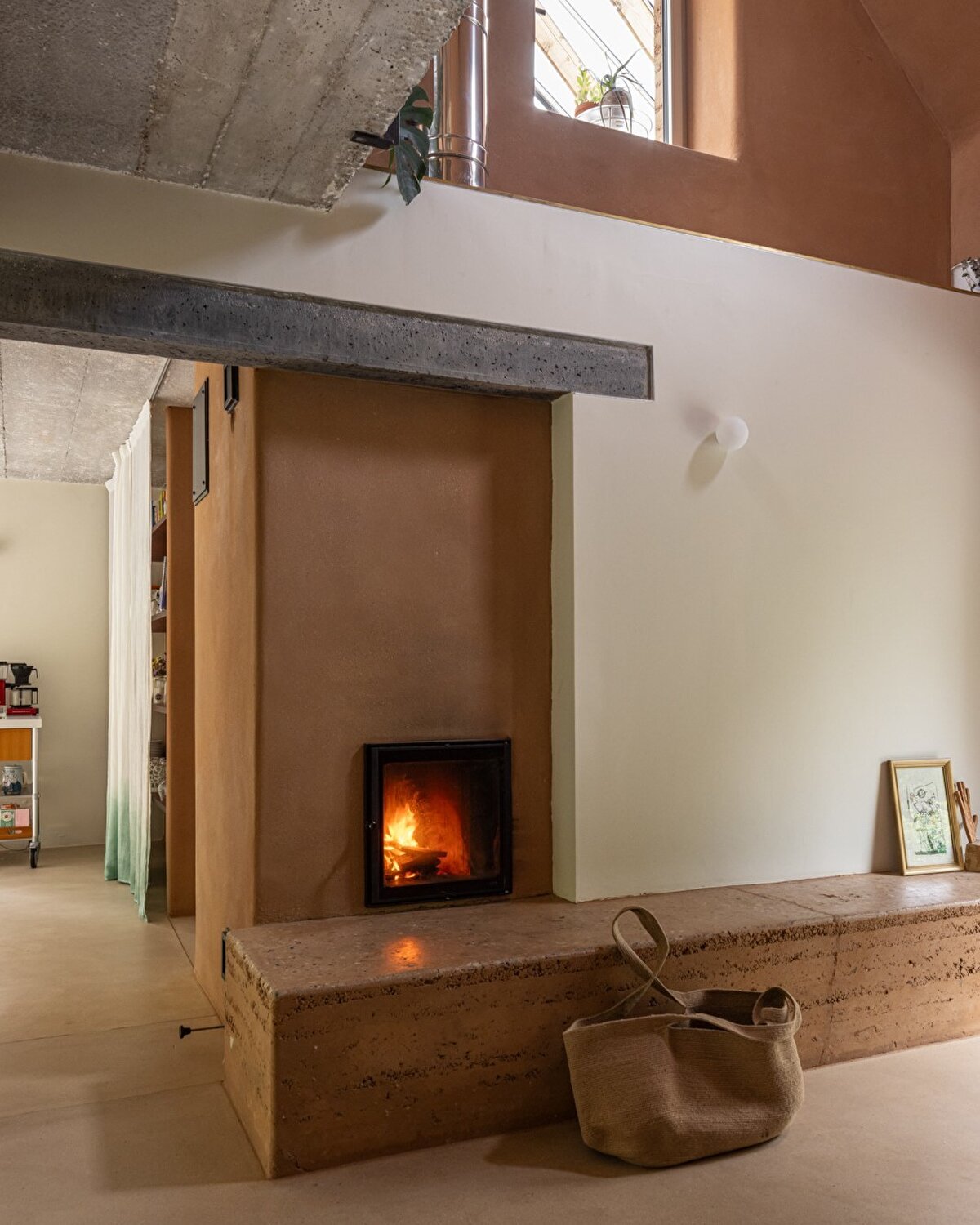 Mevcut koridor ve ofis bölümü, kış bahçesine açılan bir oturma odasına dönüştürülürken, evin geniş giriş holü ise sobanın yanında yer alan yeni bir oturma alanına evriliyor. Bu toprak sobası, eski yakıt kazanının yerini alarak merkezi ısıtma sağlıyor. Garaj, giriş holüne dönüştürülürken, mekânın genel atmosferine uyumlu bir şekilde beyaz duvarlar yerini kırmızı toprak sıvaya bırakıyor.