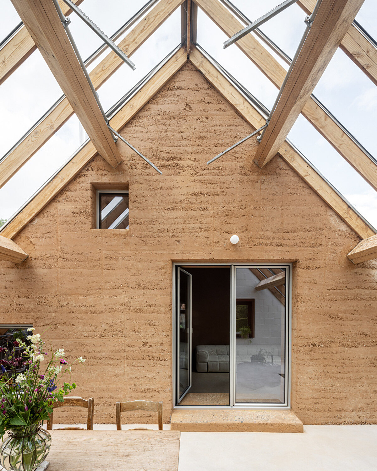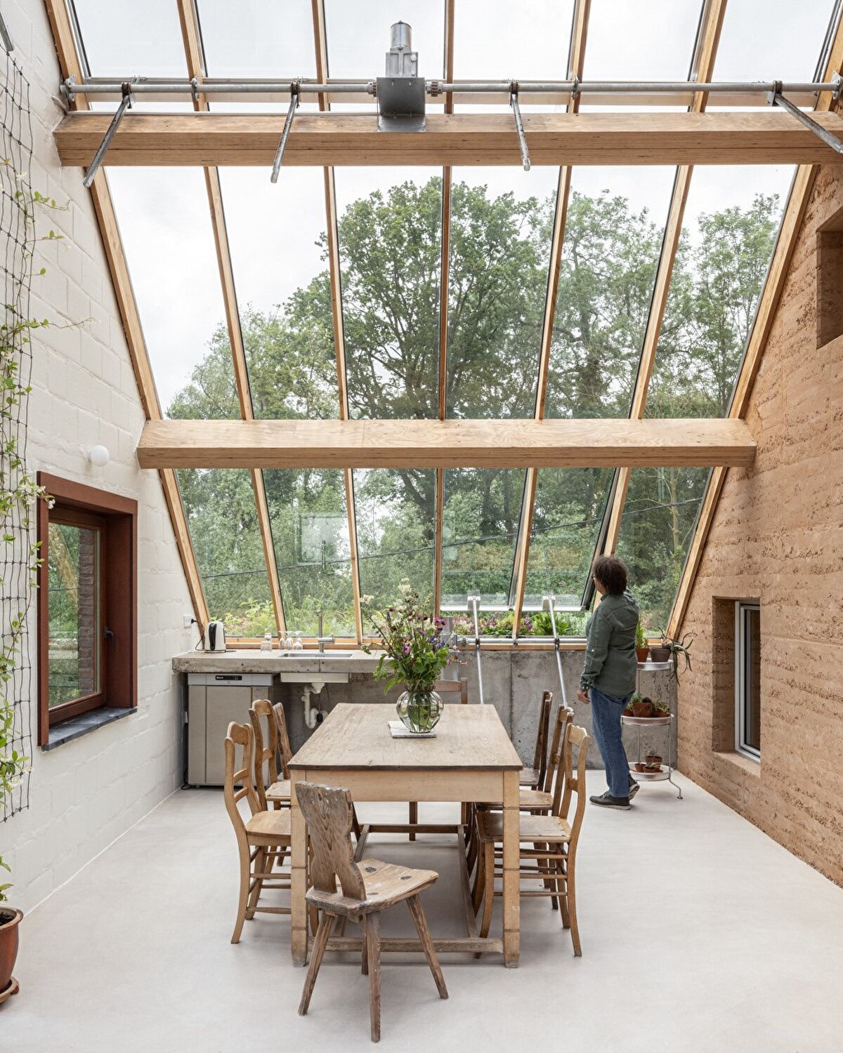 Mimarlar, yenileme sürecine önce evin mevcut düzenini ve çevresiyle olan bağlantısını eleştirel bir gözle analiz ederek başlıyor. Geleneksel yapıyı korumak yerine, çiftlik evini radikal bir şekilde dönüştürmeyi seçiyorlar. Öncelikleri, evi daha kompakt hale getirmek oluyor. Çiftin kızlarına ait eski yatak odaları, geniş bir kış bahçesine dönüştürülüyor. Bu kış bahçesi, etkileyici bir kütük duvarla çevrelenmiş durumda. Duvarın doğal eylemsizliği sayesinde, alan pasif bir ısı tamponu olarak çalışıyor; kışın güneşin etkisiyle ısınan duvar, ısıyı iç mekâna aktarırken yaz aylarında ise tam tersi bir etki sağlıyor.