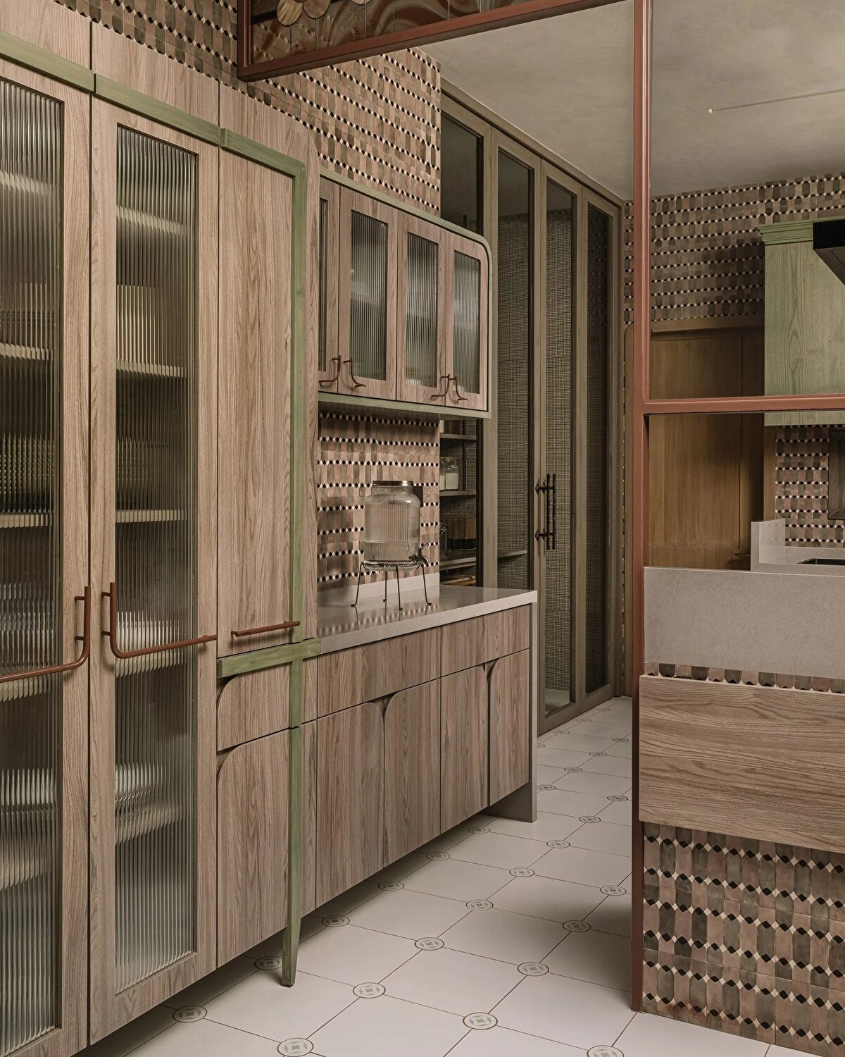Yaşam alanında, mermer kaplı cam bir ekranın ardında zarif mobilyalar ve sanatsal detaylar bulunuyor. Rajasthan'dan Batı Bengal'e kadar farklı bölgelerden gelen ustaların işçiliği, mobilyalara geleneksel zanaatı yansıtıyor. Flütlü cam dolaplar ve kavisli kenarlarıyla dikkat çeken mutfak, bu zengin estetiği sürdürüyor.