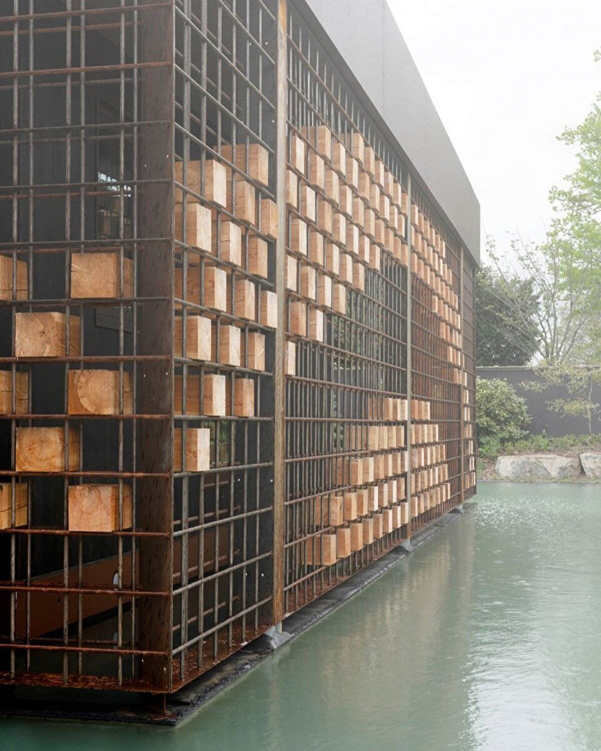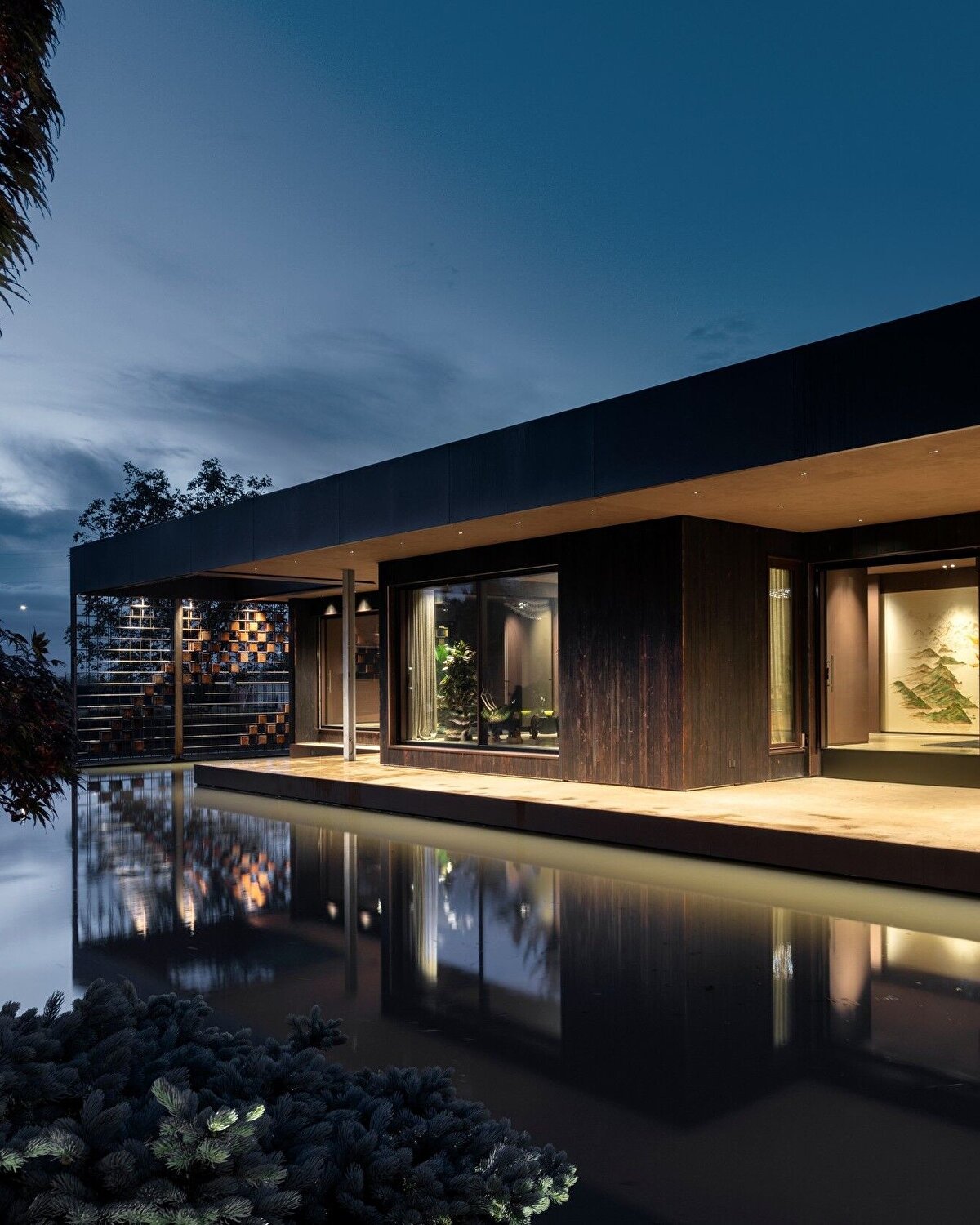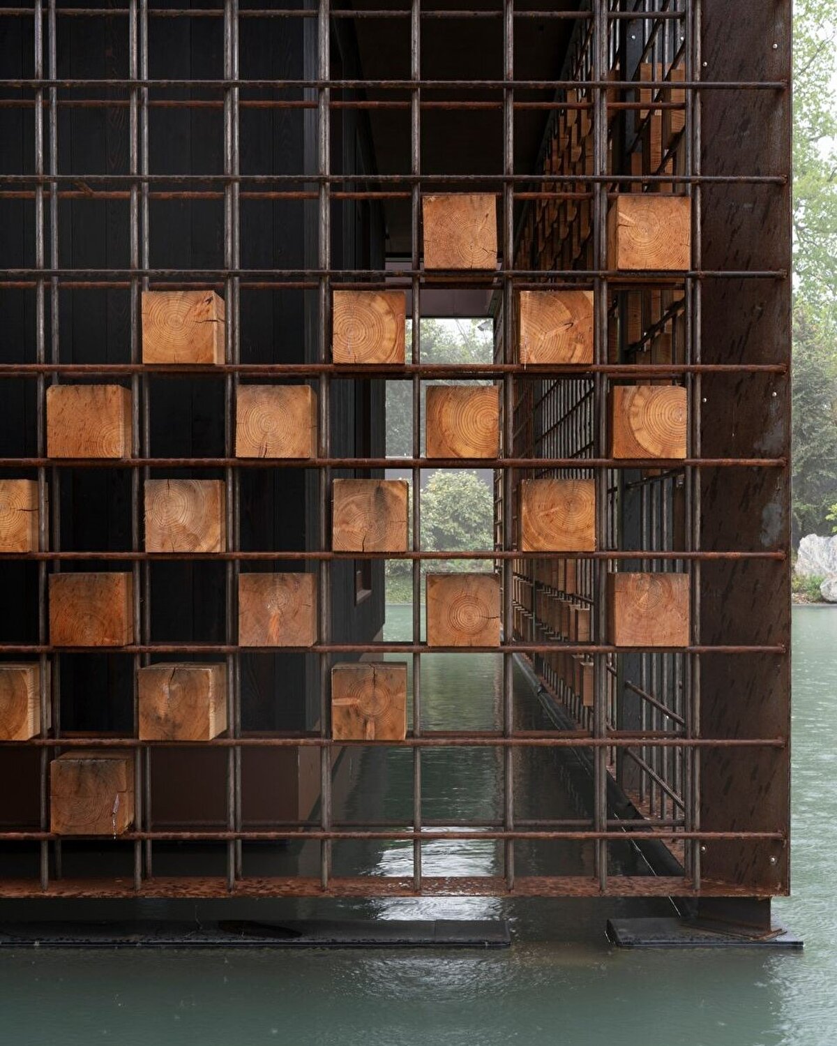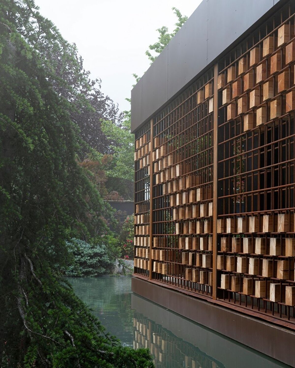 2000 m²'lik bir misafirhane alanına sahip olan Pavillon, Damilano Stüdyo tarafından tasarlanıyor ve bulunduğu alan yüzeyi sanayi bölgesinde konumlanıyor. Yeni inşa edilen 320 m²'lik yapı, 580 m²'lik bir su kütlesiyle çevrelenmiş olup, buraya asma köprüyle ulaşılabiliyor. Bu proje, müşterinin hem misafirlerini ağırlamak hem de iş yerine yakın bir huzur alanı oluşturma talebine cevap veriyor. Yapı, metal çerçeve ve ahşap dolgularla tasarlanıyor, mikro çimento zeminlerle kaplanmış , güçlendirilmiş beton bir taban üzerine oturtuluyor.