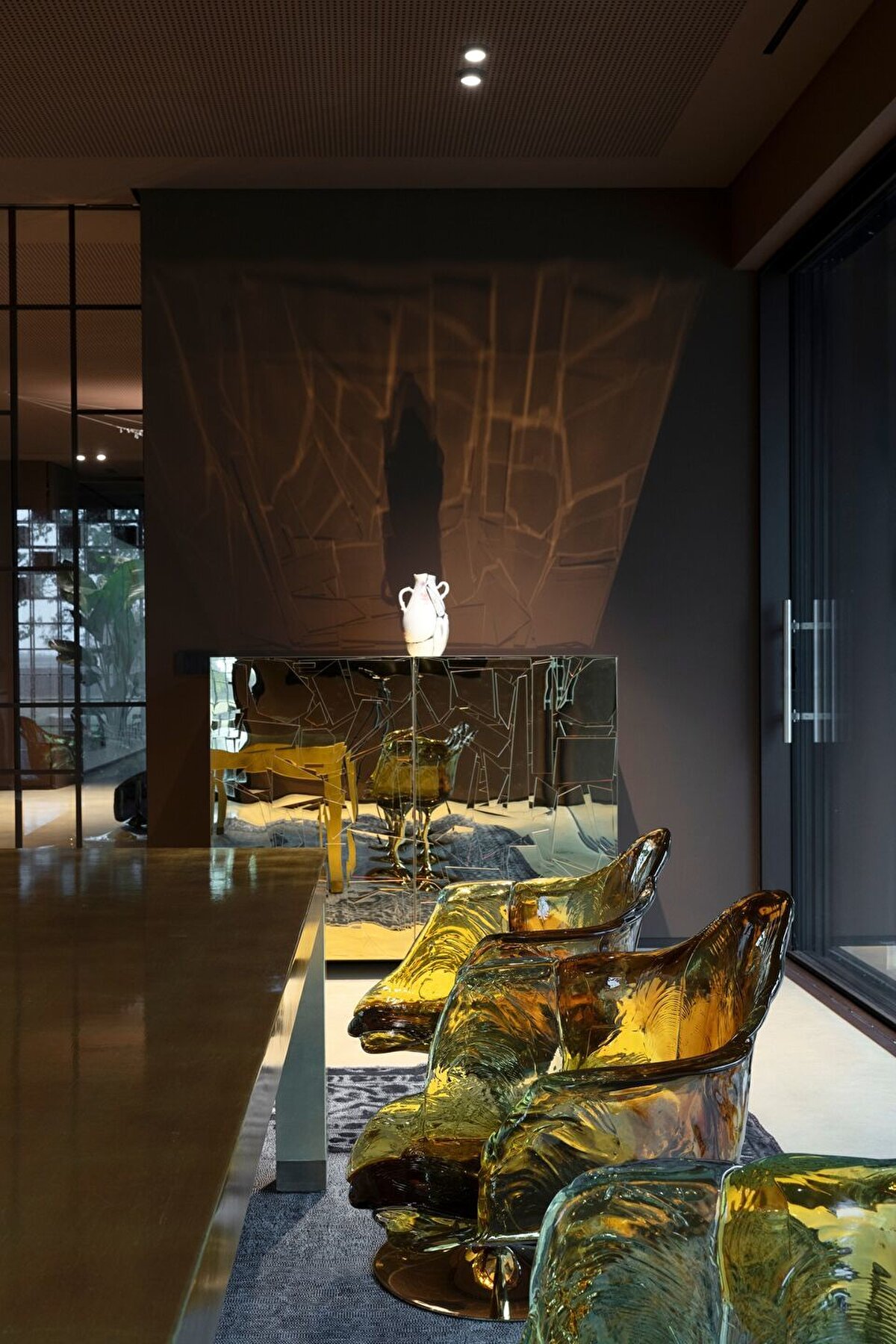 Misafirhaneye, mikro çimento kaplı bir rampa ile giriş sağlanıyor. Geniş oturma alanından yemek odasına, ardından yatak odasına geçiş yapılıyor. Cam duvarlar, her mevsim dış dünyayla etkileşimi sürdürüyor. Oturma alanında Edra'nın konforlu Pack kanepesi öne çıkıyor. Yemek alanında ise Edra için tasarlanan Foggini sandalyeler ve altın varaklı Dilmos Milano masa dikkat çekiyor. Büyük pencereler, pavyonu çevreleyen suya huzurlu bir bakış açısı sunuyor.