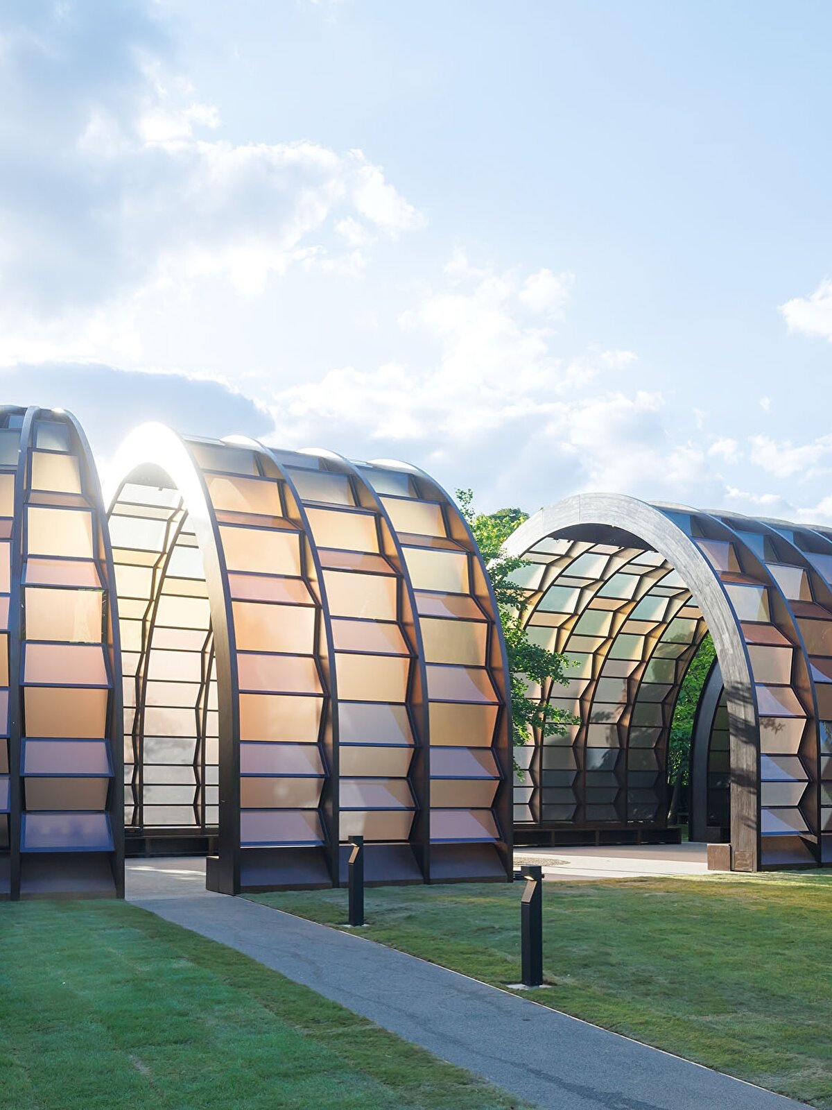 Marina Tabassum'un @marinatabassum tasarladığı “A Capsule in Time" başlıklı yapı, Bengal Deltası'nın geçici ve uyarlanabilir mimarisinden esinleniyor. Dört ahşap kapsülden oluşan yarı saydam pavyon, gün ışığını süzerek iç mekânda değişken bir atmosfer oluşturuyor. @serpentineuk