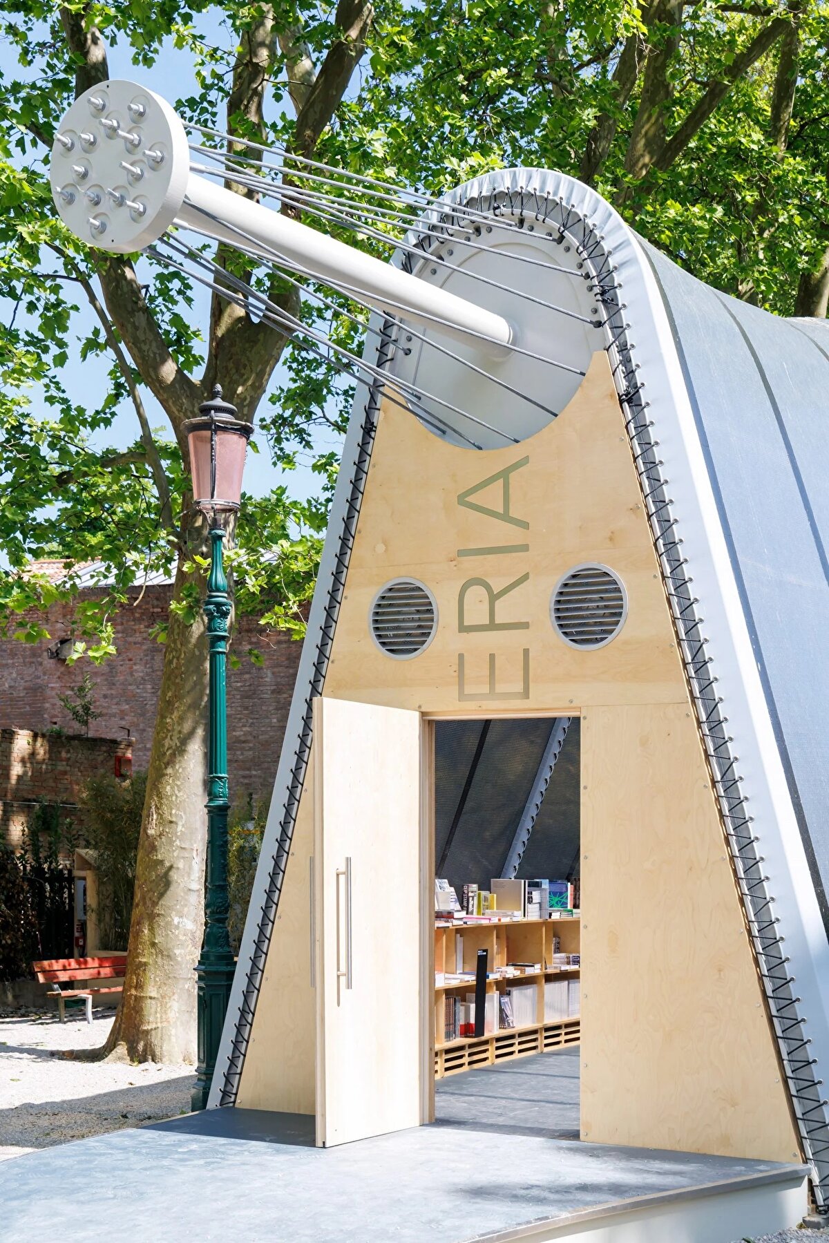 The design draws inspiration from French engineer Robert Le Ricolais' research on tension and compression structures. Developed in line with the principles of structural lightness, modularity, and reusability, La Libreria is designed to be rebuilt as a temporary library in different geographical locations. Currently located in the Giardini section of the Biennale, near the bookshop designed by James Stirling, the structure offers a conceptual proposal on temporariness, portability, and the redefining of public space in architecture.